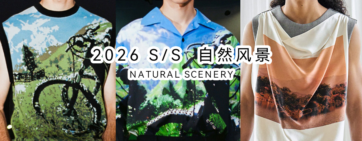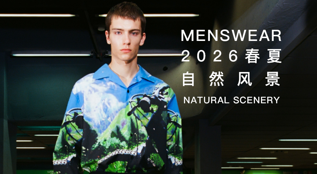 自然风景类图案在男装中利用先进数码印花技术被呈现,高清的山脉、森林、海洋、沙漠或局部特写,营造身临其境的壮阔感或静谧氛围,带有探索和发现的以为,传达可持续和保护