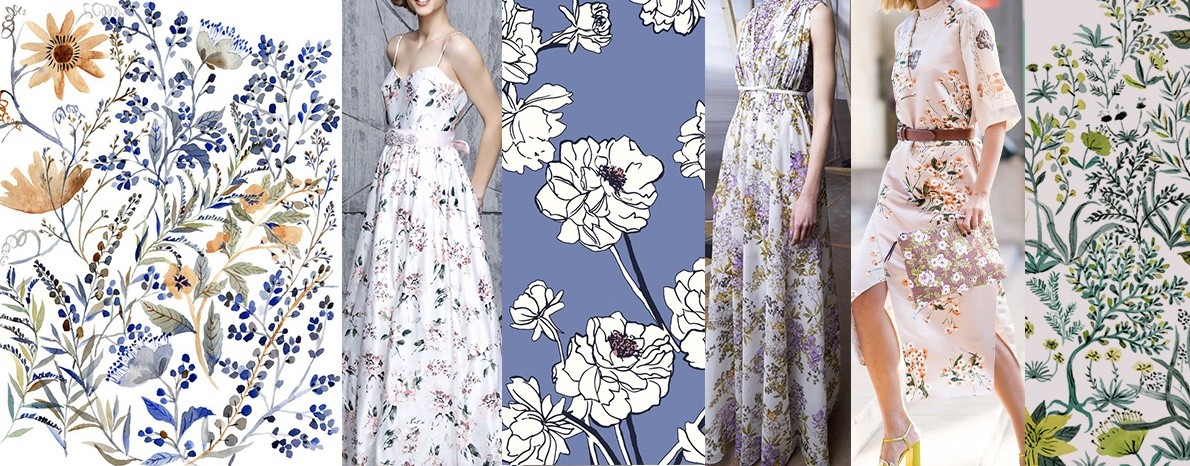 花卉印花除了演绎感性深沉的仲夏夜花园风格,出现了正好与它相对的浅底色花卉。设计们在白色的背景上,搭配各种手绘的花卉植物,设计出清新自然风格的印花图案。华亿平台的整体