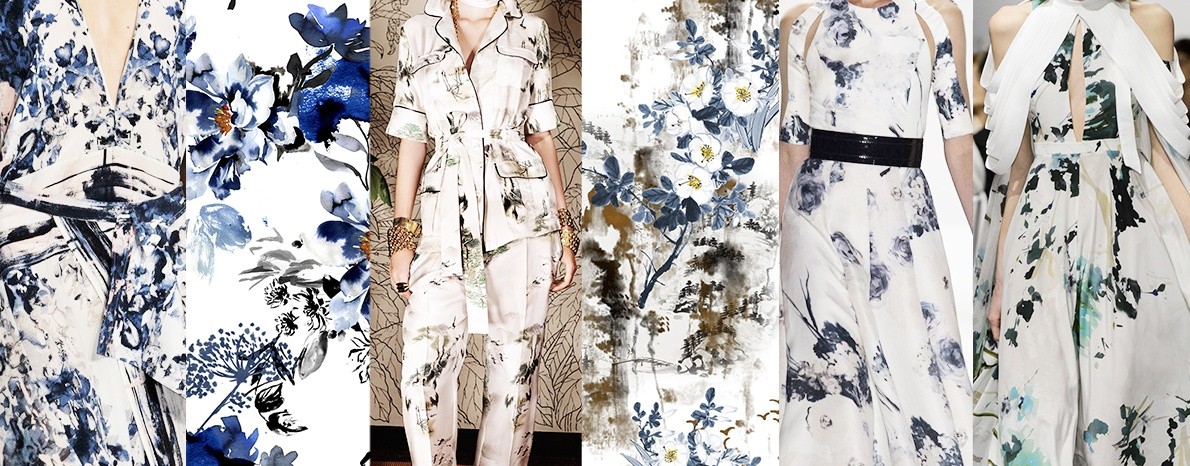 水墨风图案的流行来源于东方艺术在国际时装潮流上的影响,水墨风花卉散发着优柔的亚洲风情,以黑白毛笔刷打造如水彩阴影的效果。2018/19秋冬,浅蓝色在中国依然流行