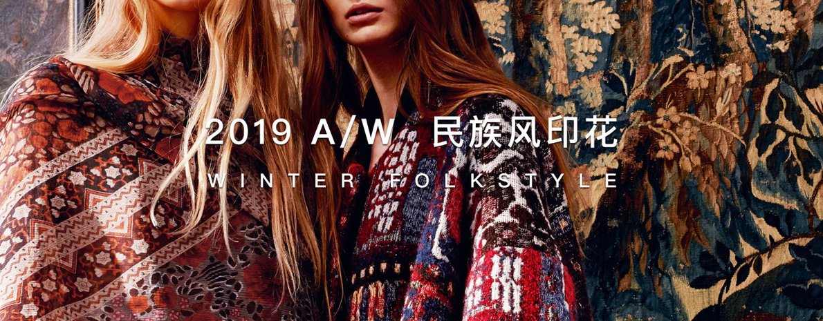 2019花色变暗了,黑色的背景创造了一种浪漫的印花风格,连衣裙主打民族风印花,民族风印花与山野基调相结合,在秋冬季愈显强烈,装饰细节与含蓄底色相得益彰。装饰地毯