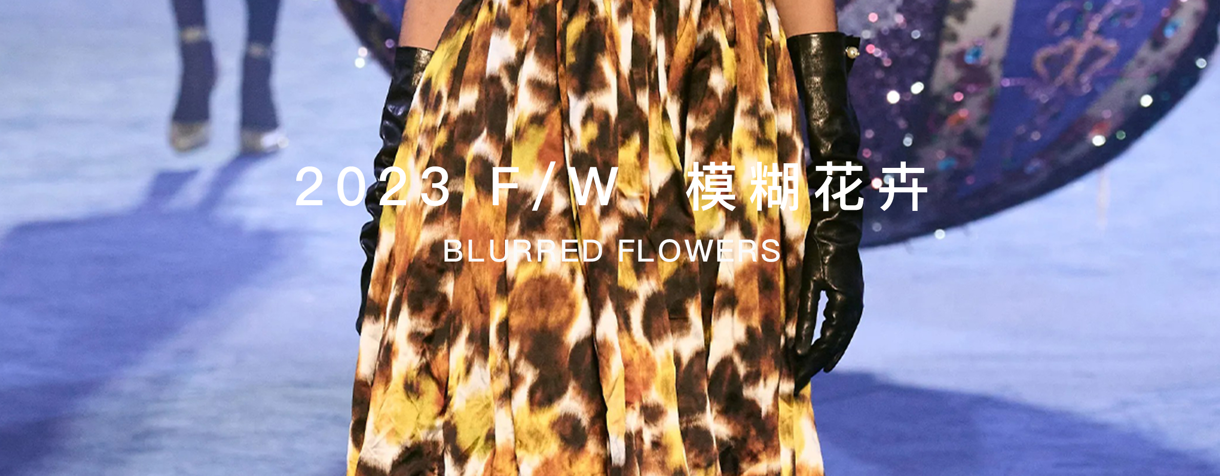 模糊效果捕捉动态花卉成为2024年的印花趋势,花朵通过拉伸、扭曲和晕染等处理产生的视觉效果,以一种更抽象的形式让花朵成为图案设计的新元素,尤其适合春夏的连衣裙和