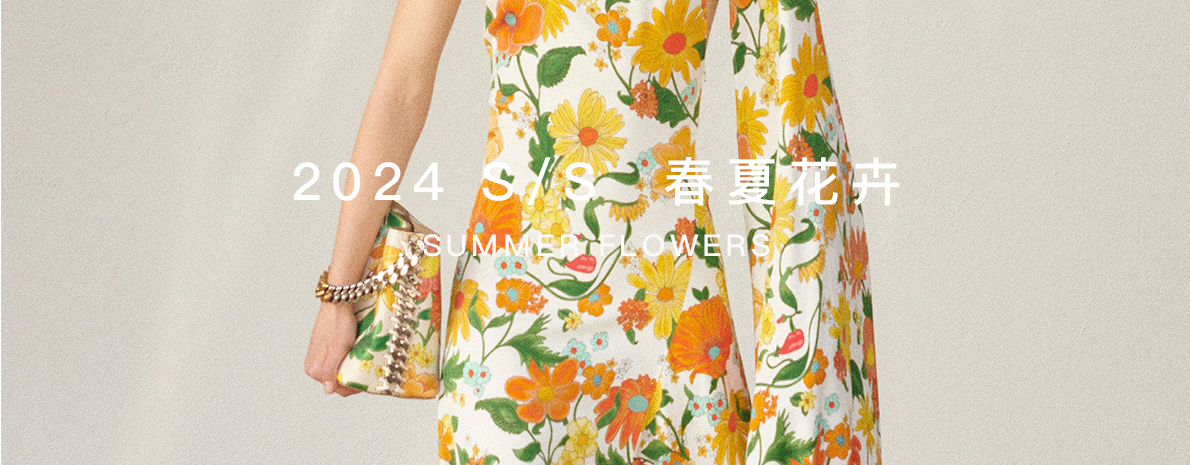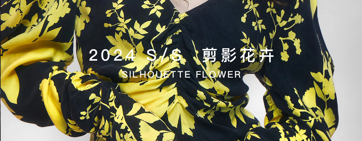 真丝定位主题,随着精致真丝风格兴起而愈发受到青睐,自然、风景、花卉等主题的定位图案在女装真丝衬衫、外套类产品中大量使用。真丝单品独特的光泽感,呈现在此之上的花卉