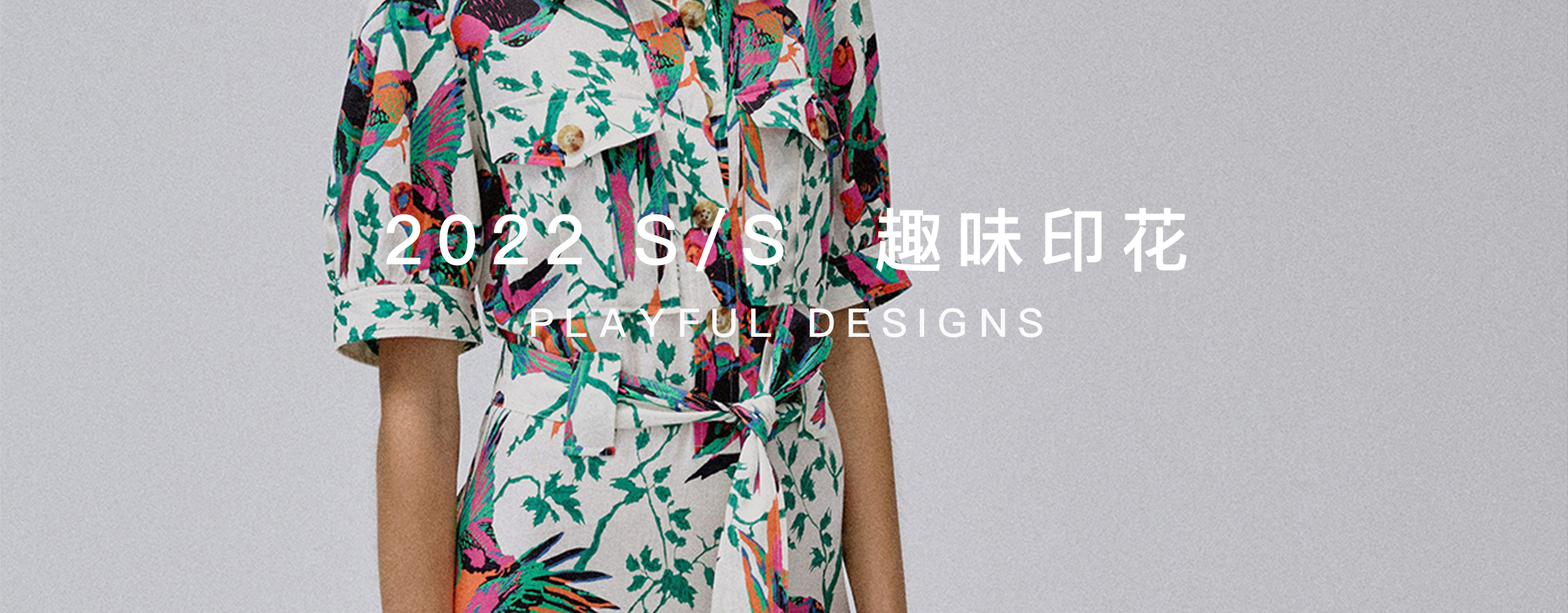 回到花卉元素,2022春夏除了散落的小碎花,来源于家纺上的大体积花卉重新回归我们的视野,多彩亮色系的底色可以多多尝试。这种柔和的手绘花卉适合于真丝等柔软的面料结