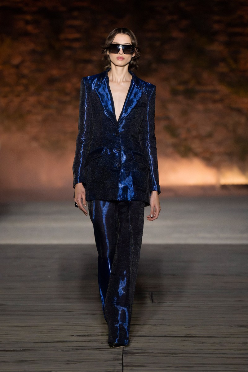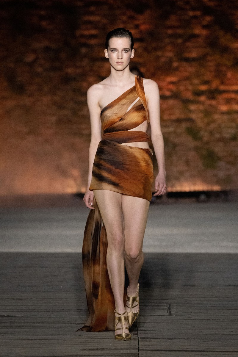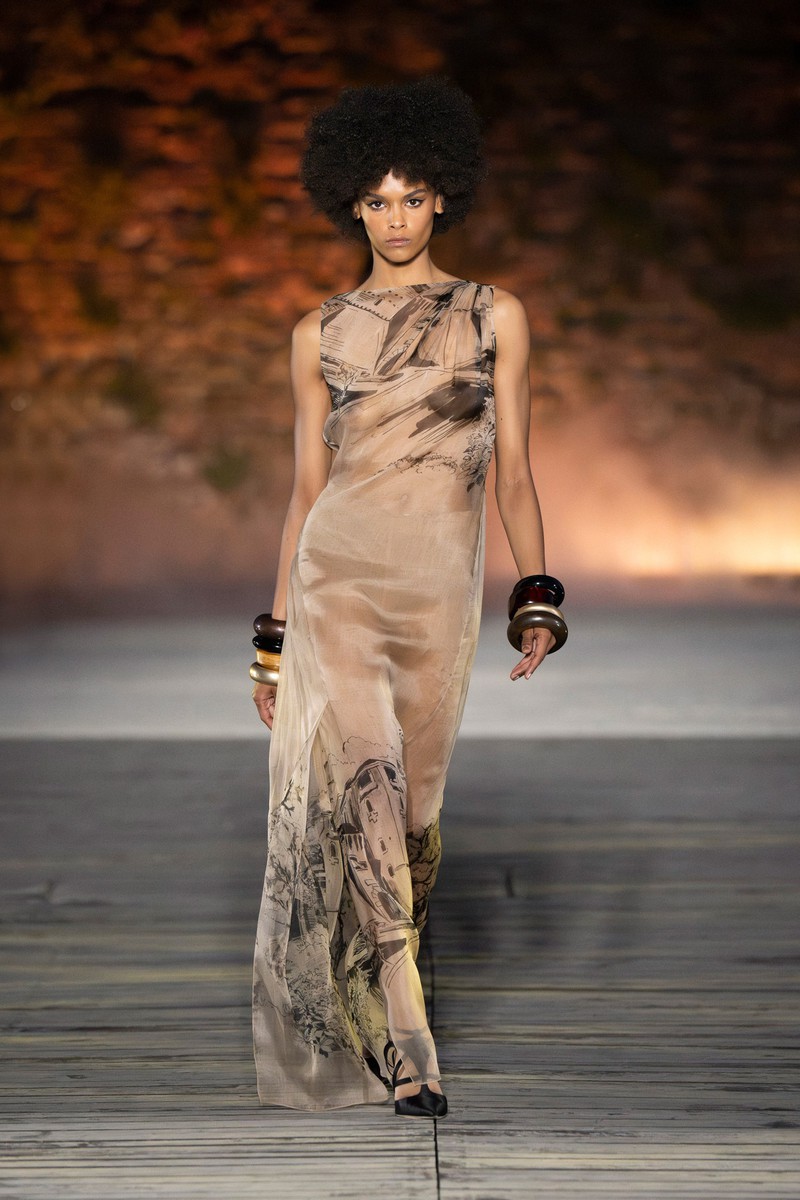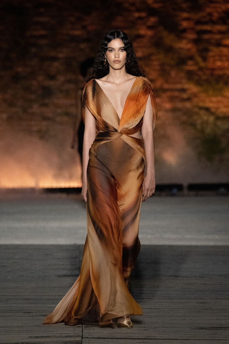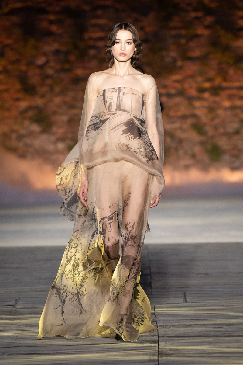 Alberta Ferretti 在Castel Sismondo举办了她的2024度假秀,该城堡位于意大利北部Emilia-Romagna地区亚得里亚海的热门海滨度假胜地。在城堡前的广阔广场上,模特们在浅水池上方的T台上游行,倒映着城堡的墙壁,那里投影着费里尼电影中的黑白场景。在印花图案上,我们同样看到了黑白城堡图案的运用。晕染色调的印花为飘逸连衣裙注入活力,营造出轻快、轻盈的效果,具有流动、性感的魅力。