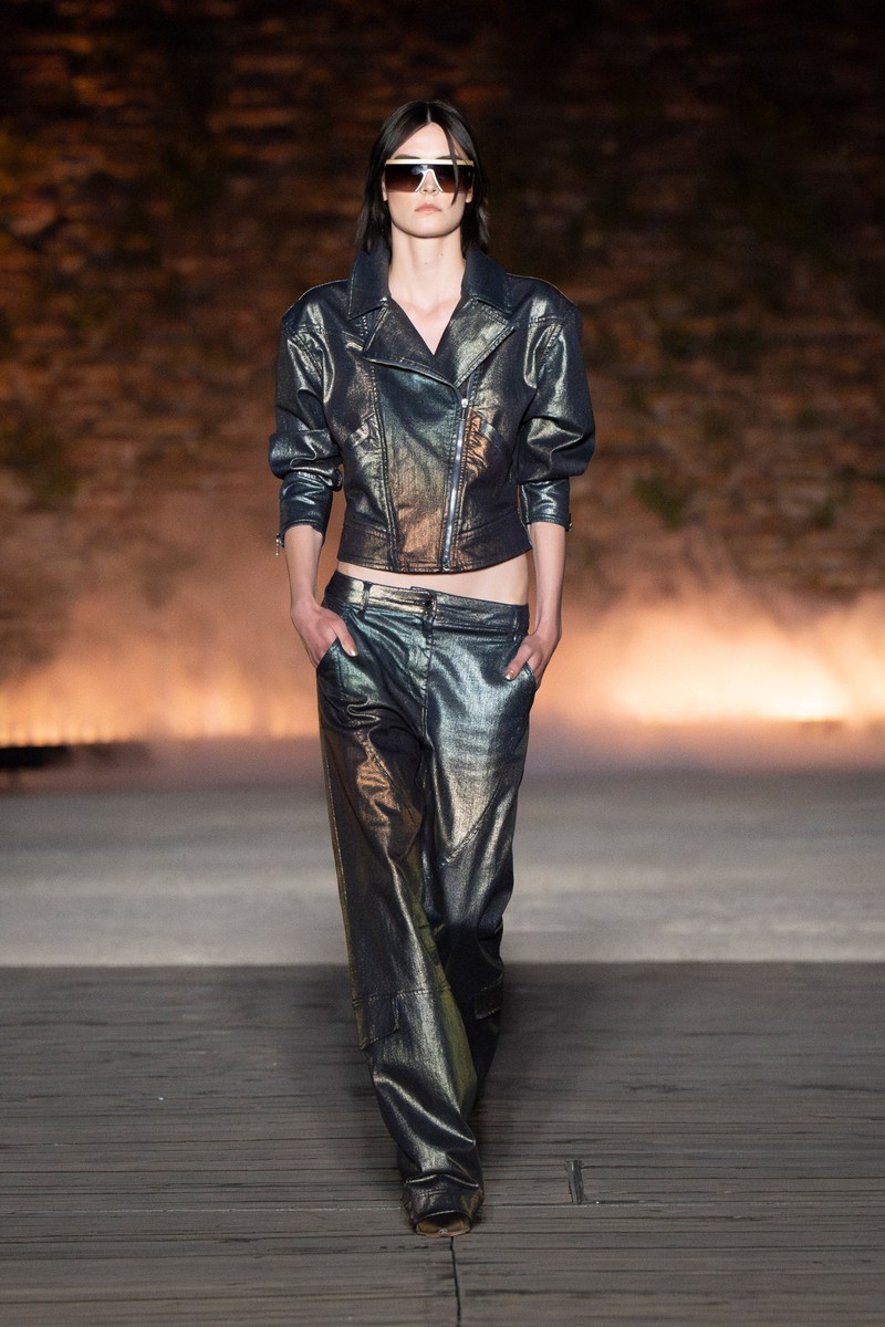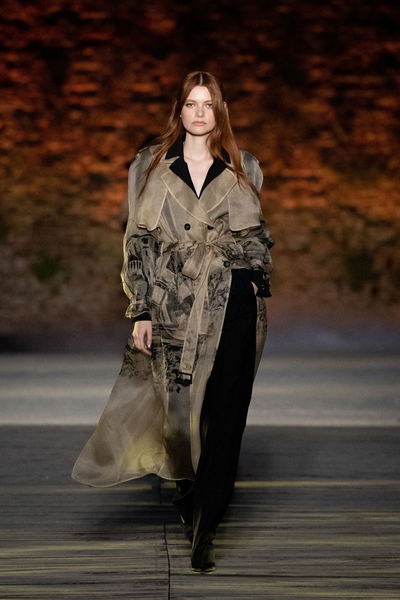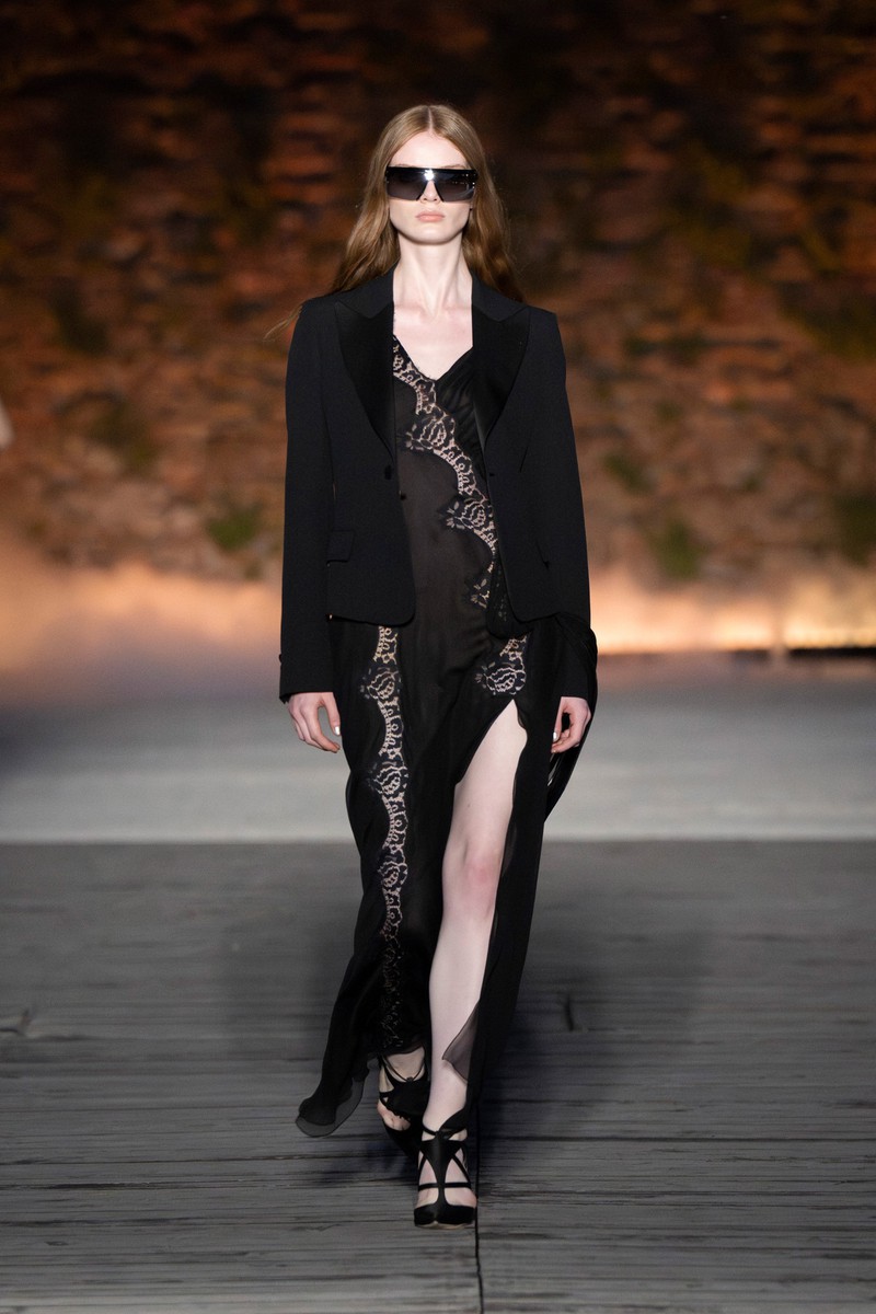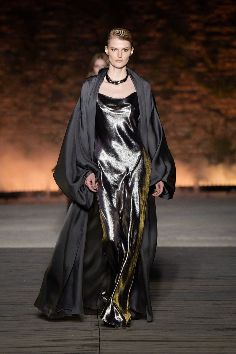 Alberta Ferretti 在Castel Sismondo举办了她的2024度假秀,该城堡位于意大利北部Emilia-Romagna地区亚得里亚海的热门海滨度假胜地。在城堡前的广阔广场上,模特们在浅水池上方的T台上游行,倒映着城堡的墙壁,那里投影着费里尼电影中的黑白场景。在印花图案上,我们同样看到了黑白城堡图案的运用。晕染色调的印花为飘逸连衣裙注入活力,营造出轻快、轻盈的效果,具有流动、性感的魅力。