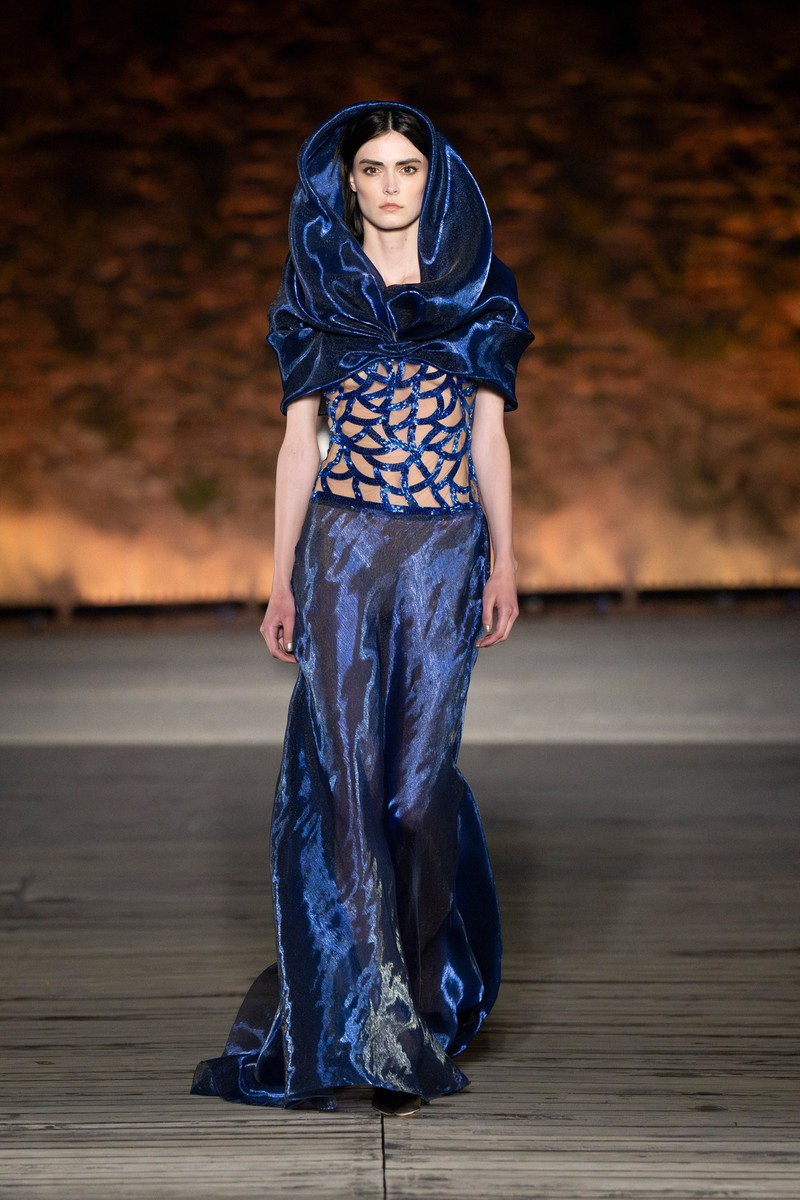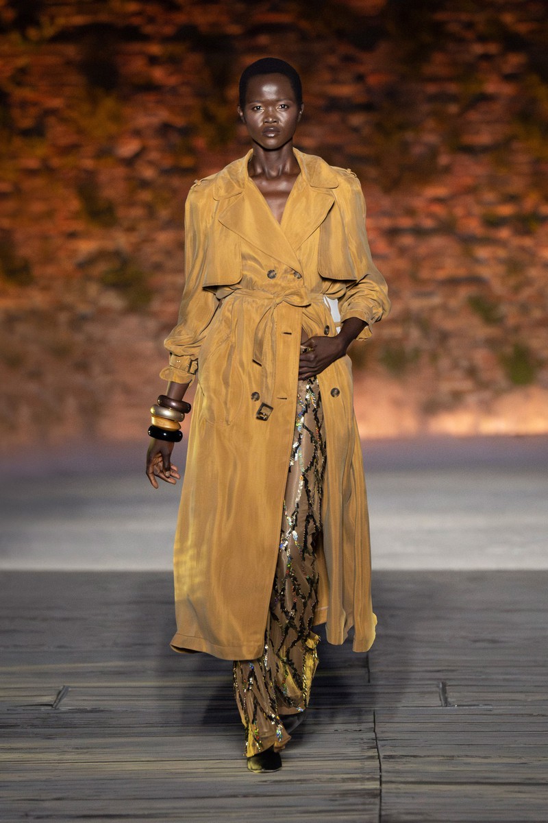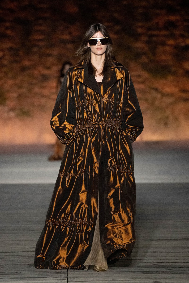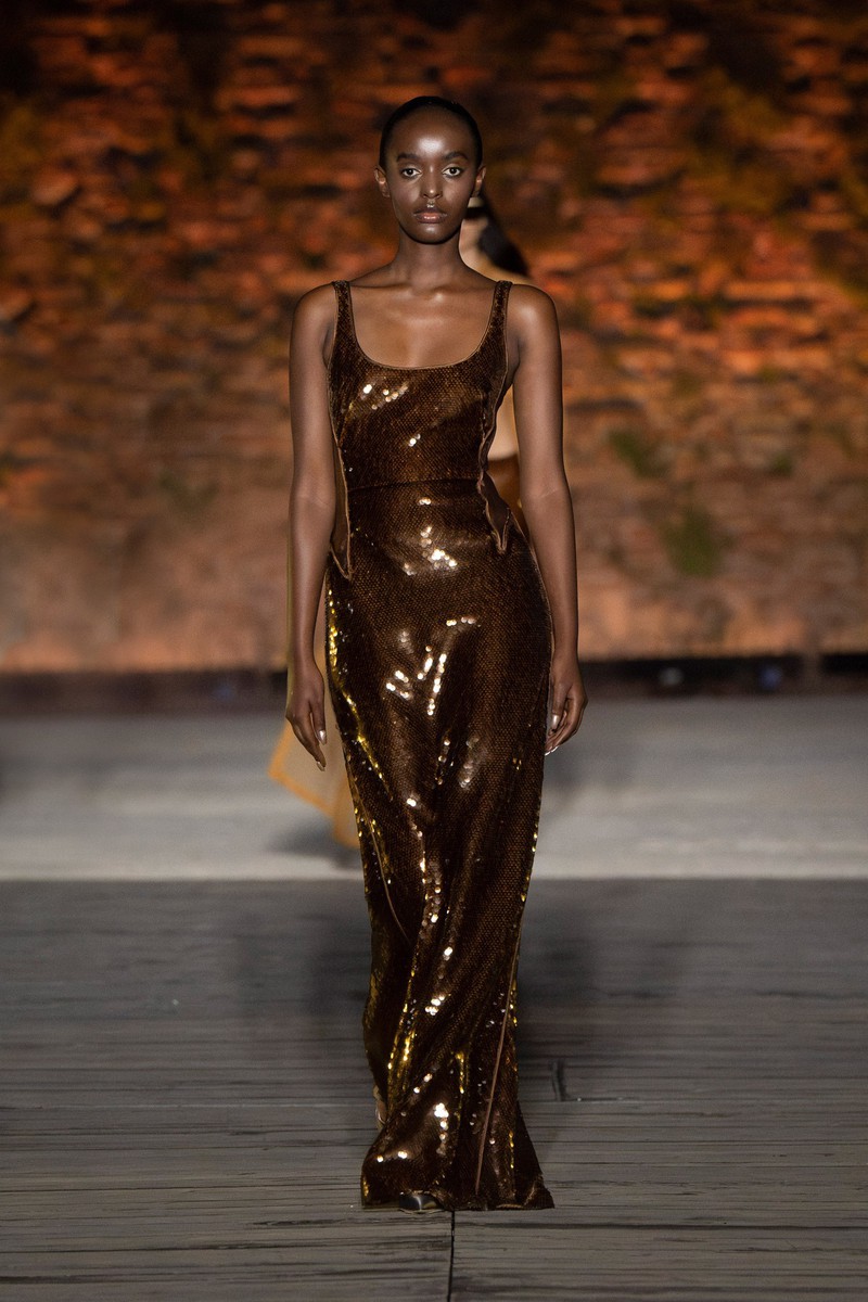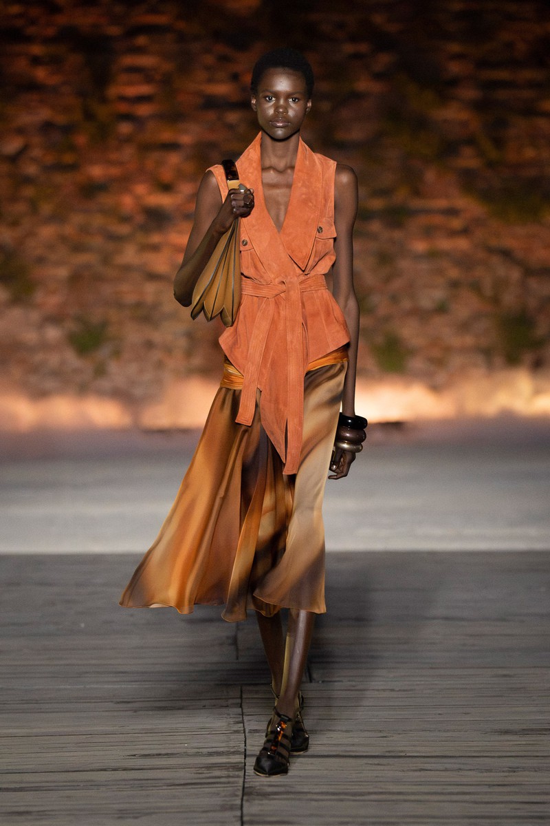 Alberta Ferretti 在Castel Sismondo举办了她的2024度假秀,该城堡位于意大利北部Emilia-Romagna地区亚得里亚海的热门海滨度假胜地。在城堡前的广阔广场上,模特们在浅水池上方的T台上游行,倒映着城堡的墙壁,那里投影着费里尼电影中的黑白场景。在印花图案上,我们同样看到了黑白城堡图案的运用。晕染色调的印花为飘逸连衣裙注入活力,营造出轻快、轻盈的效果,具有流动、性感的魅力。