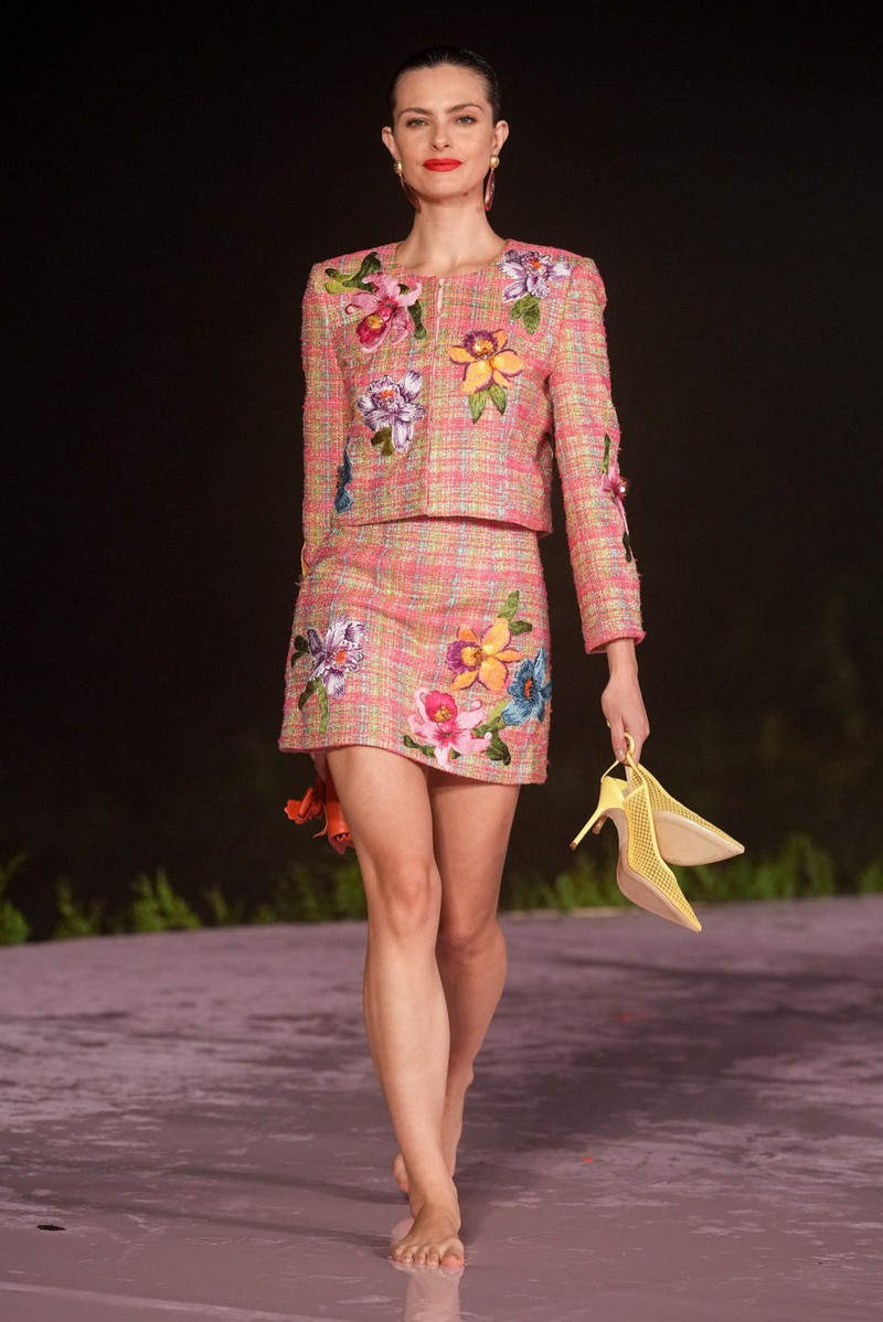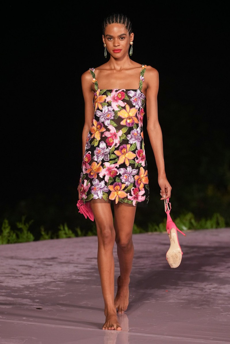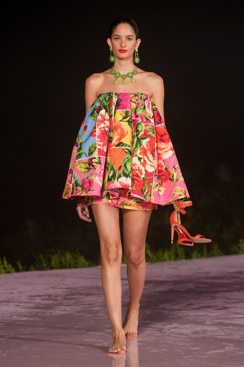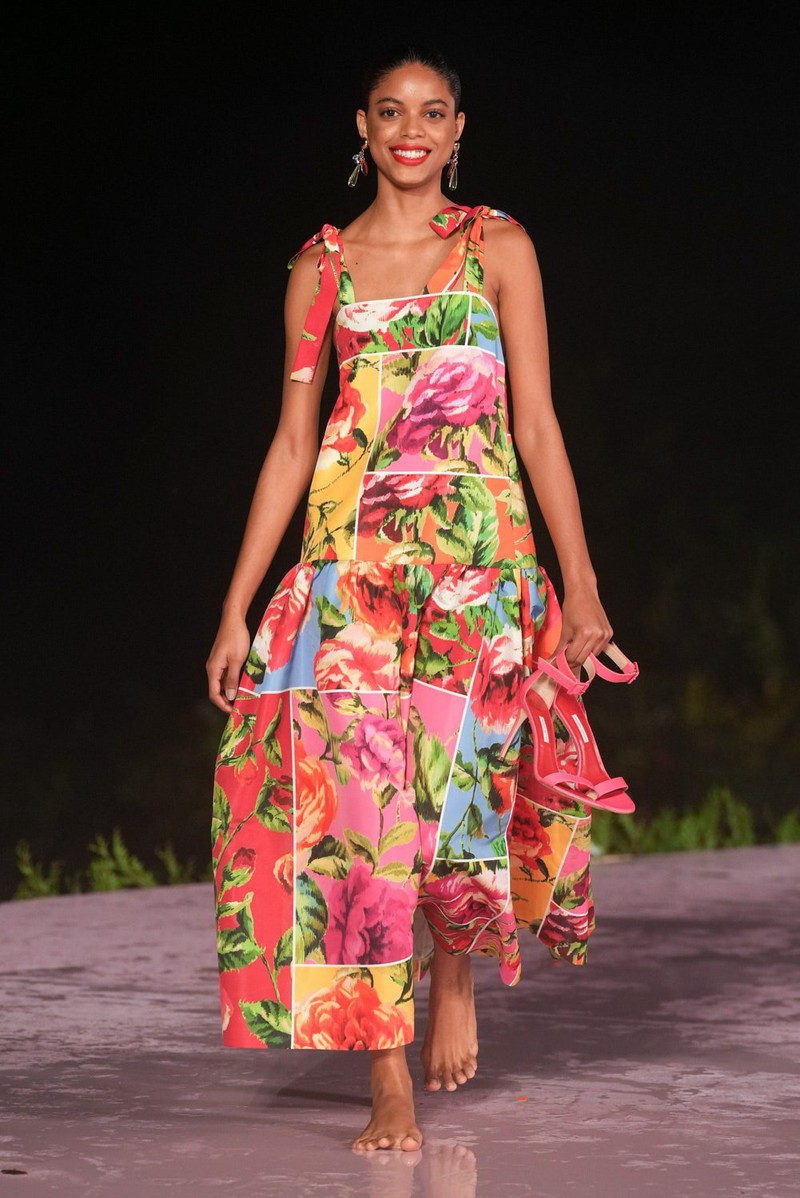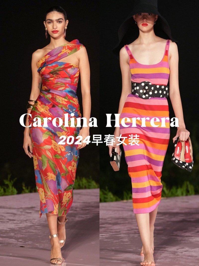 Carolina Herrera设计师首次将他的2024早春度假秀带到了巴西海滨小镇。粉红色的秀台上模特们缓缓走来,大胆、多彩的调色板和丰富的图案印花在巴西这个地方变得更加热情洋溢,亮绿色、芒果黄、大红色的花卉、条纹、圆点图案充满多巴胺的彩色能量,甚至条纹也变得如彩虹般抢眼。
