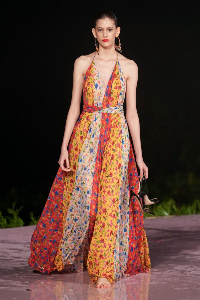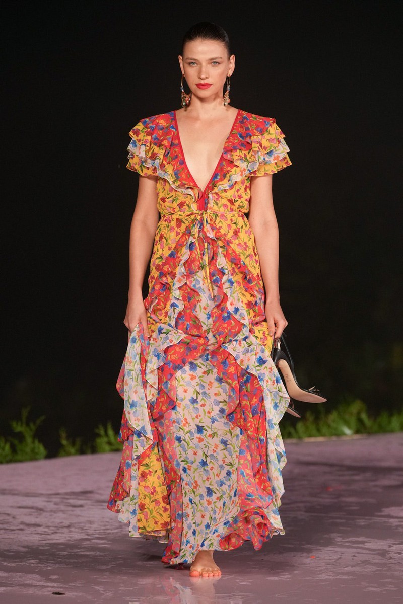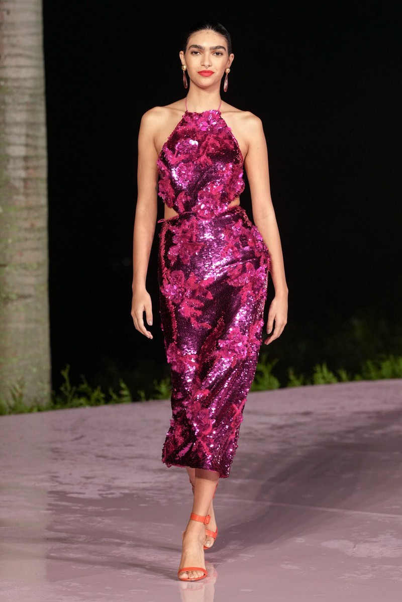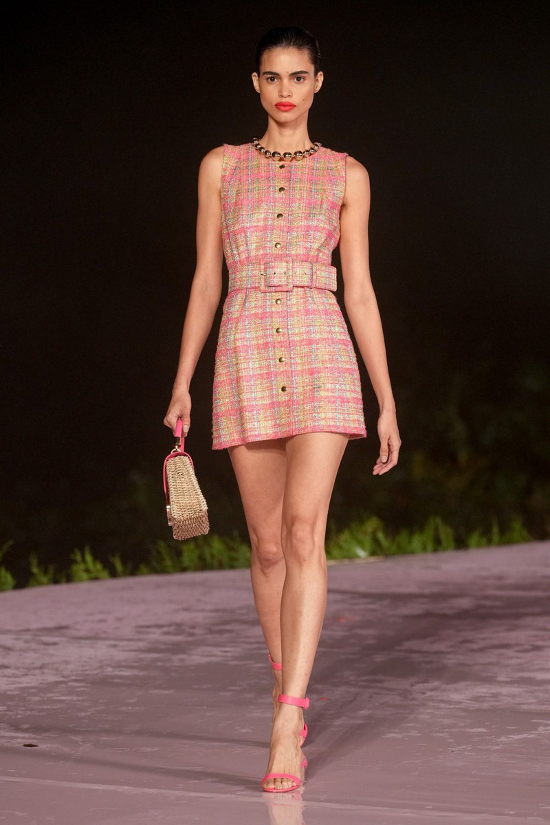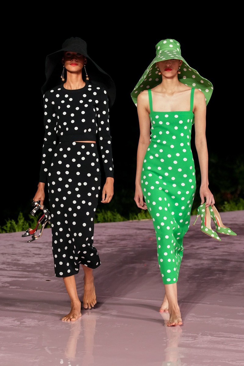 Carolina Herrera设计师首次将他的2024早春度假秀带到了巴西海滨小镇。粉红色的秀台上模特们缓缓走来,大胆、多彩的调色板和丰富的图案印花在巴西这个地方变得更加热情洋溢,亮绿色、芒果黄、大红色的花卉、条纹、圆点图案充满多巴胺的彩色能量,甚至条纹也变得如彩虹般抢眼。