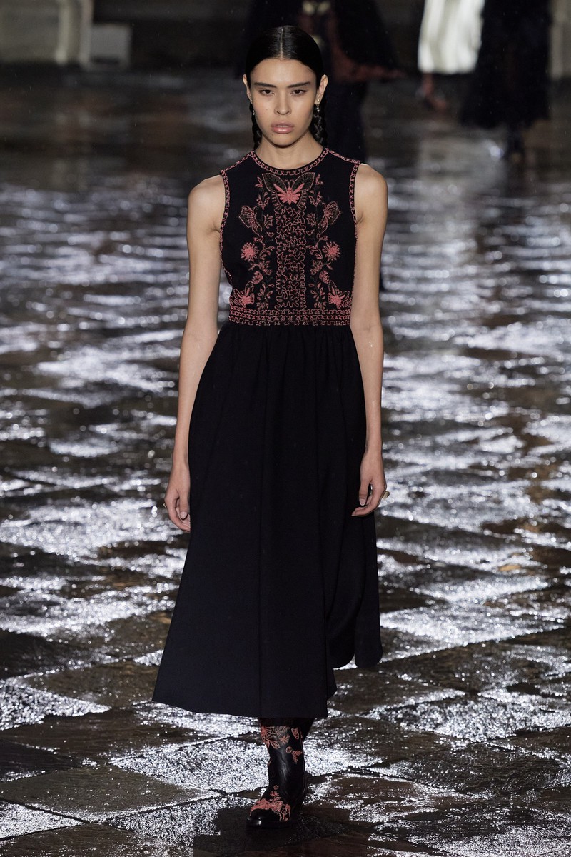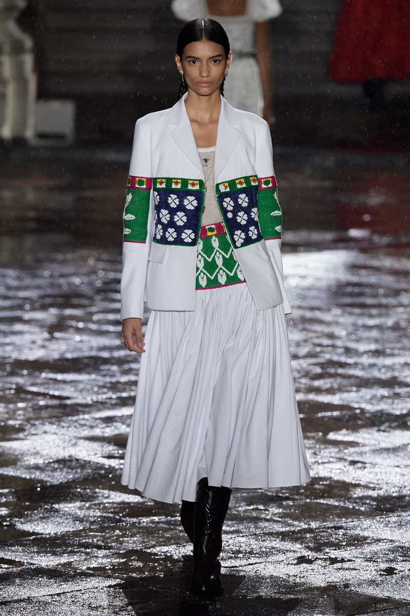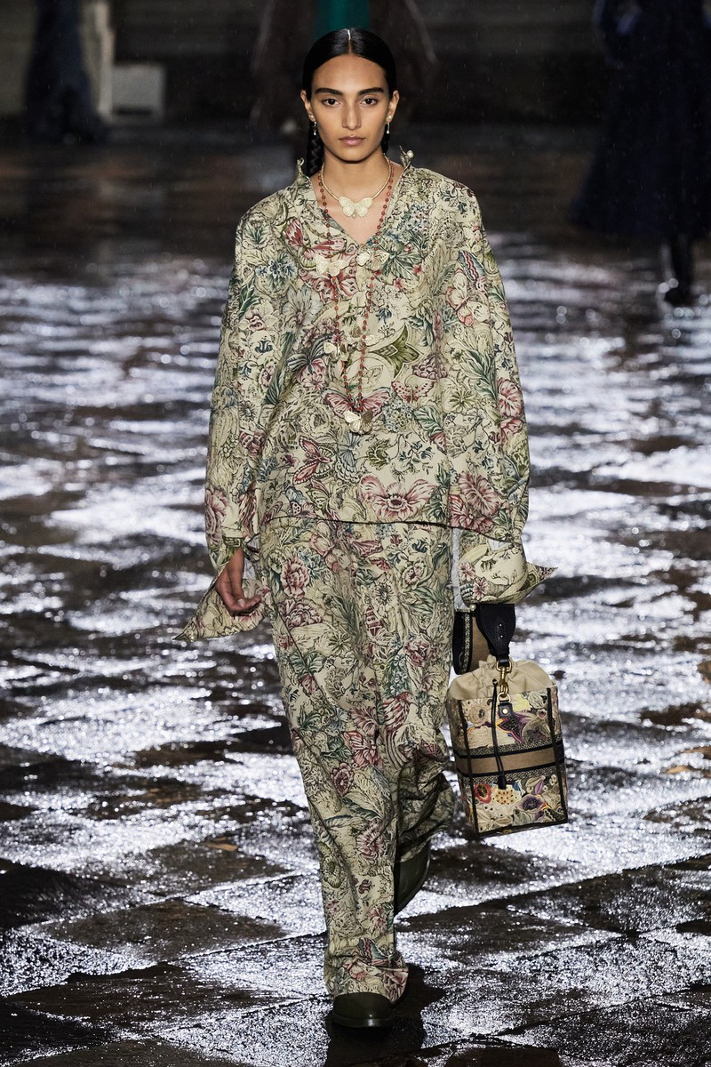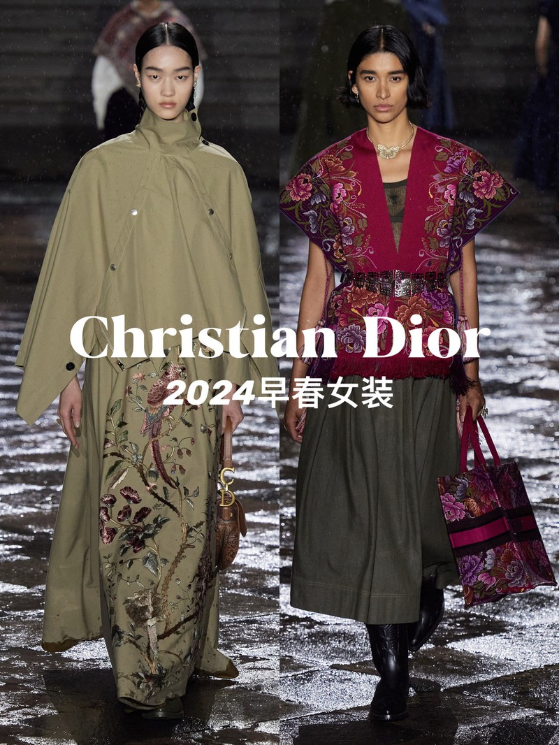 在迪奥的2024度假系列中,我们看到了墨西哥文化,充满轻盈气息的衬衫随意塞进长褶裙或叠层裙中,带着健康的慵懒态度,色调整体也偏向稍深的大地色调。图案向自然世界取材,蝴蝶、动植物缠绕在一起,经过精致的刺绣点缀着服装。