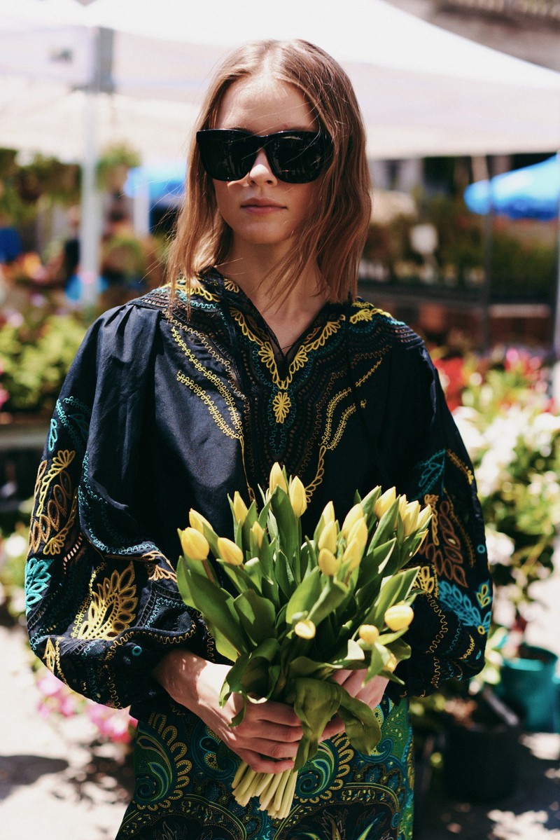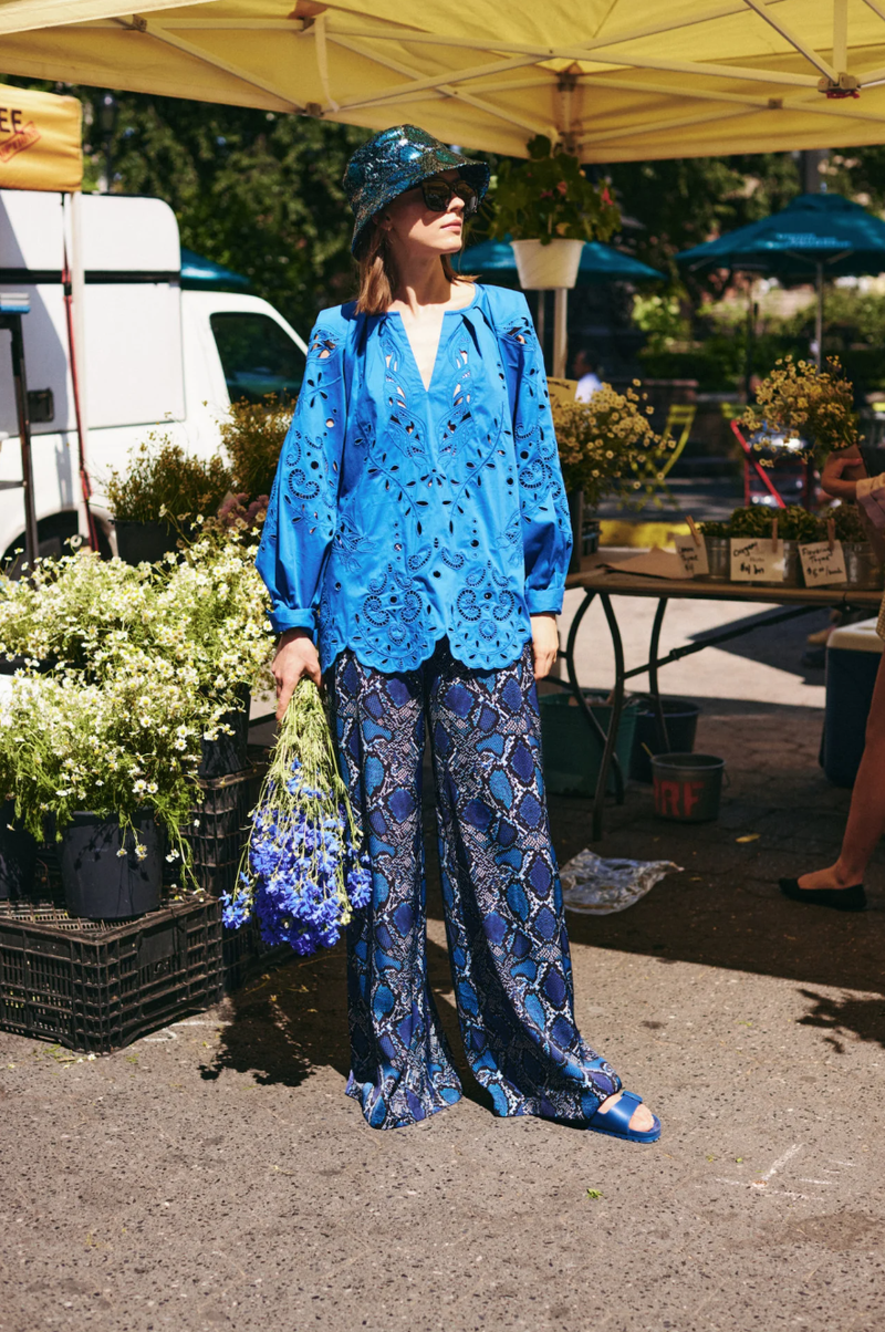 Kobi Halperin 2024早春度假系列灵感来自著名的波提切利绘画中的缪思女神,Kobi 想通过融合永恒和现代来纪念她。一个丰富而充满活力的蓝绿调色板诞生了,混合各种蛇纹、佩斯利纹理,用刺绣为每件衣服增加细节。整个系列以假日感街拍形式呈现,这种展现方式契合地表达了本季华丽又放松的氛围。
