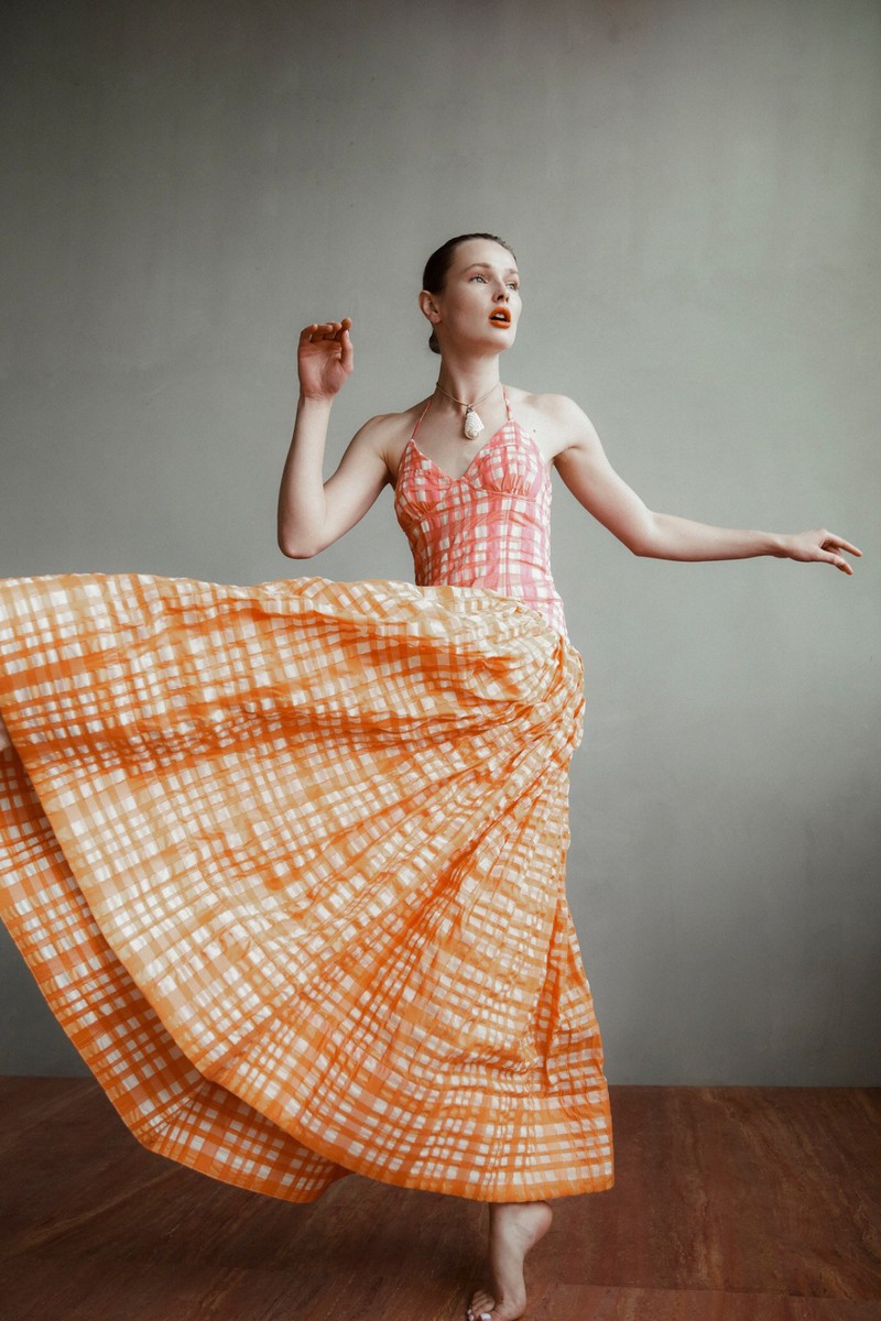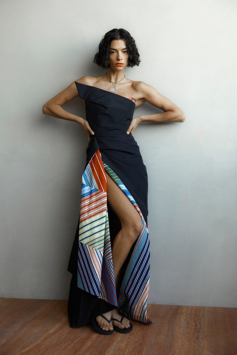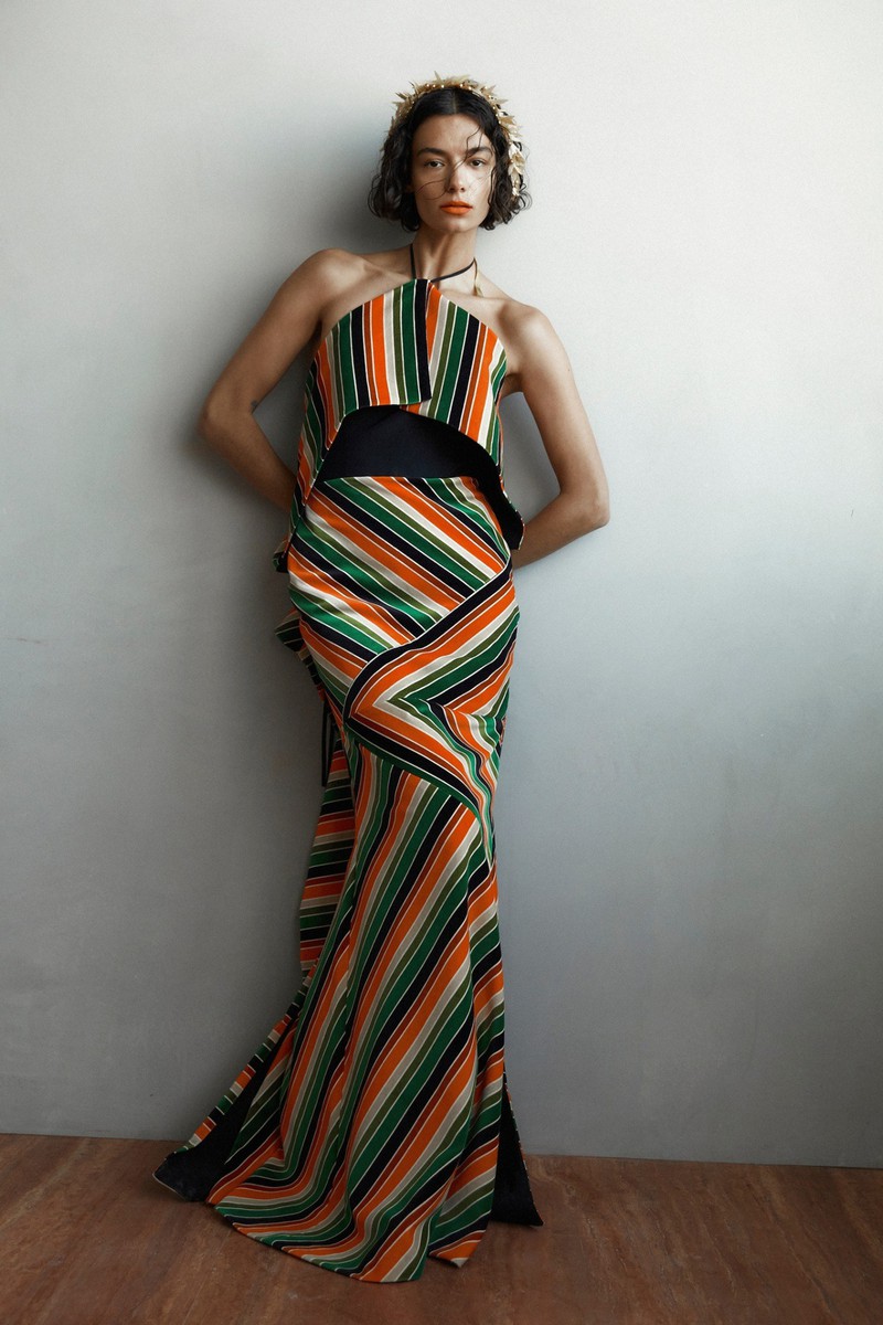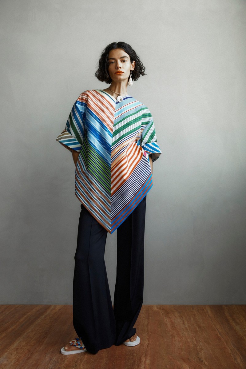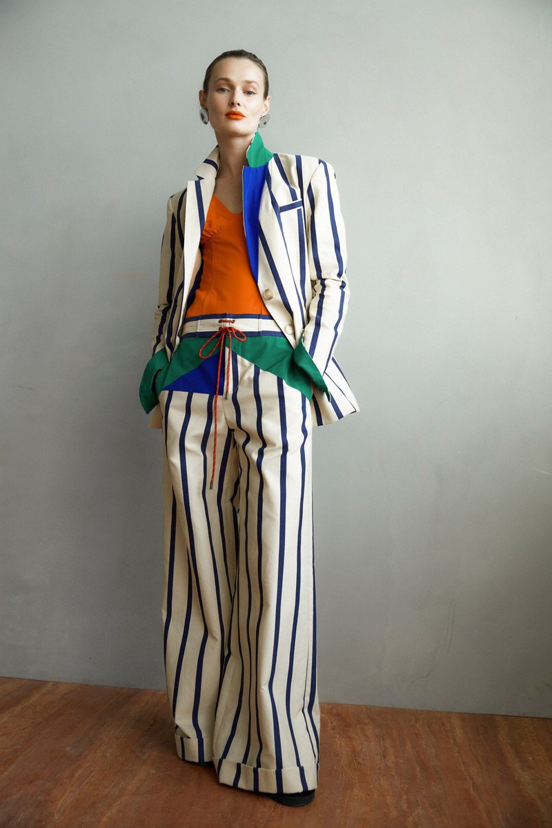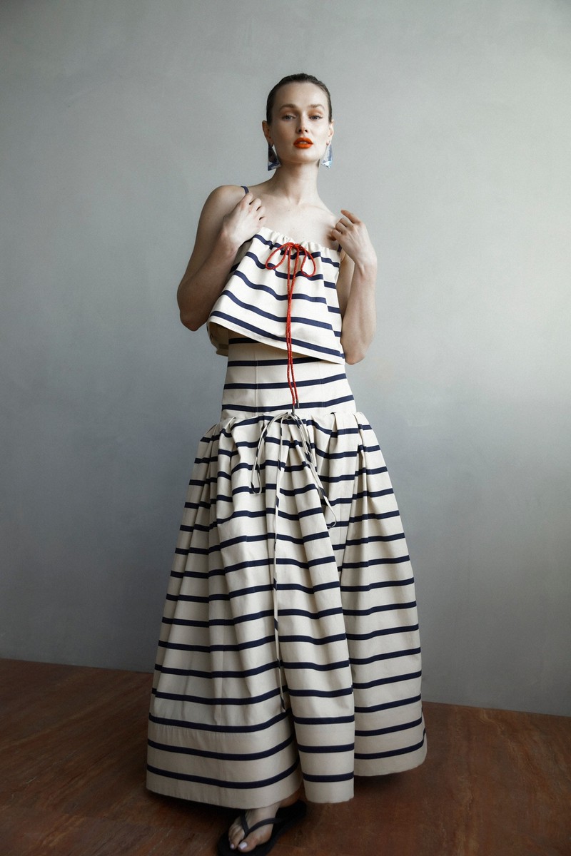 Rosie Assoulin的衣服有一种俏皮感,在2024早春系列中,有一些有趣的造型,比如灯状青色衬衫搭配白色装饰裙子,还有同样有趣的海洋主题图案,比如水波纹、海底植物。普通的彩虹条纹也可以通过拼接的设计创造出独一无二的视觉效果。