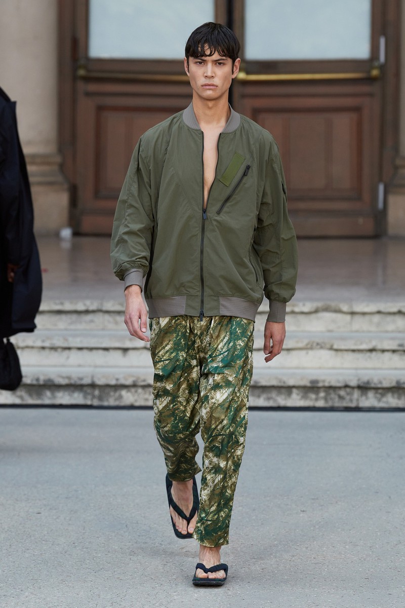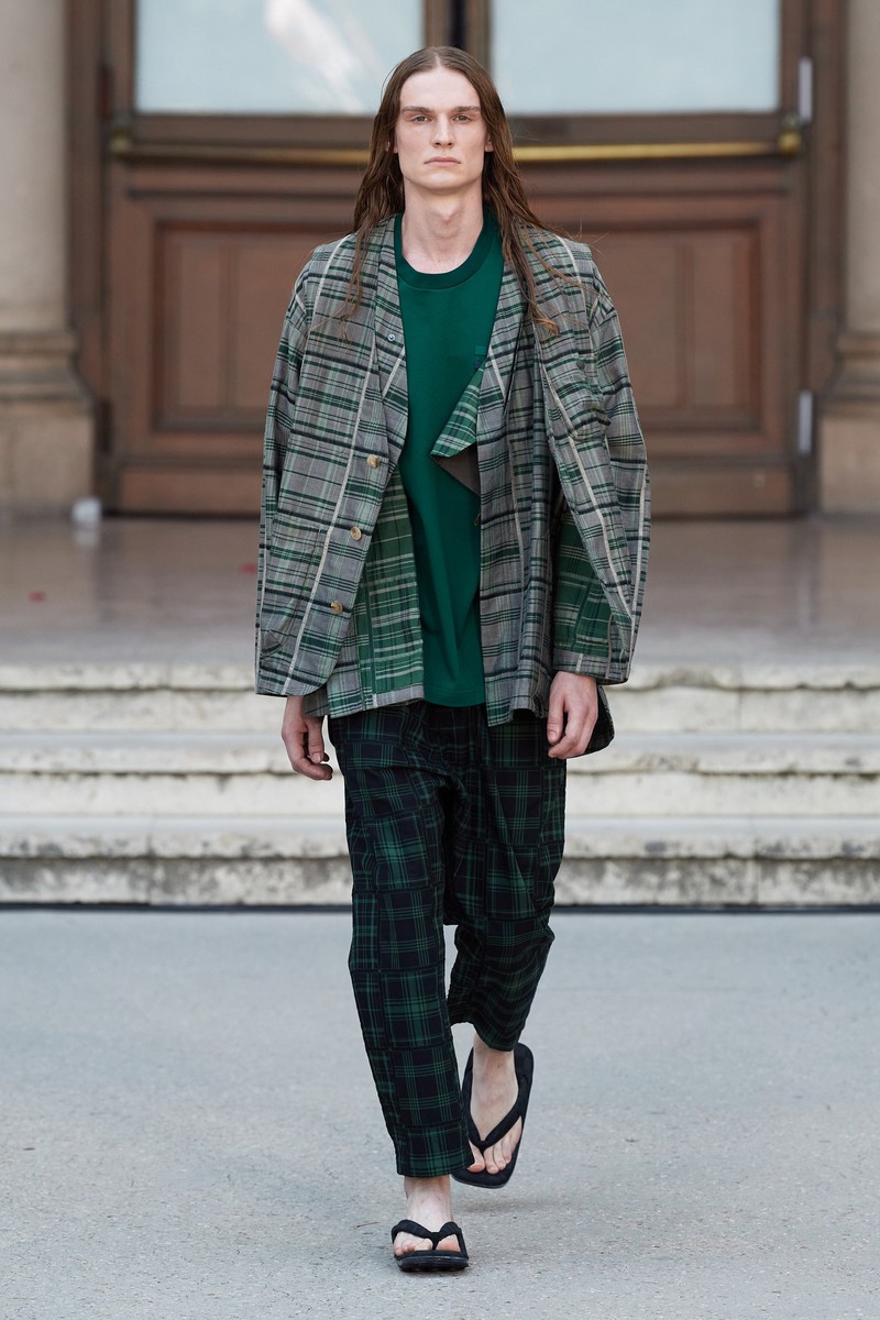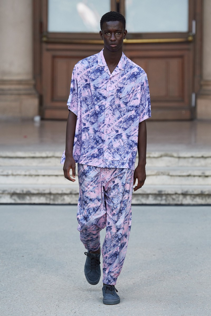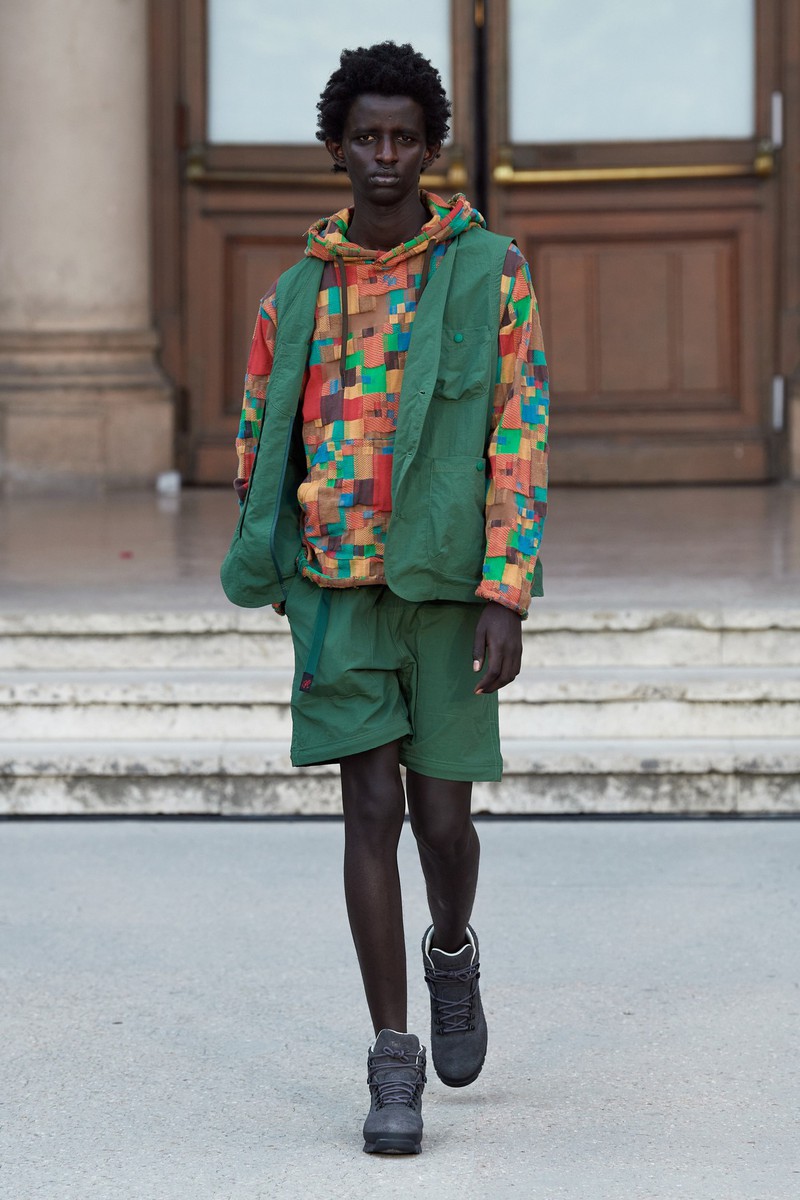 Yosuke Aizawa最近回到日本成为一名教授。他一直教授时装和纺织品设计,在回顾 70 年代和 80 年代时发现很多将复古与现代融合的优秀设计,这是很好的设计理念,也有很大的影响力。在White Mountaineering 2024春夏的秀场上,也有一种怀旧的氛围,他将电影中的时间旅行汽车印在了夹克的背面,还有80 年代色调的风景照片,户外肌理、格纹图案,一起打造休闲的时装系列。
