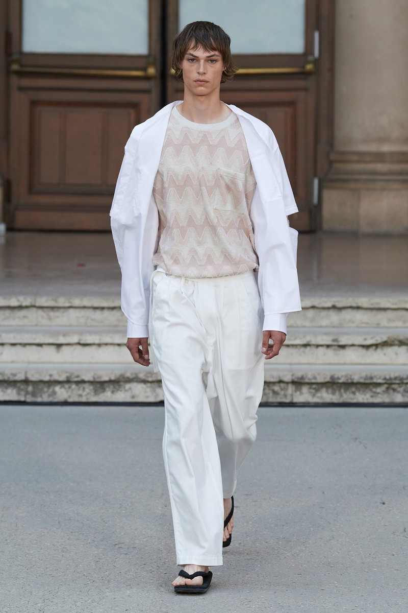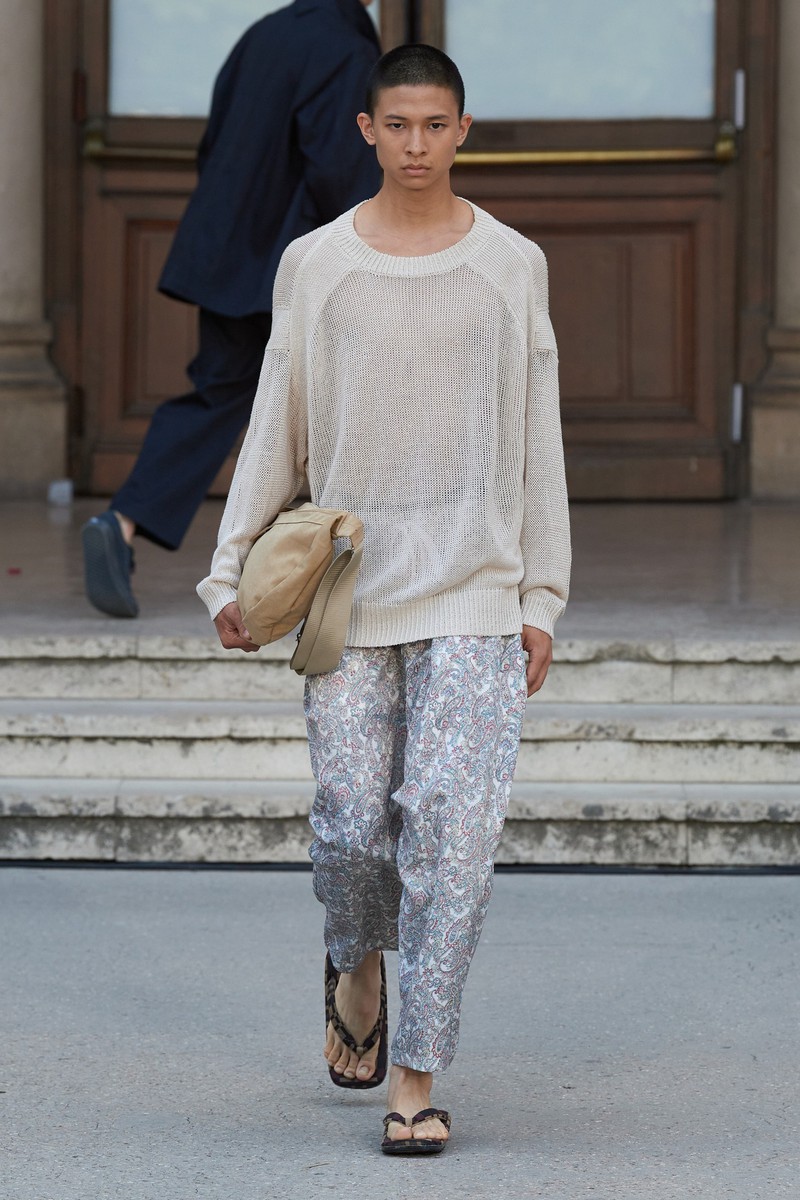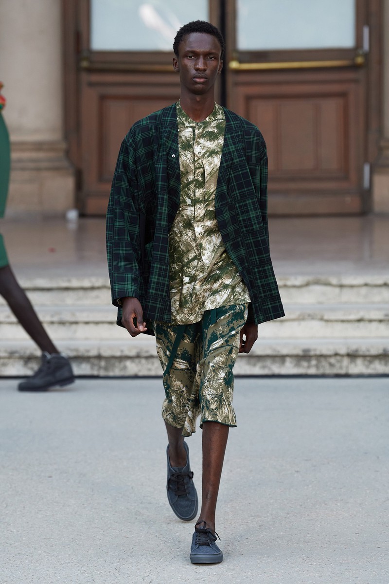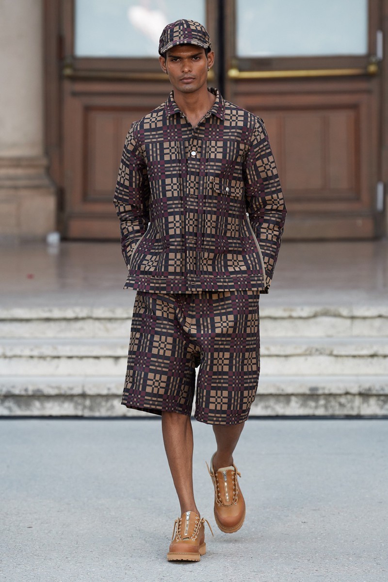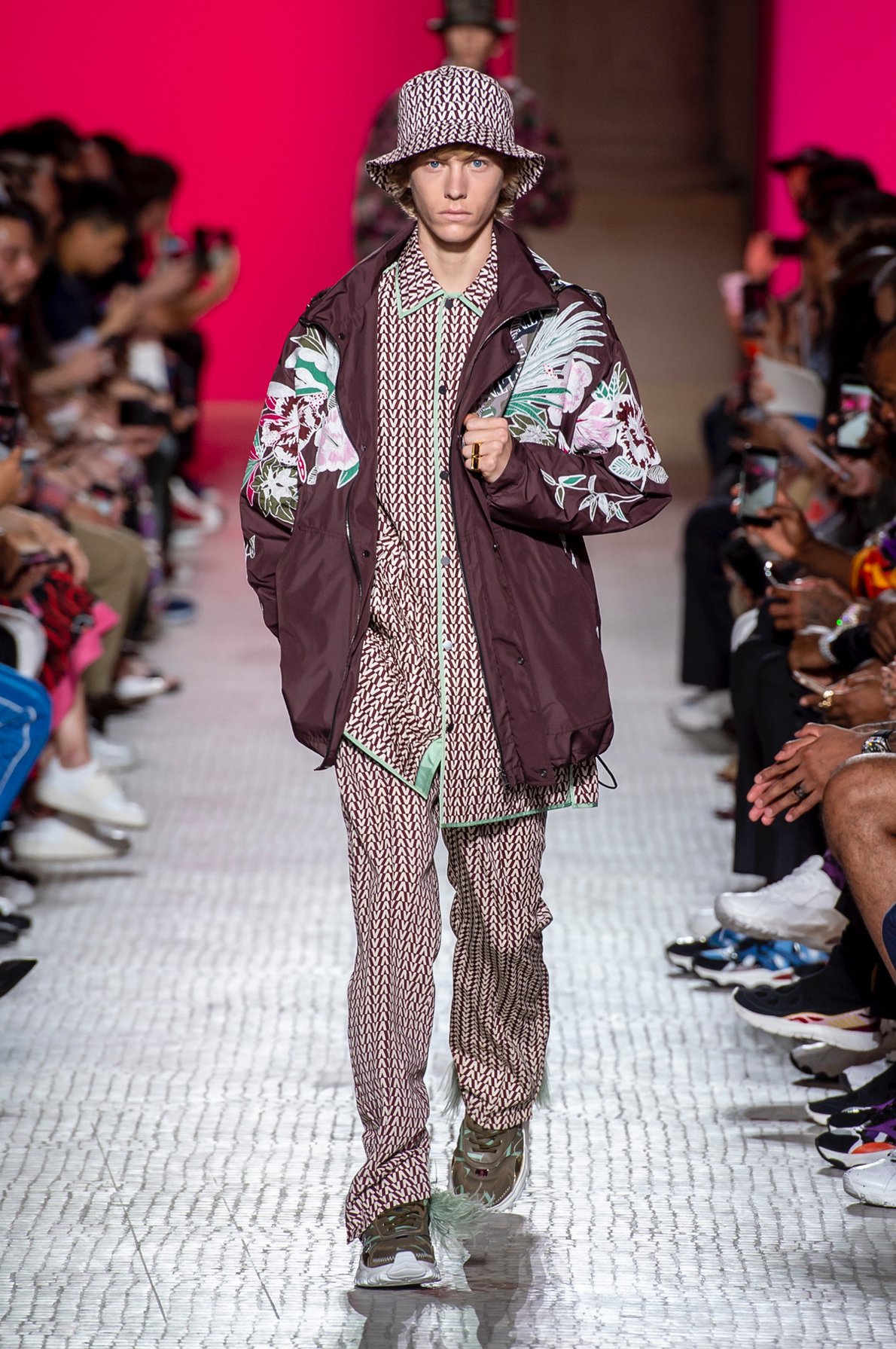 Yosuke Aizawa最近回到日本成为一名教授。他一直教授时装和纺织品设计,在回顾 70 年代和 80 年代时发现很多将复古与现代融合的优秀设计,这是很好的设计理念,也有很大的影响力。在White Mountaineering 2024春夏的秀场上,也有一种怀旧的氛围,他将电影中的时间旅行汽车印在了夹克的背面,还有80 年代色调的风景照片,户外肌理、格纹图案,一起打造休闲的时装系列。