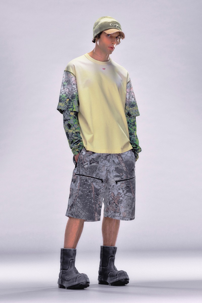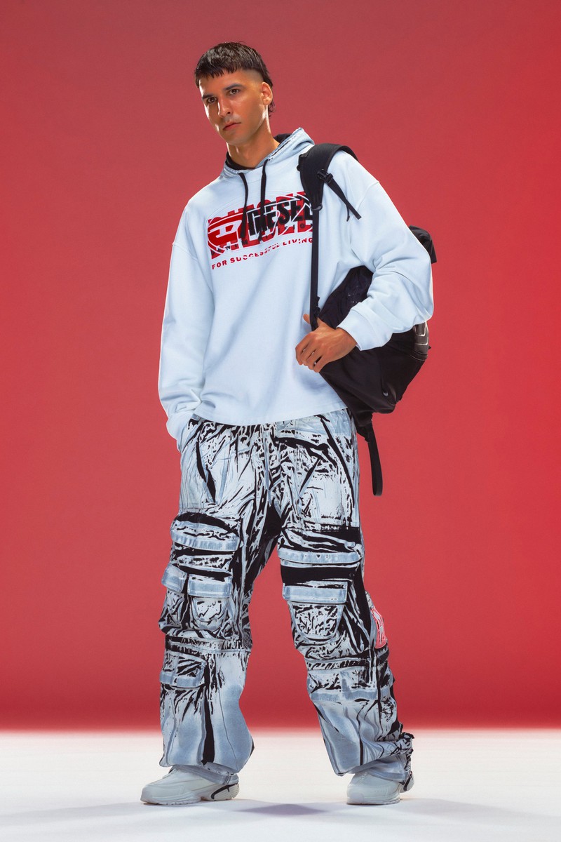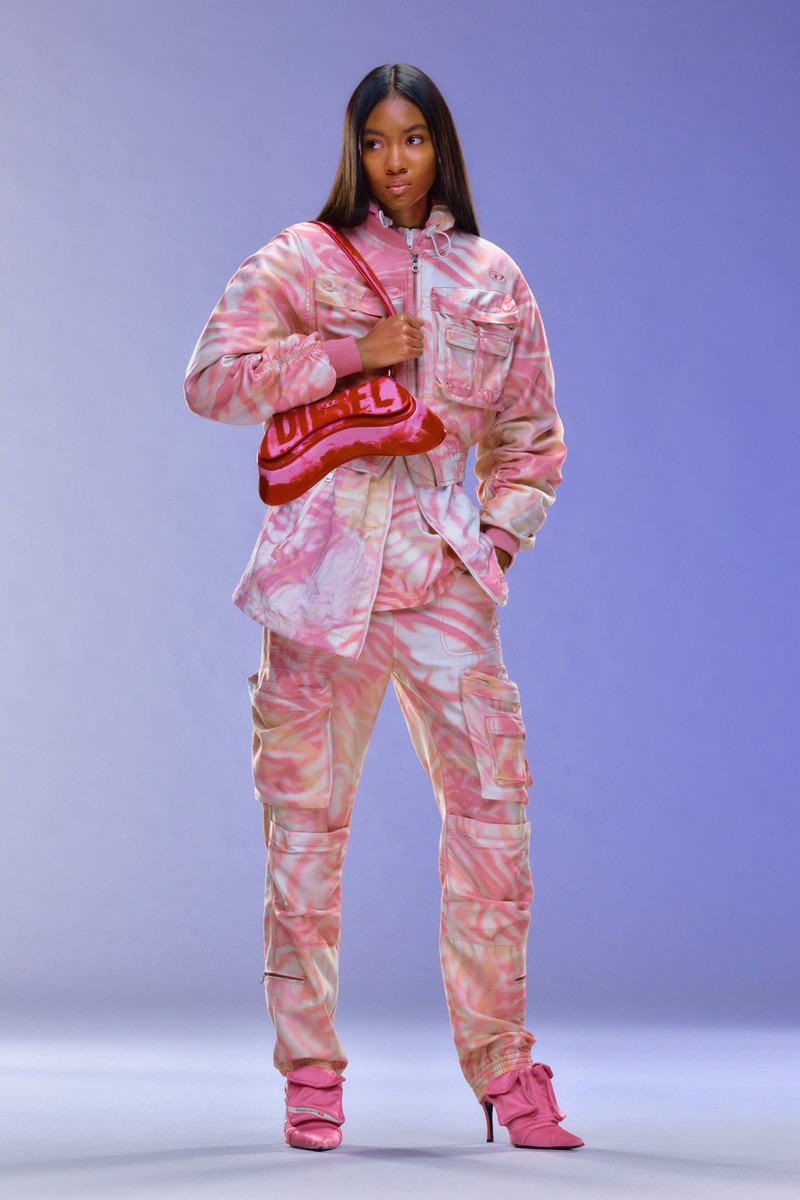 牛仔是运动休闲品牌Diesel的重要设计要素,在2024早春系列中,我们再一次看到了牛仔布的新设计,不仅可以切割拼贴,也可以在上面印上喷墨形成的肌理图案,再一次证明抽象形式的图案在运动装中的适用度。