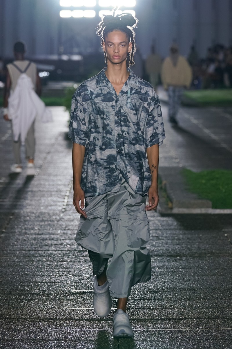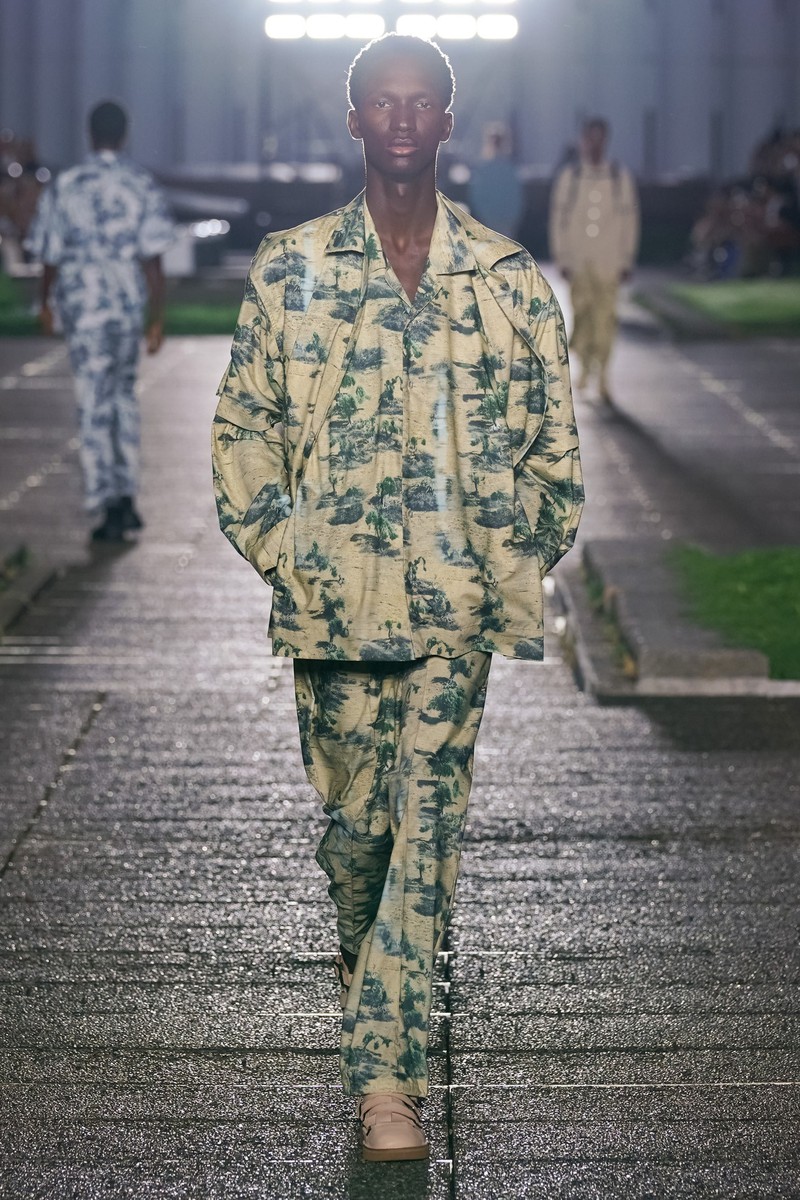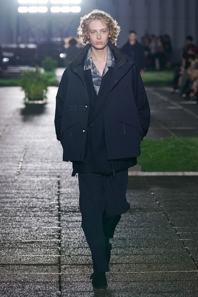 Naohiro Fujisaki 的 2024 年春季系列是关于穿越空间的:在建成的城市和自然世界之间移动;夏季炎热,冬季寒冷,光明与黑暗。Fujisaki 和东京的许多设计师一样,设计内敛的服装。尼龙裹身裙、飞行员夹克,这些都是该系列中更具工业感的一面,加上与芬兰摄影师 Ola Kolehmainen 合作的建筑印花。这些与更温和的细节相平衡。