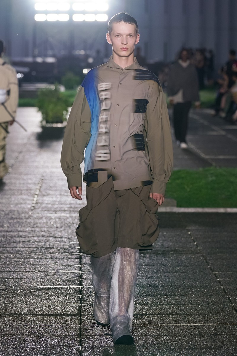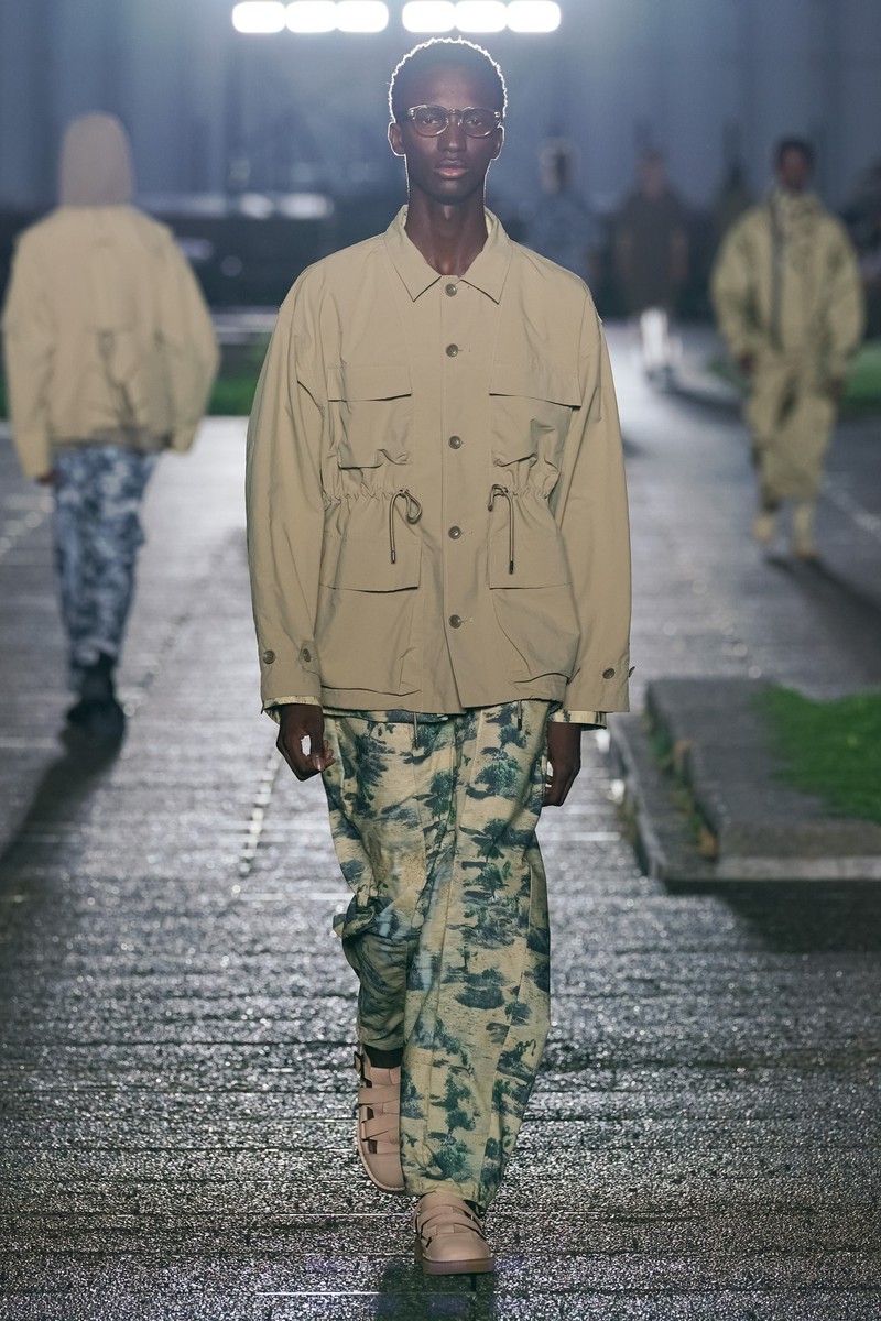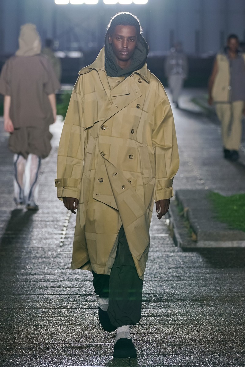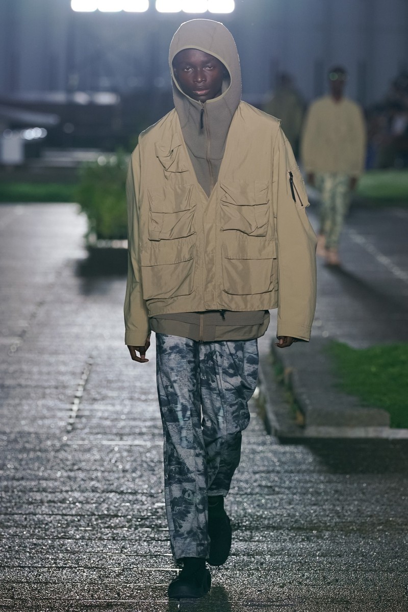 Naohiro Fujisaki 的 2024 年春季系列是关于穿越空间的:在建成的城市和自然世界之间移动;夏季炎热,冬季寒冷,光明与黑暗。Fujisaki 和东京的许多设计师一样,设计内敛的服装。尼龙裹身裙、飞行员夹克,这些都是该系列中更具工业感的一面,加上与芬兰摄影师 Ola Kolehmainen 合作的建筑印花。这些与更温和的细节相平衡。