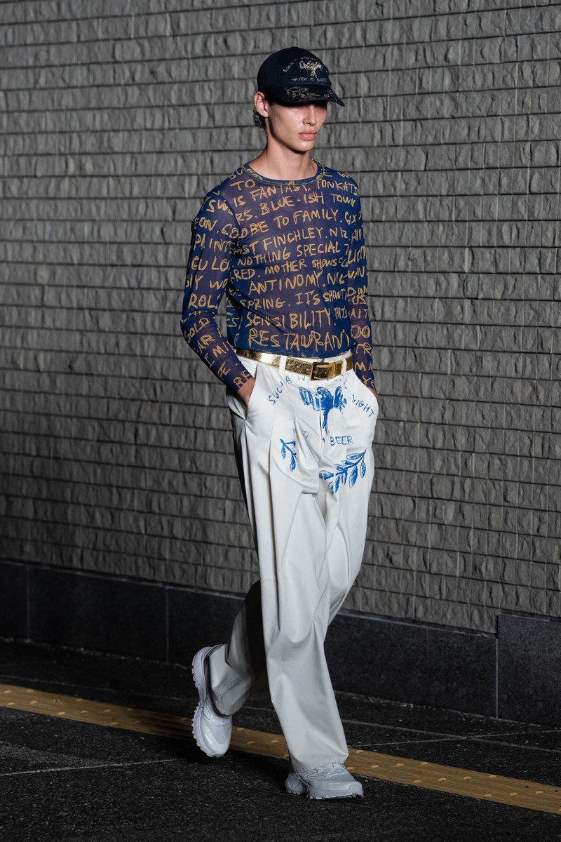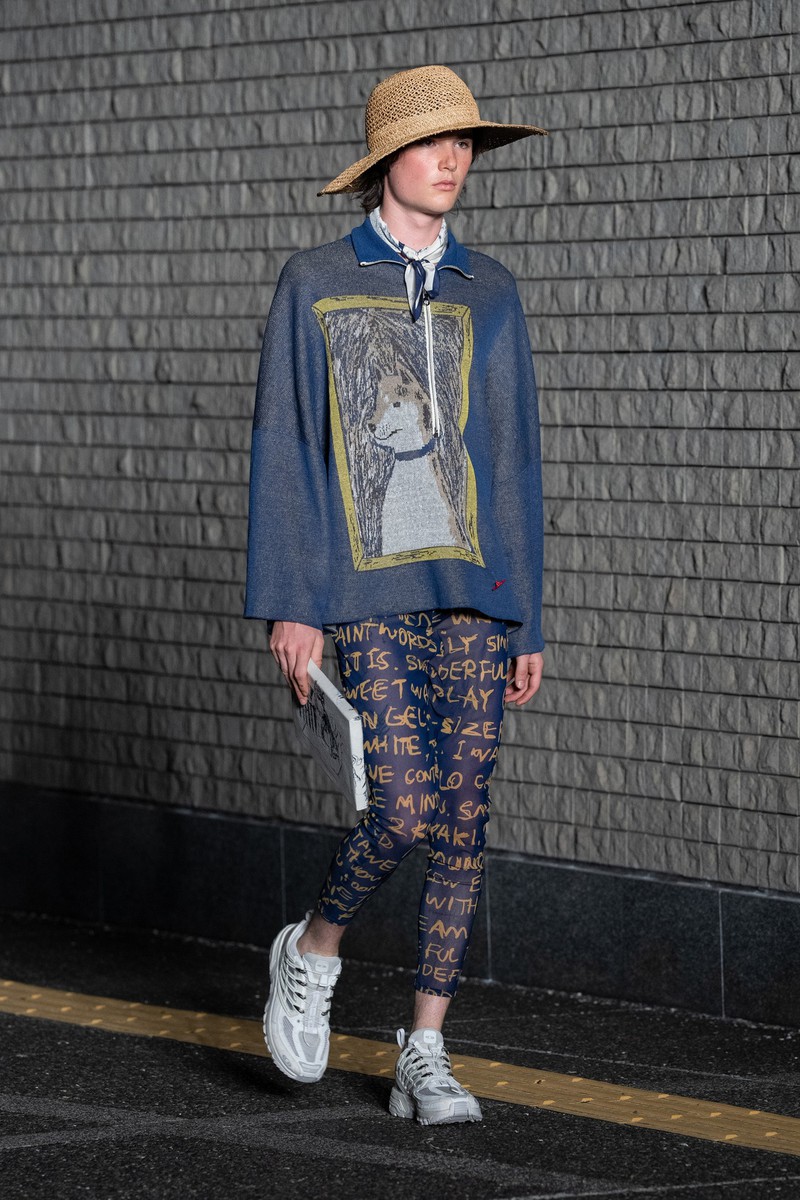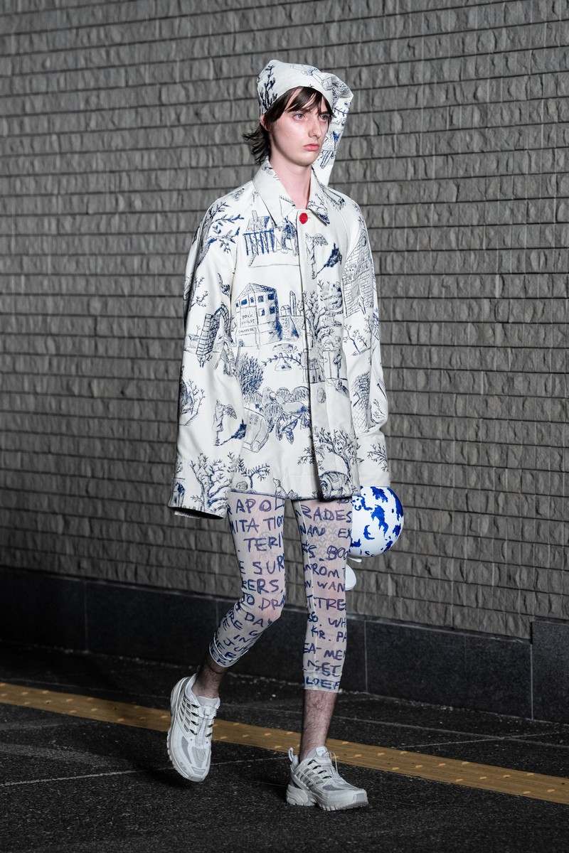 Shinya Kozuka 的 2024 年春季秀带领我们进行了一场梦游般的漫步,许多作品都装饰有 Kozuka 的原创草图,这些草图是他在 iPad 上绘制的,看起来就像潦草的涂鸦。风景主题、字母各种不同元素都采用了蓝白签字笔的风格呈现,蓝色是这次的主题调色板,在初夏季节带来特别的感觉。