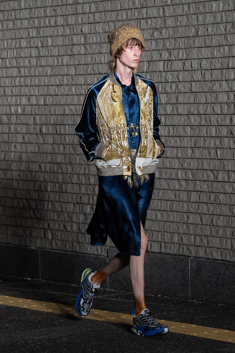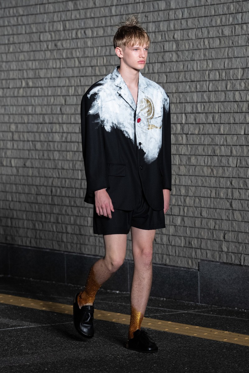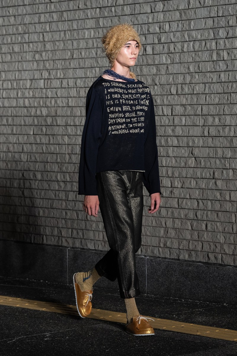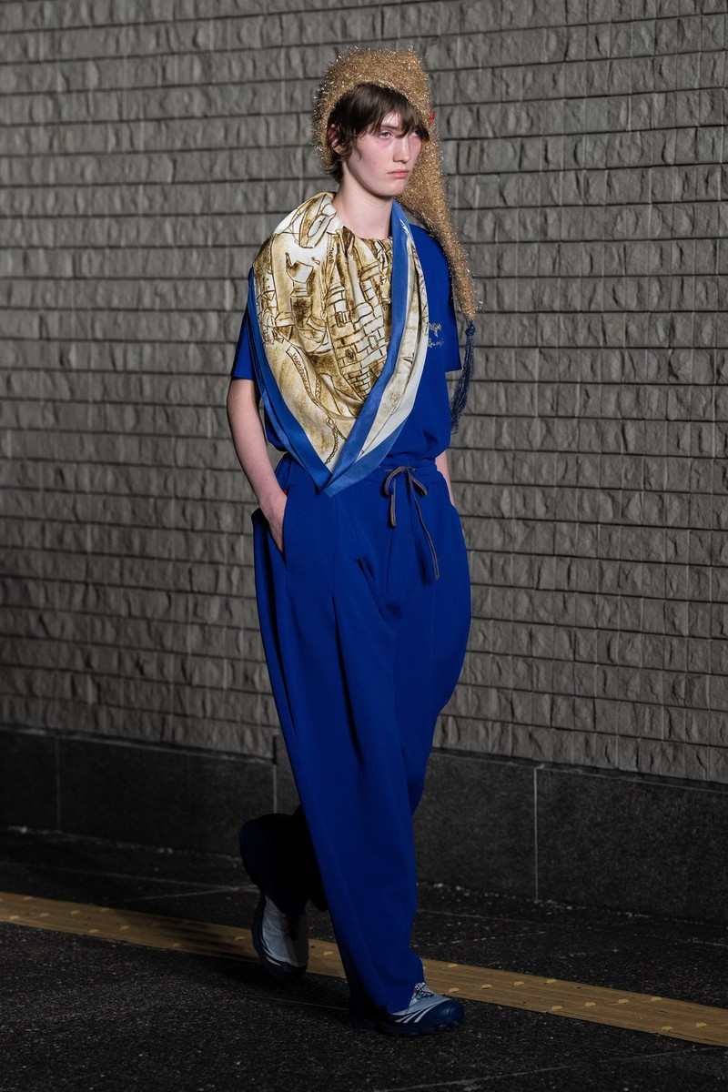 Shinya Kozuka 的 2024 年春季秀带领我们进行了一场梦游般的漫步,许多作品都装饰有 Kozuka 的原创草图,这些草图是他在 iPad 上绘制的,看起来就像潦草的涂鸦。风景主题、字母各种不同元素都采用了蓝白签字笔的风格呈现,蓝色是这次的主题调色板,在初夏季节带来特别的感觉。
