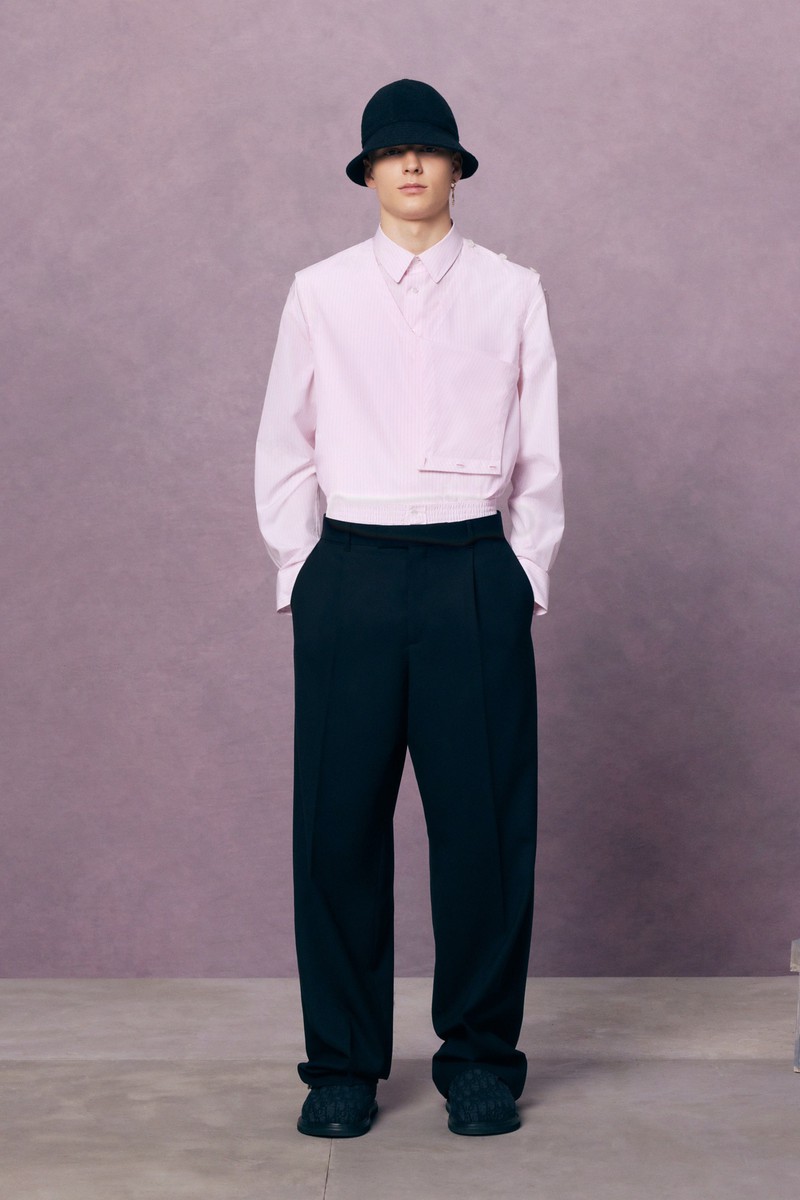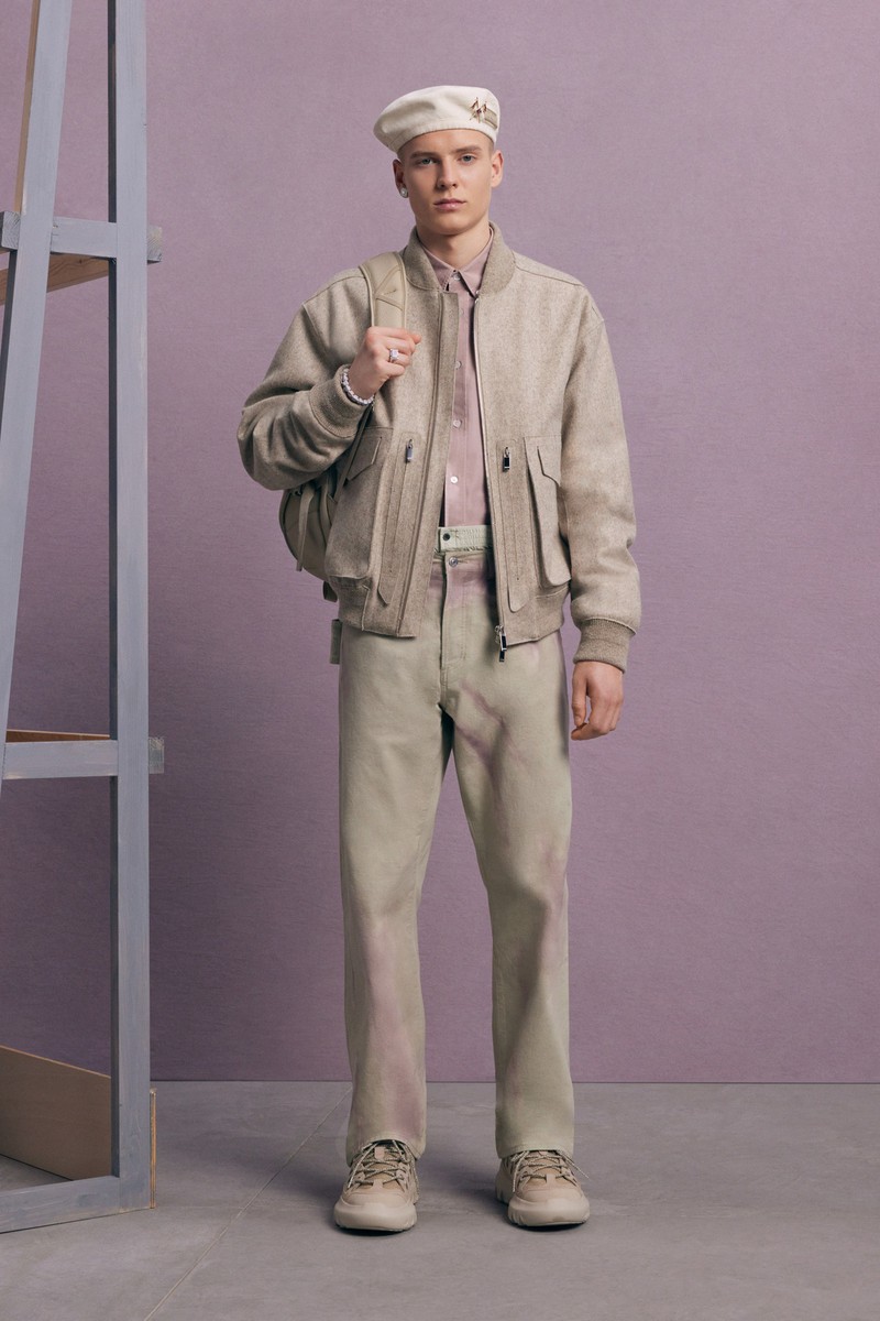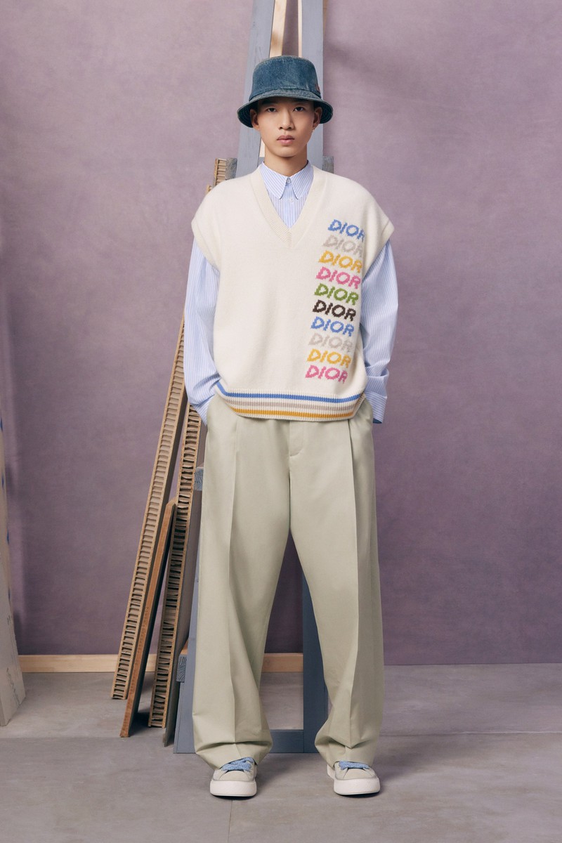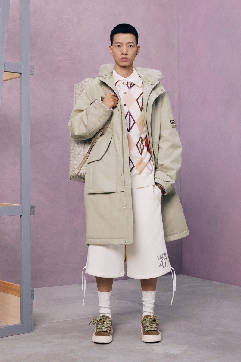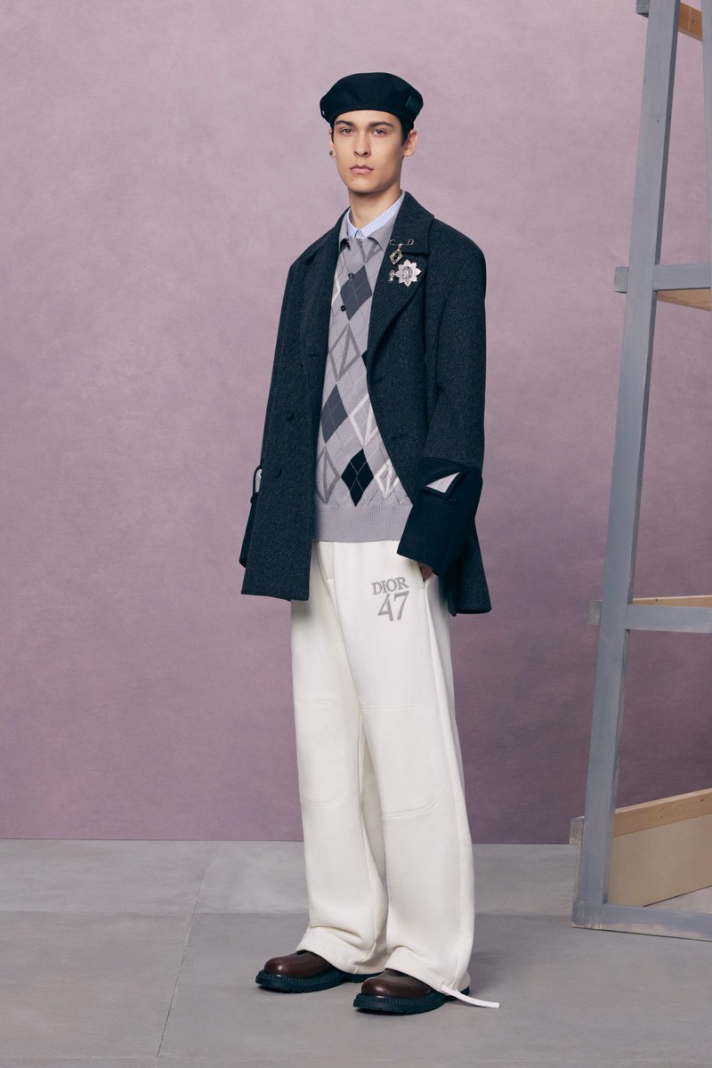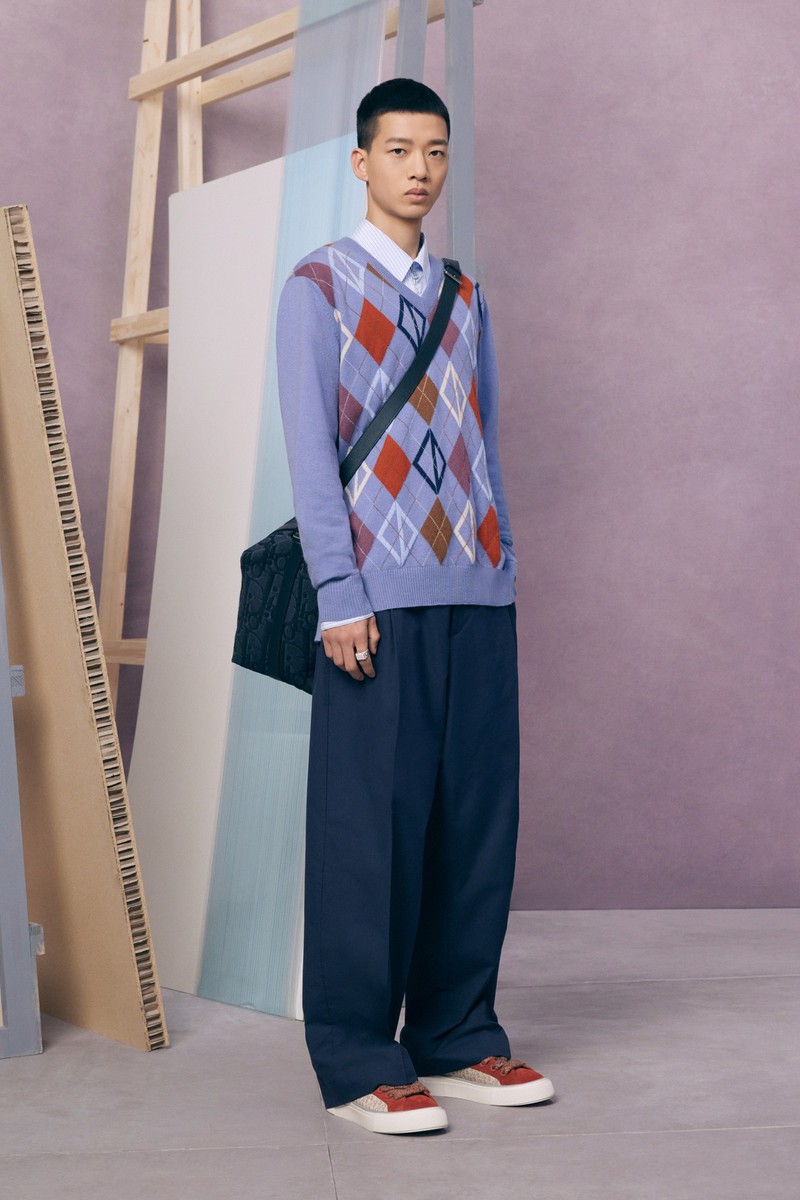 本季,Kim Jones将 1980 年代 Ray Petri 的 Buffalo 风格融入经典的 Dior 调色板中,Buffalo 高级时尚与复古相结合的伦敦风格深受设计师Jones的喜爱。英国菱形毛衣和Dior 菱形标志的巧妙融合,淡雅的染色图案,都使高级时装毫不费力地与男士现在想要的休闲穿着方式结合起来,穿得舒适才是服装的核心。