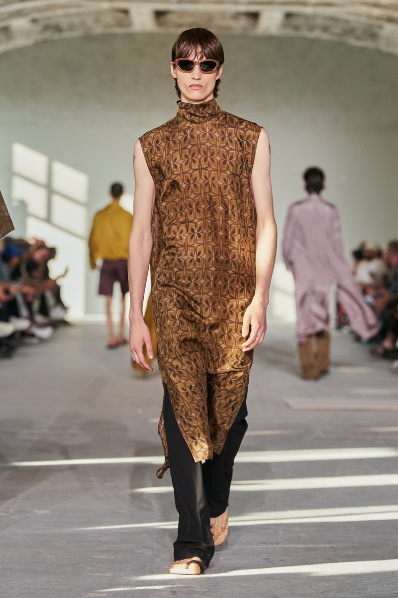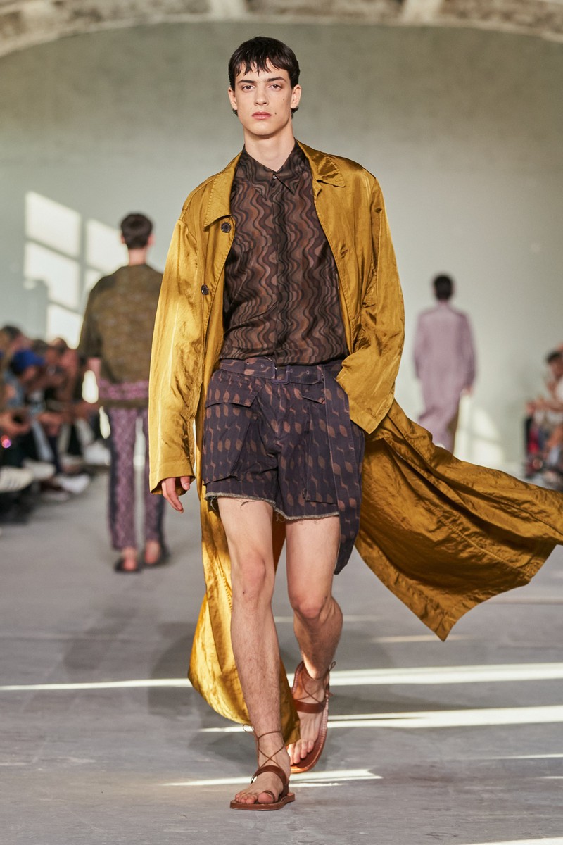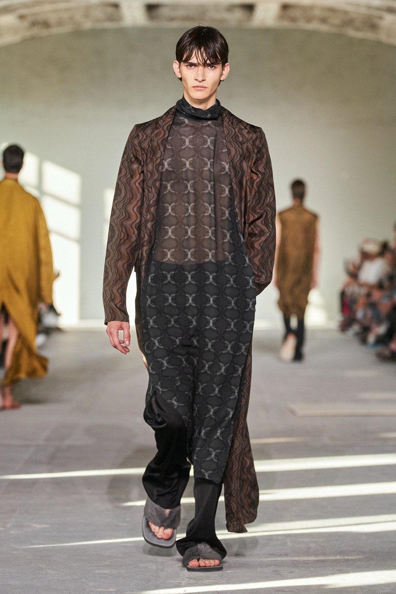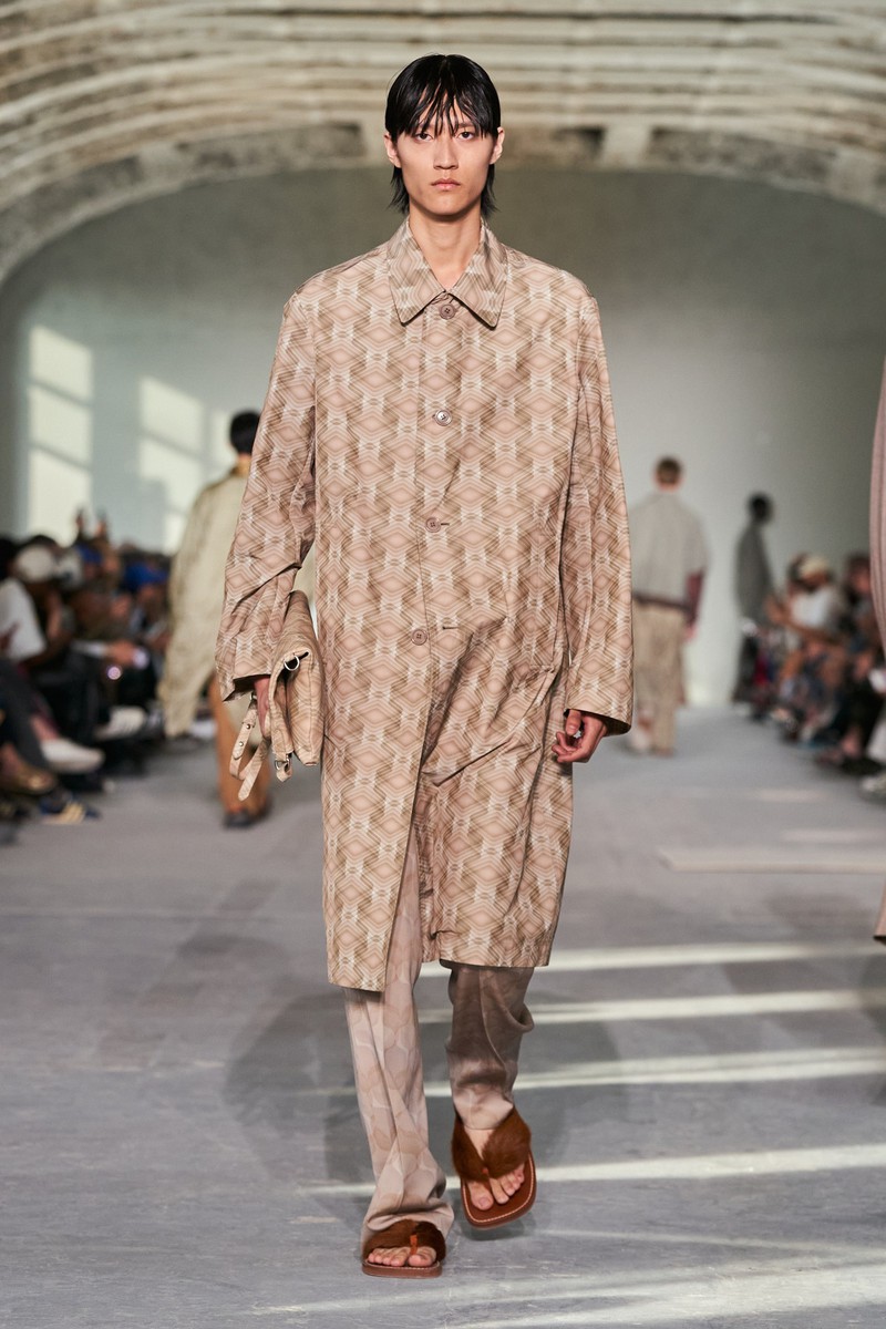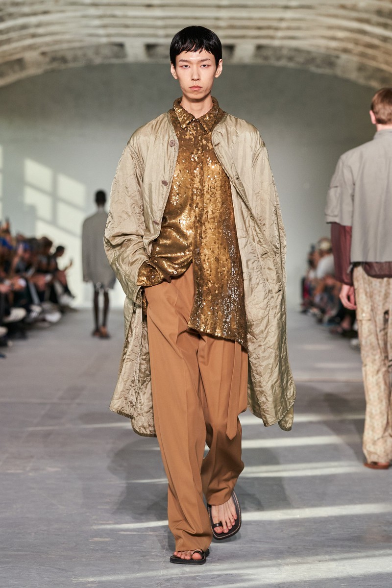 Dries van noten这场秀的地点选择在一栋废弃建筑中,空间的每一处表面上都混合着一层层灰泥、混凝土和油漆,与服装的奢华感形成强烈的对比。华丽的插肩大衣中的驼色和黑色两种色调为本系列定下了基调。Dries van noten对色彩的直觉是无与伦比的,而且绝不传统。波浪形、几何图案在古铜色、茄子色等色调的重叠下提供了视觉和触觉上的质感。