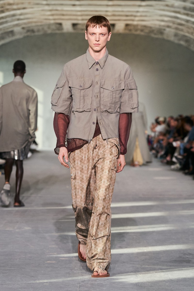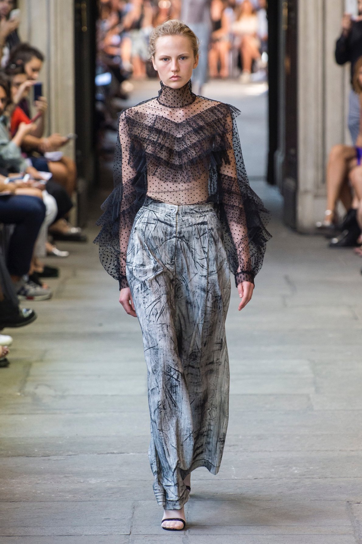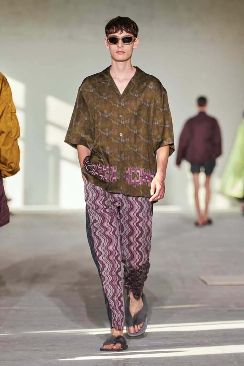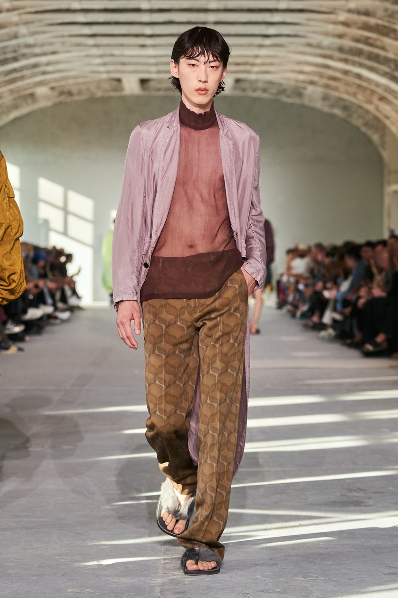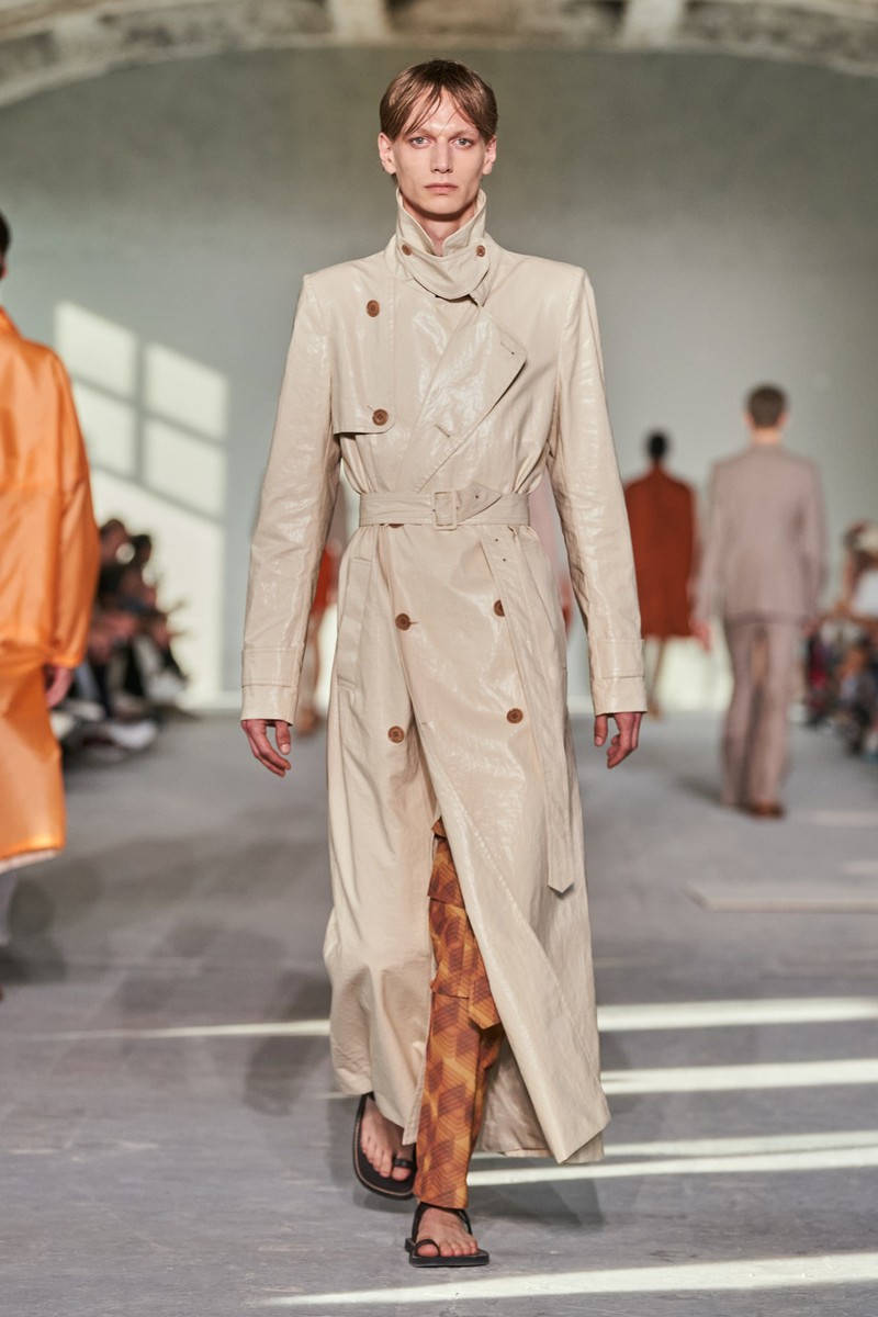 Dries van noten这场秀的地点选择在一栋废弃建筑中,空间的每一处表面上都混合着一层层灰泥、混凝土和油漆,与服装的奢华感形成强烈的对比。华丽的插肩大衣中的驼色和黑色两种色调为本系列定下了基调。Dries van noten对色彩的直觉是无与伦比的,而且绝不传统。波浪形、几何图案在古铜色、茄子色等色调的重叠下提供了视觉和触觉上的质感。