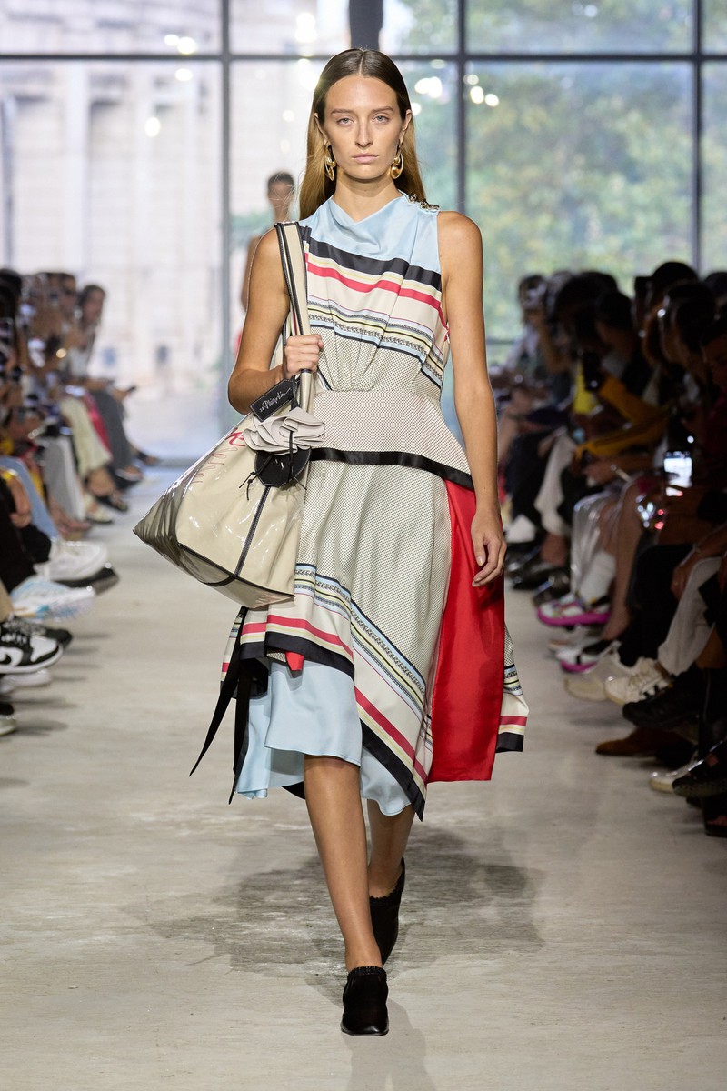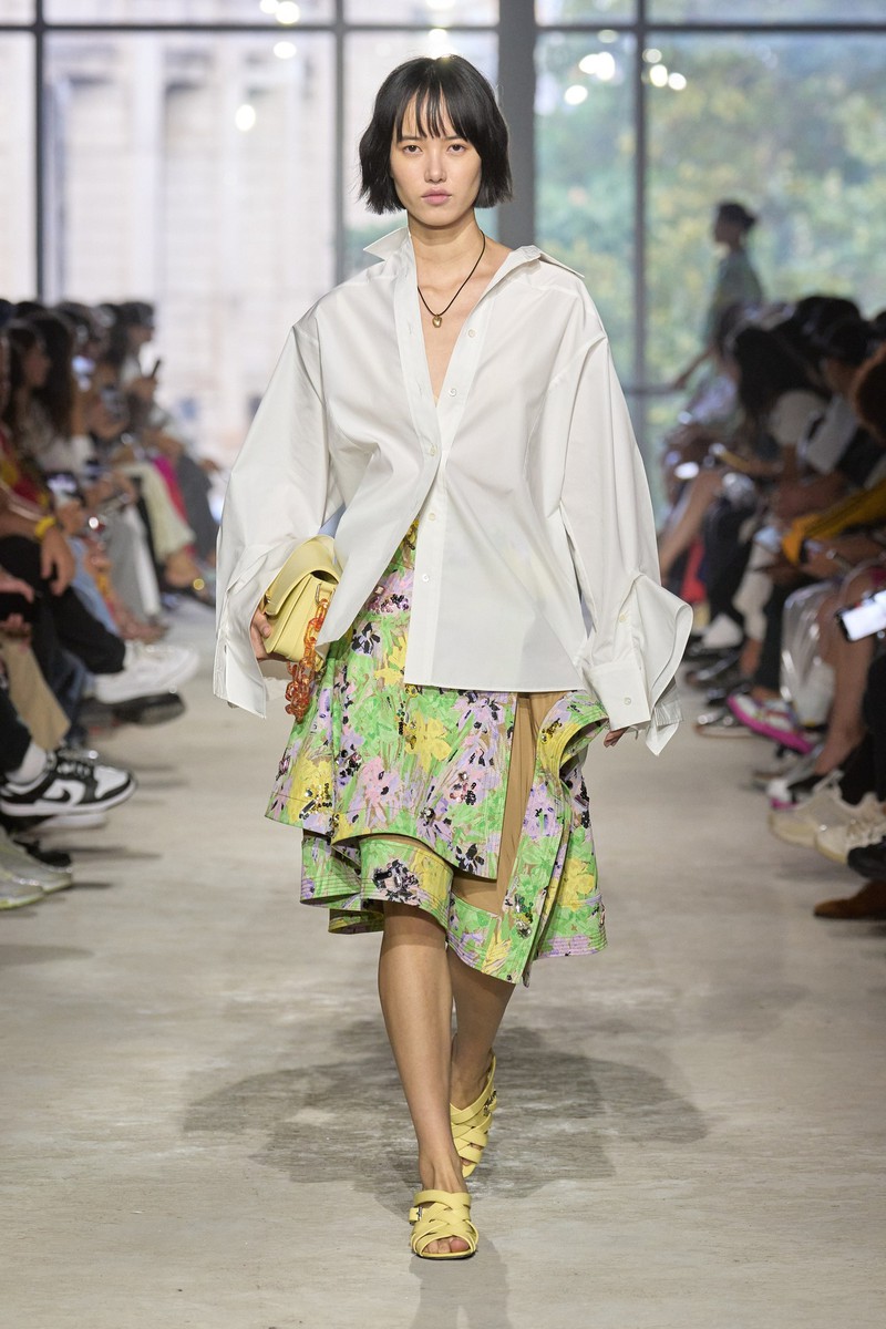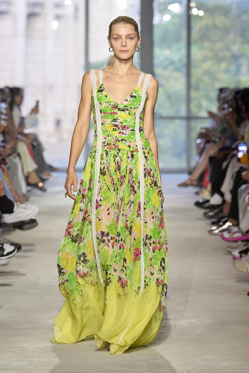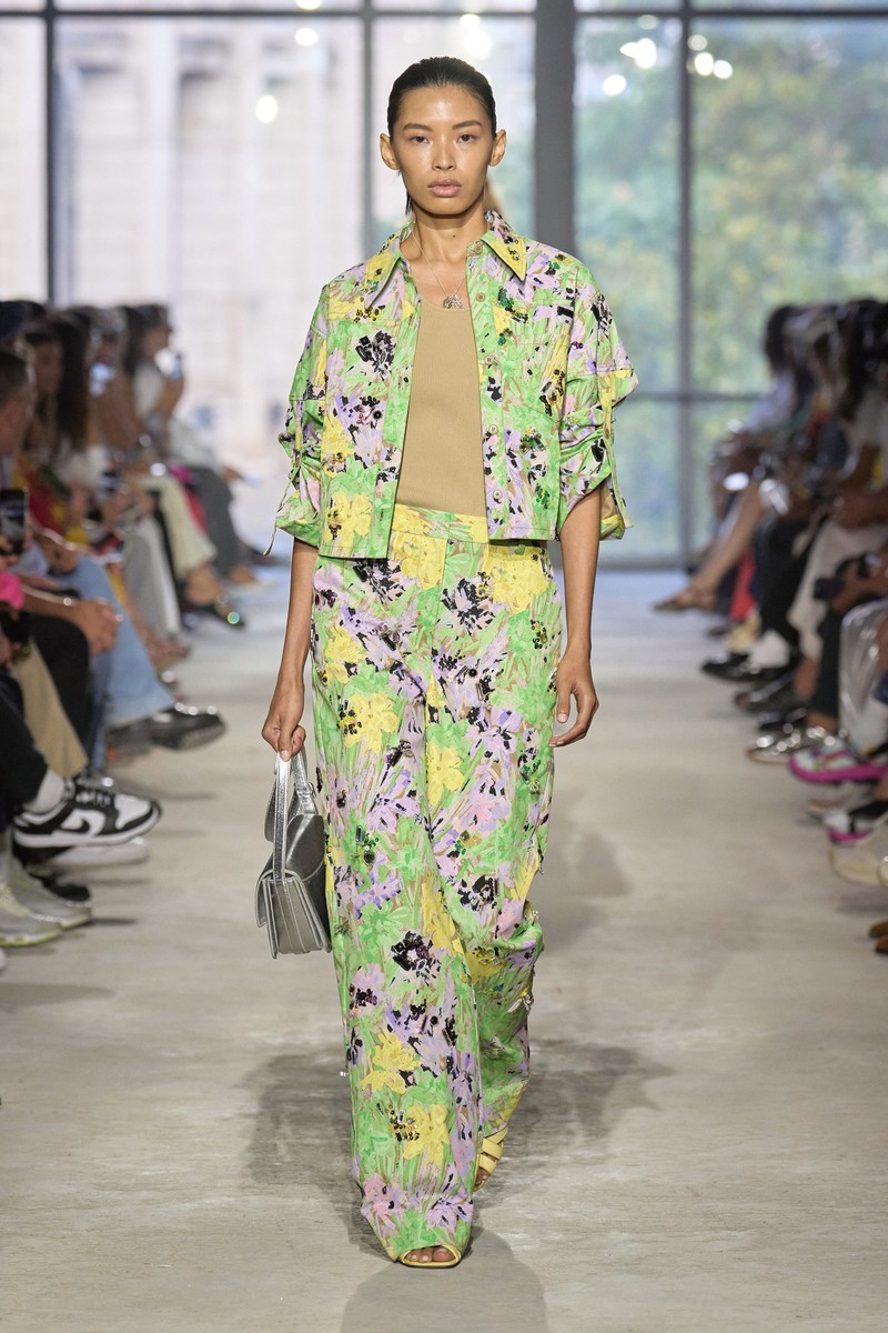带有特色的美式运动装,它以时髦的超阔腿卡其裤和非常规方式剪裁的牛仔夹克出现,轻盈的围巾图案连衣裙,图案灵感源自纽约建筑细节,还有大量的长裙,搭配繁茂花卉印花。