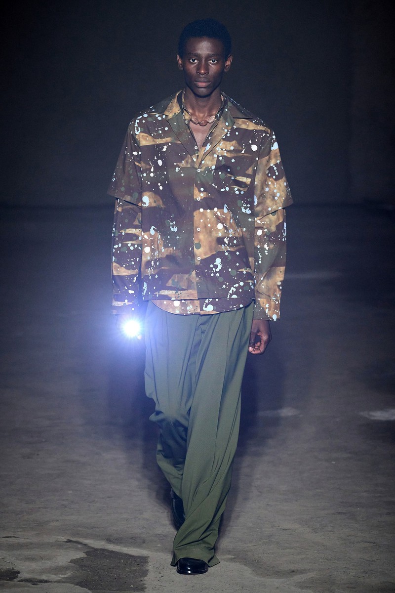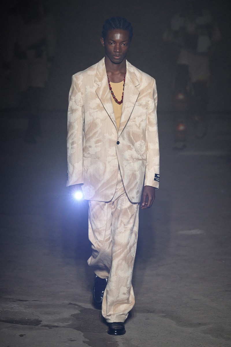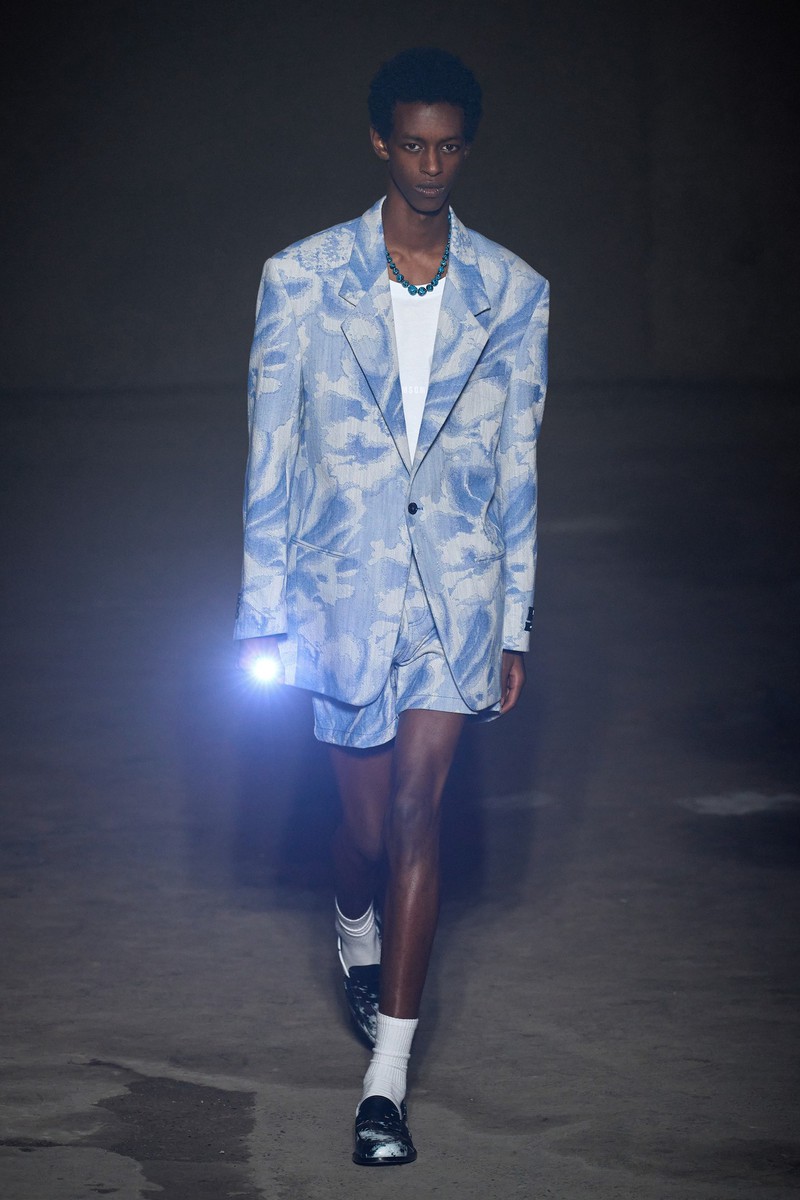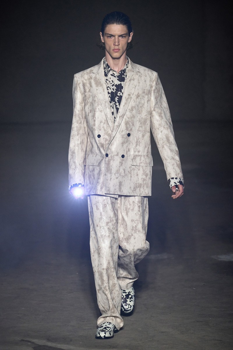 最近的一次坦桑尼亚之旅给 Massimo Giorgetti 留下了深刻的印象;他用 iPhone 拍摄的黎明、日落和天空的照片,色彩如此强烈,仿佛是人工智能生成的,这些照片被印在他的2024春季男装上。紫丁香色、淡蓝色、沙米色和平静白色的稳重色调,与带着这些艺术气息的图案搭配在一起。