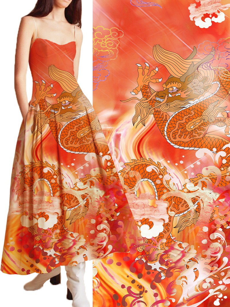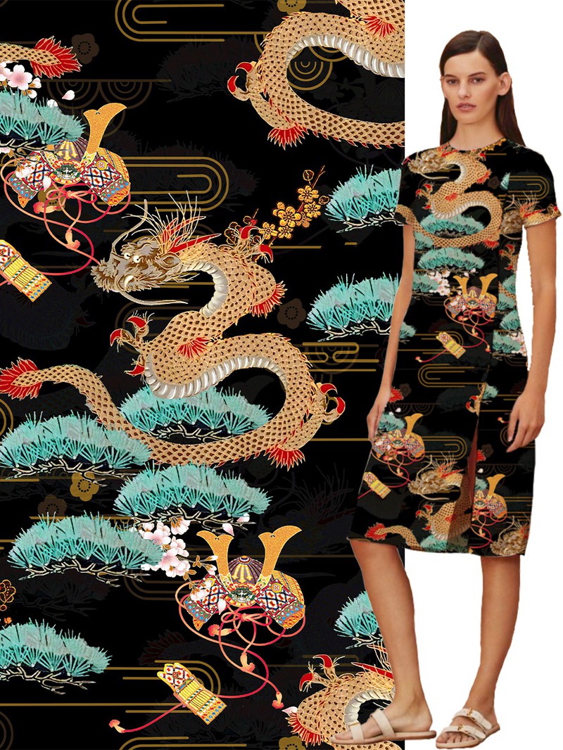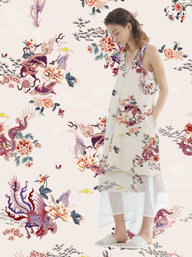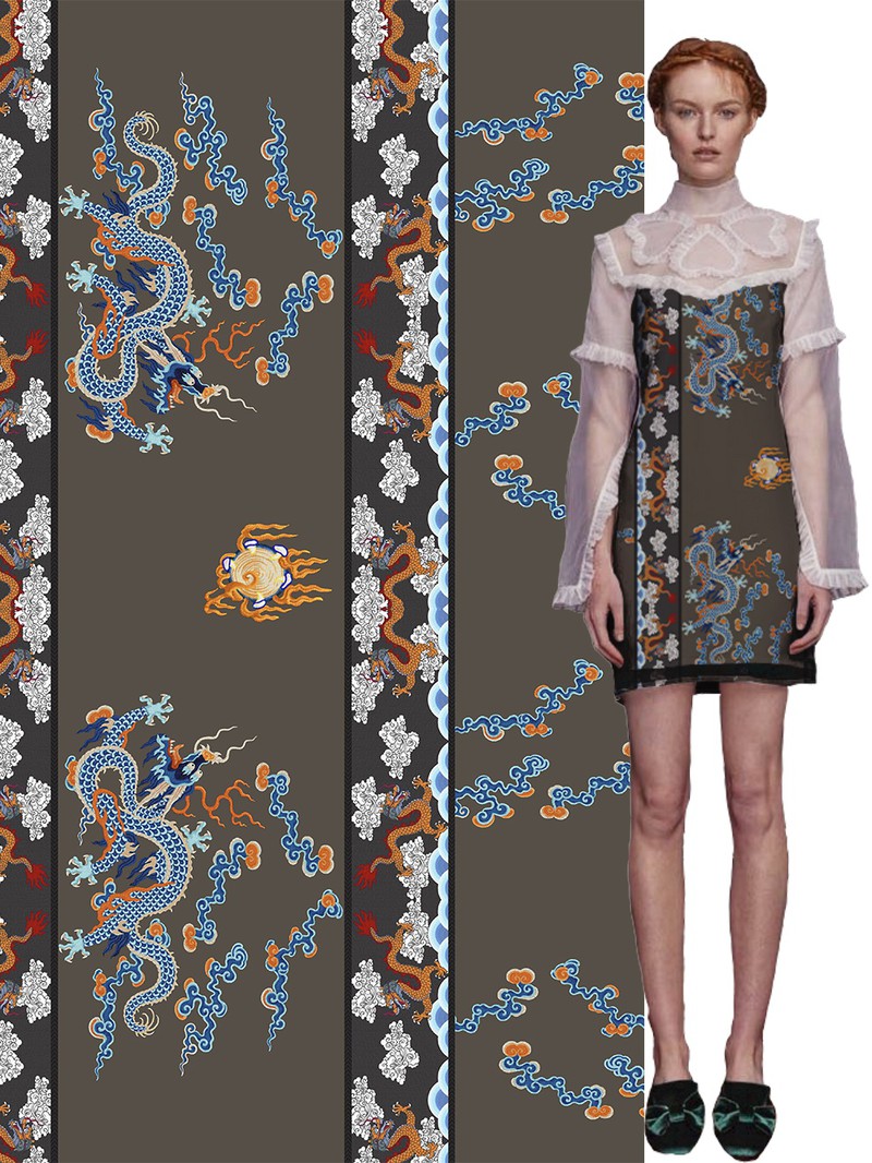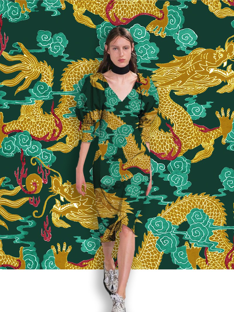 真丝面料上的印花是它最重要的一部分,东方的传统文化吸引着设计师,其中龙元素被中国风的服装广泛运用,带来一波中式国潮的流行。