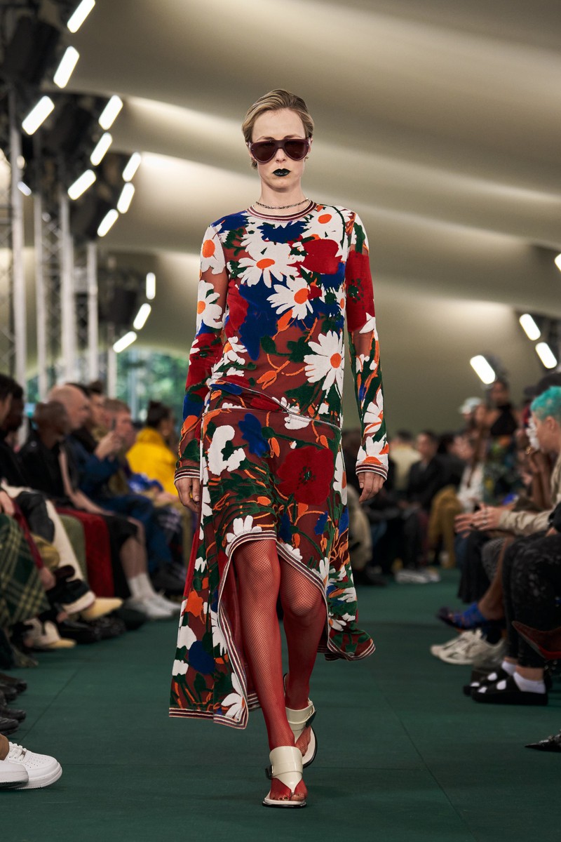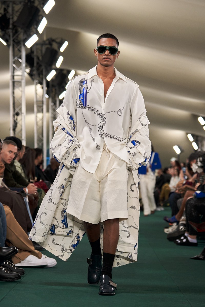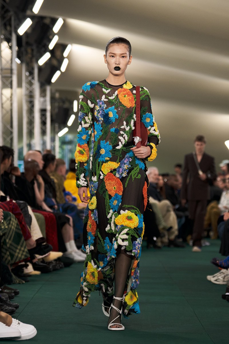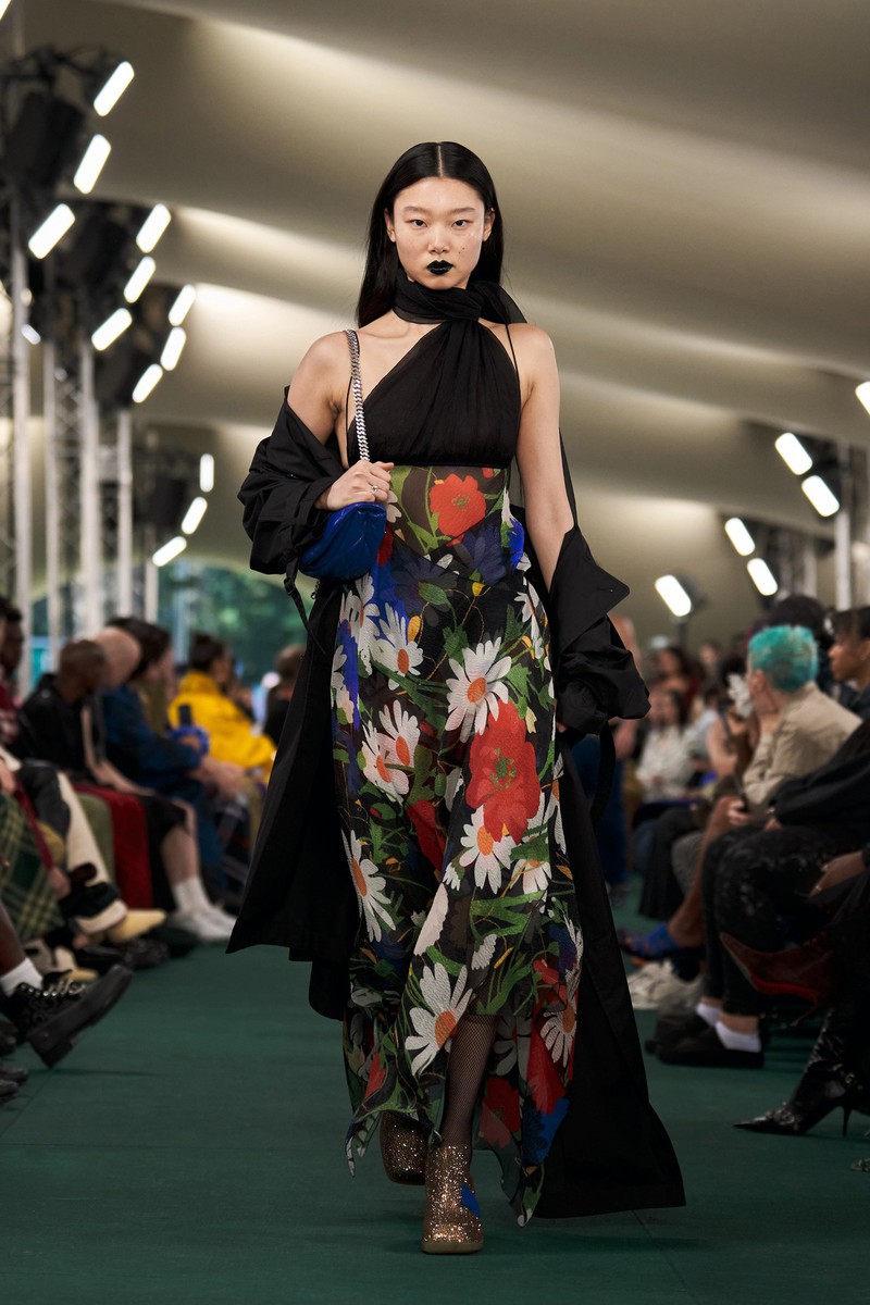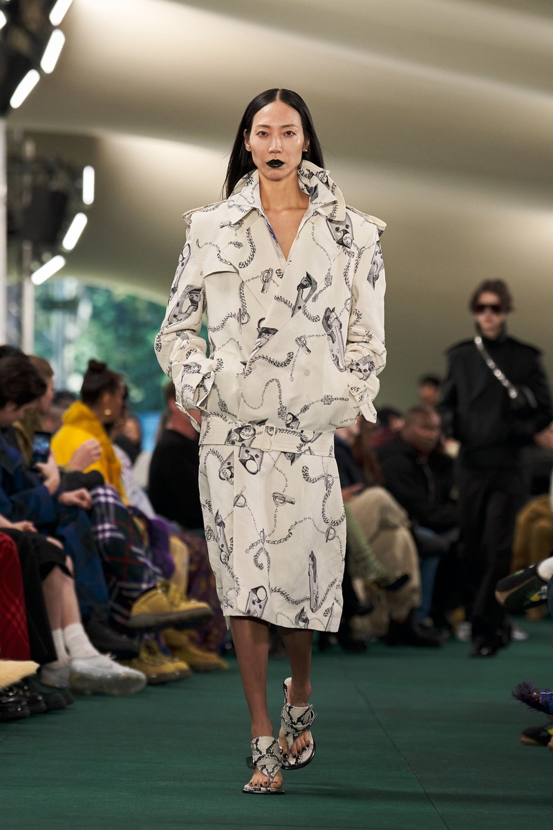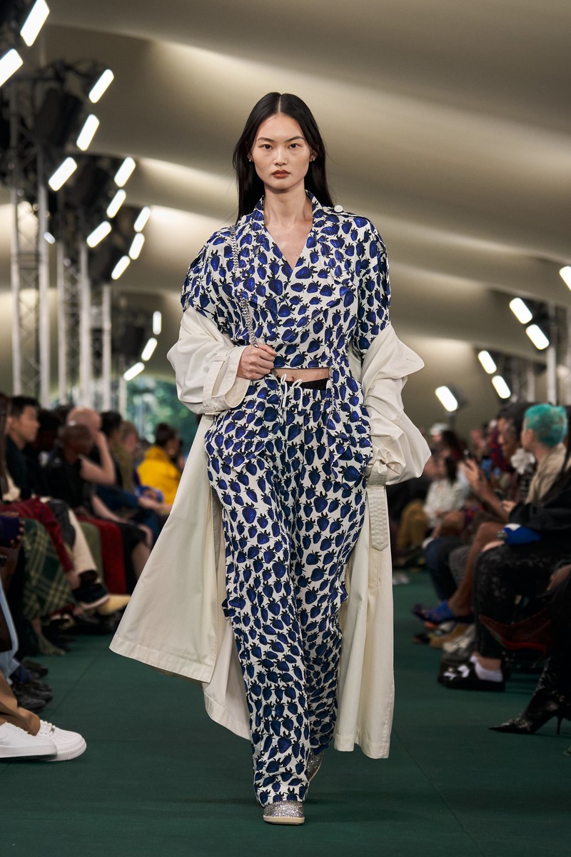首先他拆解了 Burberry 的马背骑士标志,连衣裙、男士衬衫和外套上的围巾印花,实际上是由骑士马形状的金属登山扣和耐用的银链组成。也有一些时刻致力于英国夏季花卉和水果,层叠的蓝色草莓、放大的草地花卉图案。