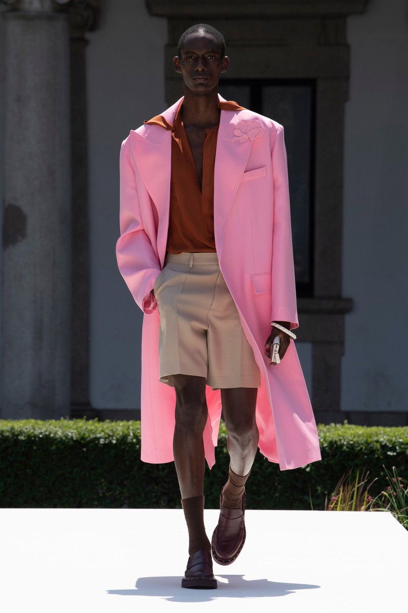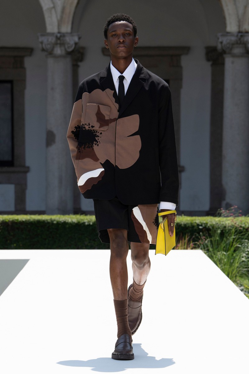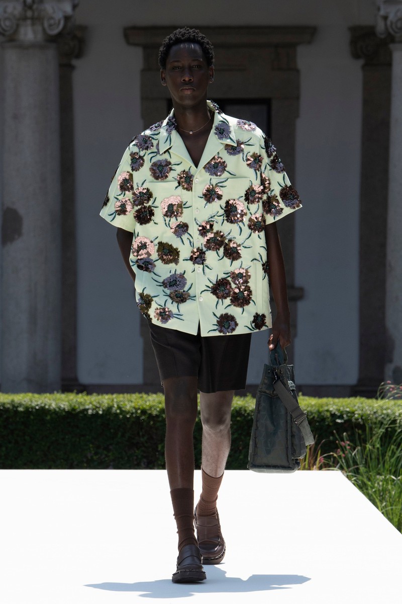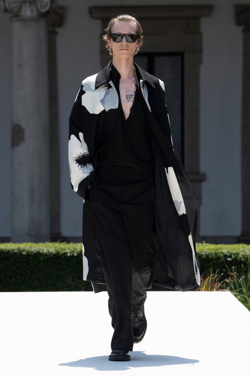 Valentino 2024春夏男装在米兰公立大学 La Statale 的花园里上演,该大学位于一栋美丽的文艺复兴时期建筑内。该系列通过温和的方式巧妙地颠覆了经典男性形象风格。设计师柔化了四四方方的西装外套的比例,在翻领上刺绣了花朵,或者在轻快的轻便夹克和直筒衬衫上印上了放大的花朵。薄荷绿、覆盆子色、绿松石色和亮粉色与黑白交替——强调了个人活力感和浪漫自由的态度。