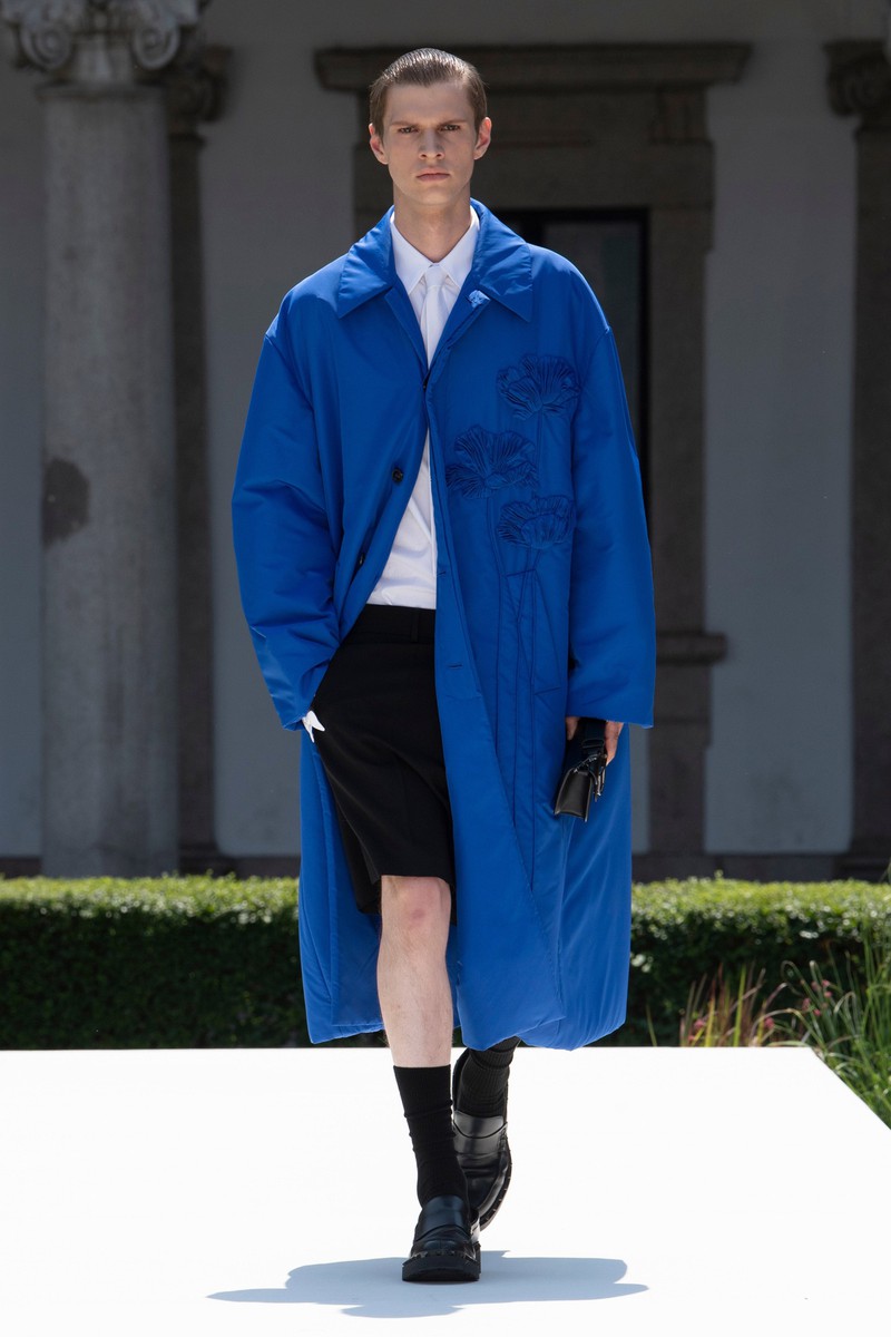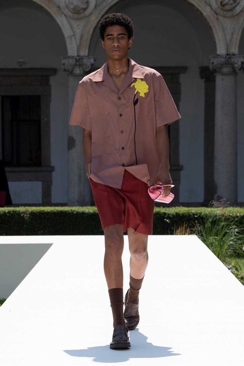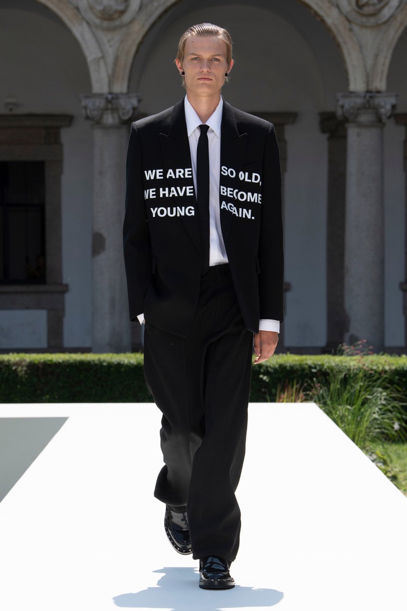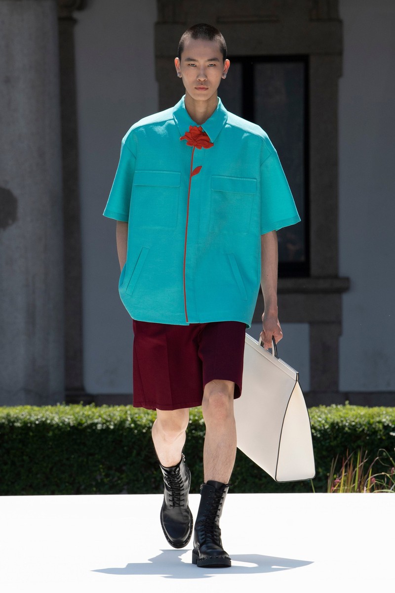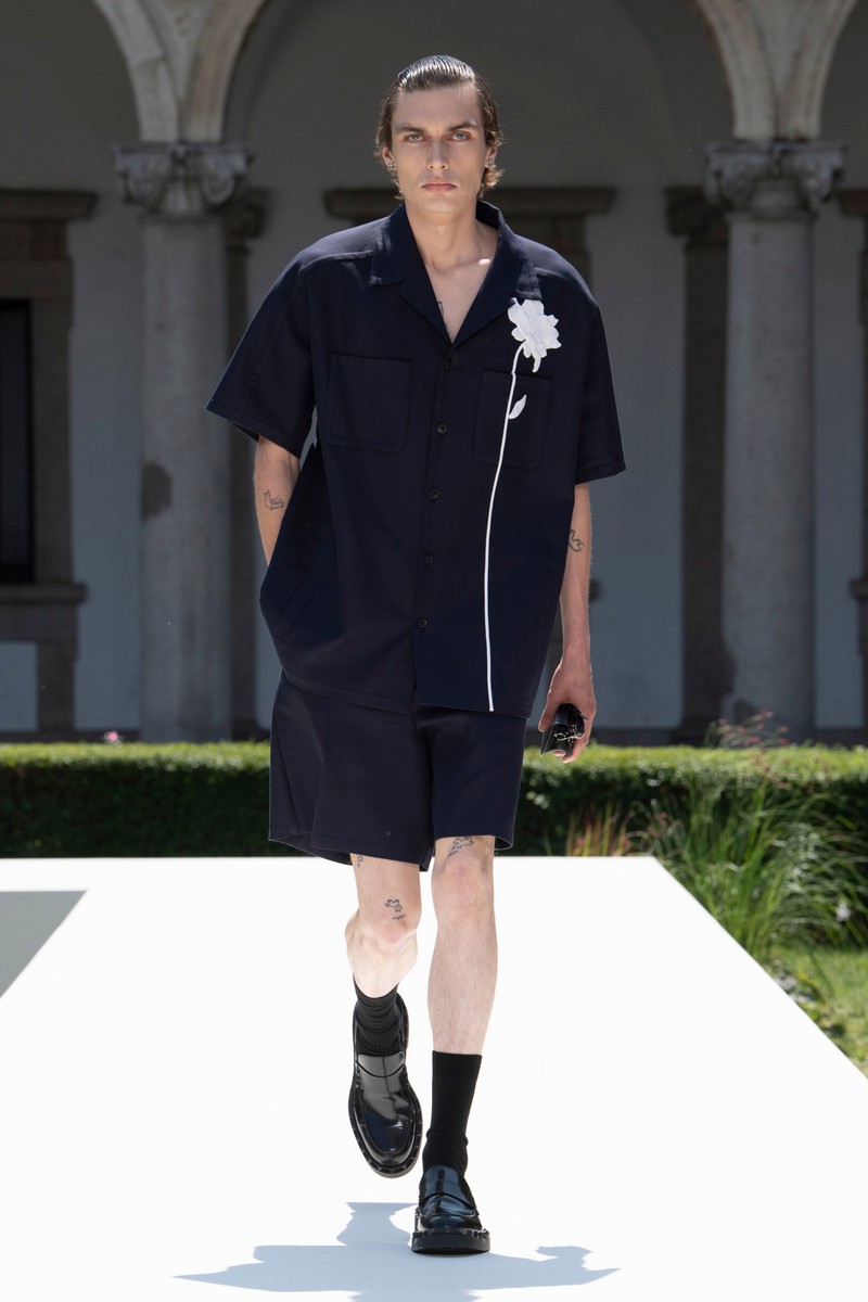 Valentino 2024春夏男装在米兰公立大学 La Statale 的花园里上演,该大学位于一栋美丽的文艺复兴时期建筑内。该系列通过温和的方式巧妙地颠覆了经典男性形象风格。设计师柔化了四四方方的西装外套的比例,在翻领上刺绣了花朵,或者在轻快的轻便夹克和直筒衬衫上印上了放大的花朵。薄荷绿、覆盆子色、绿松石色和亮粉色与黑白交替——强调了个人活力感和浪漫自由的态度。