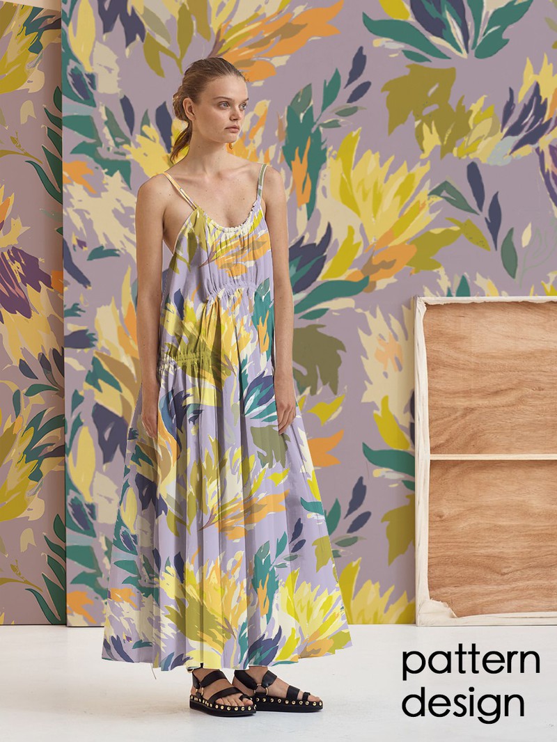 手绘风格抽象花卉是年轻女装最佳图案,搭配活力的色彩为春夏季节