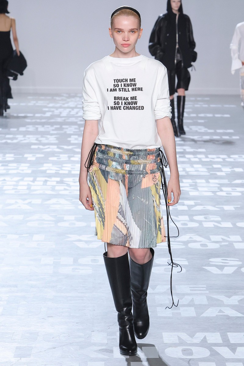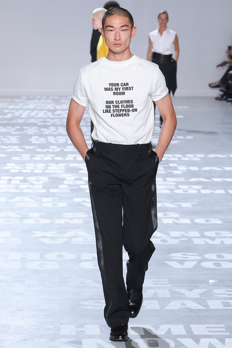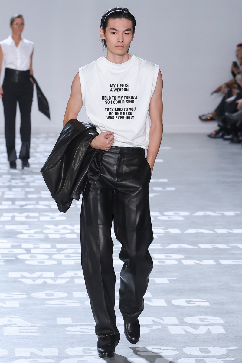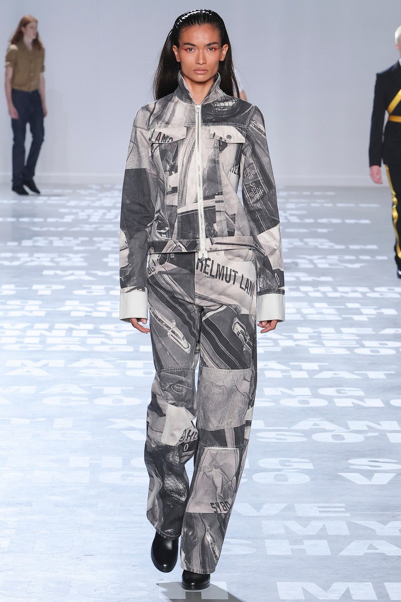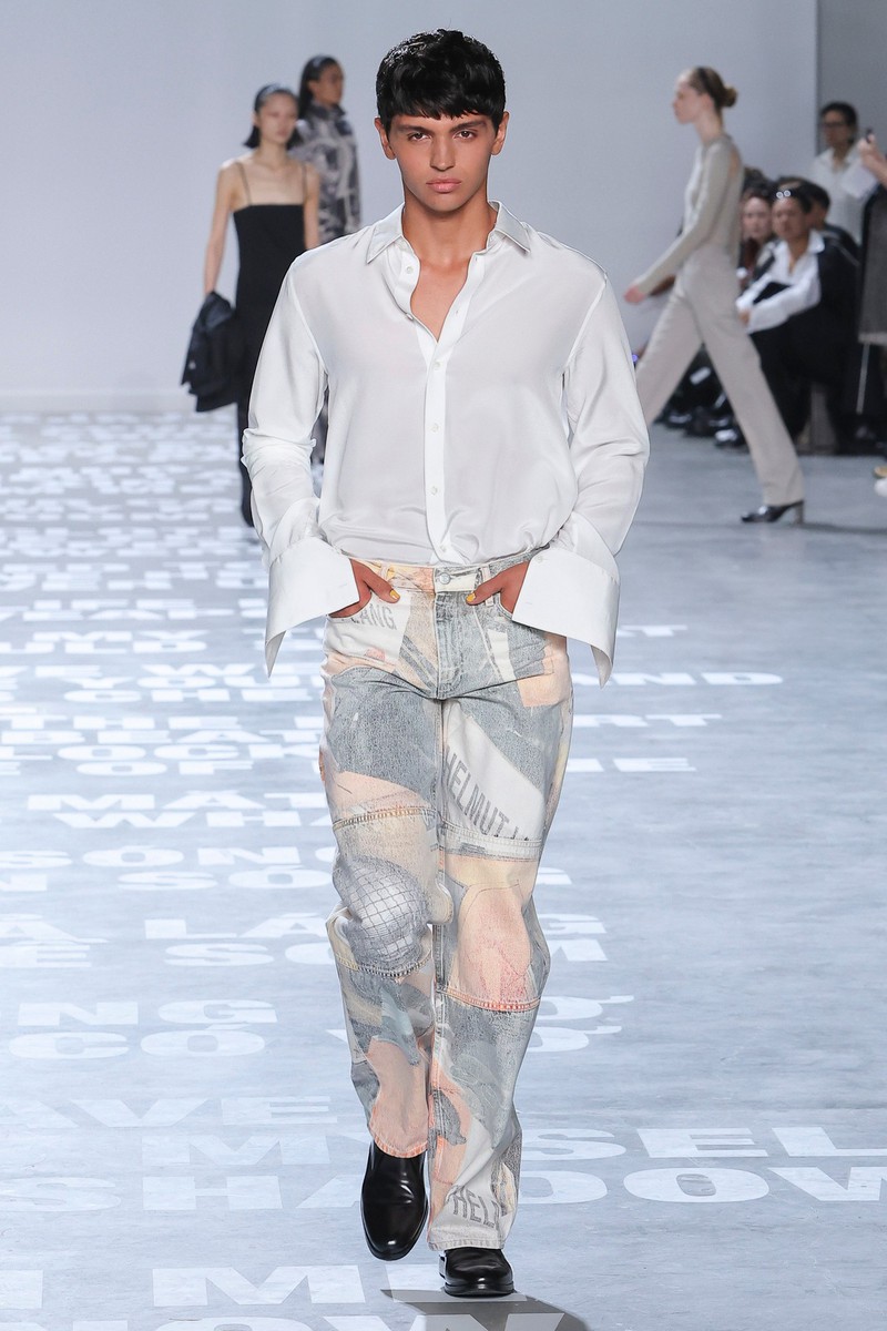 男女装的界限越来越模糊,印花图案的运用也可以跨领域,Helmut Lang 2024春夏秀场上的复古海报拼贴印花以黑白和黄色调的简约色调为服装添彩,尤其是与女装褶皱面料的结合。