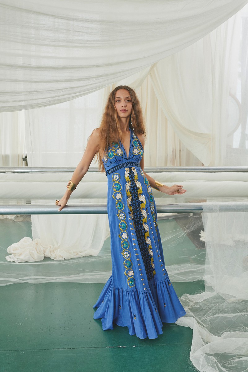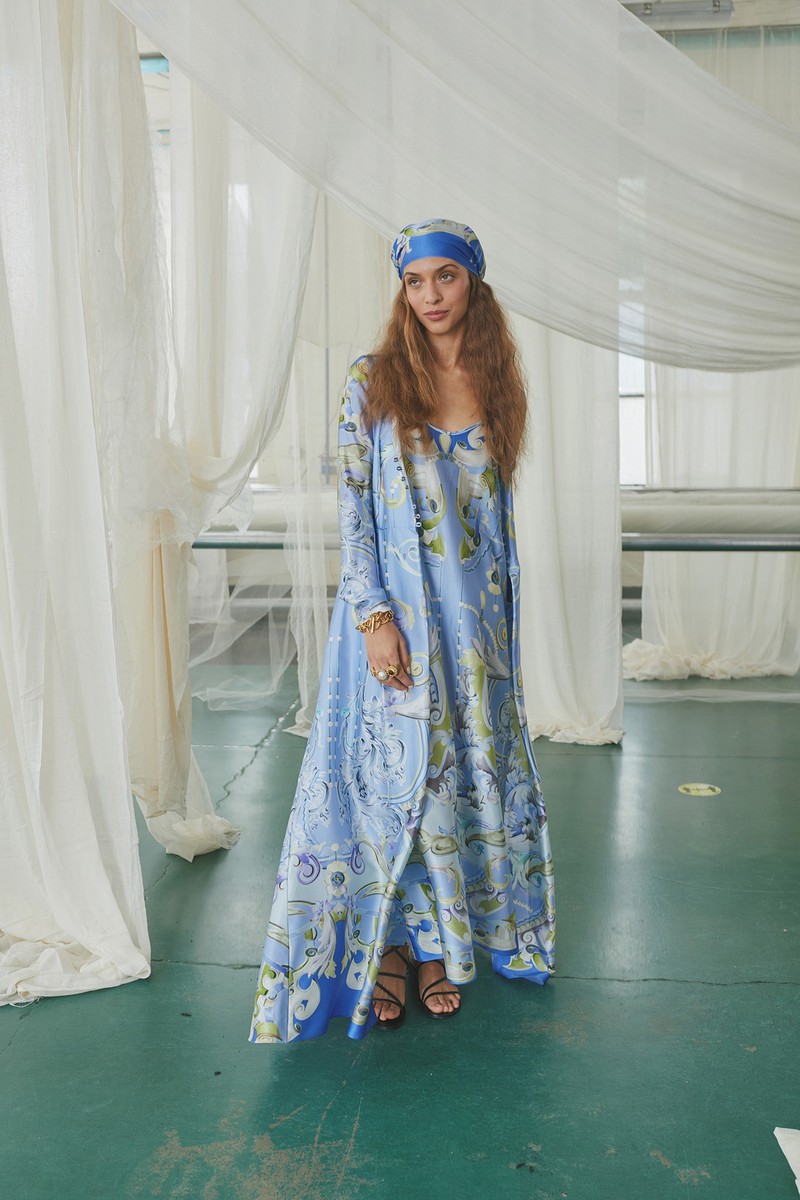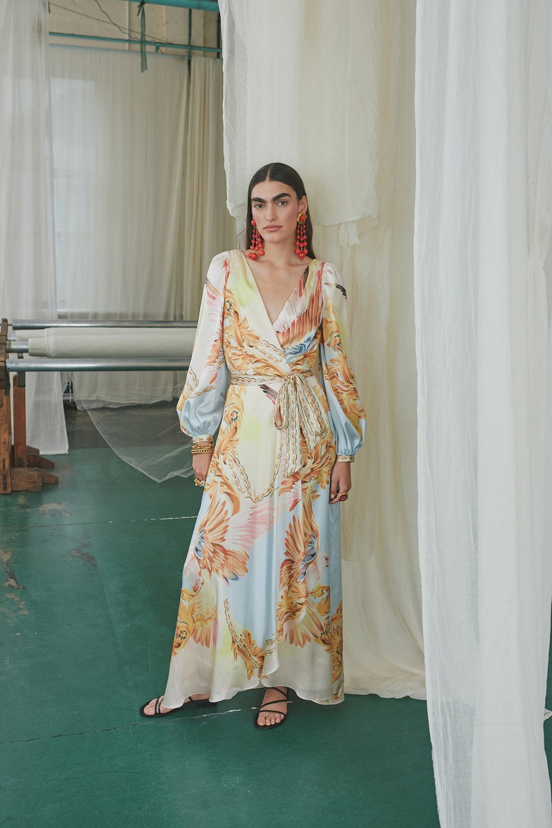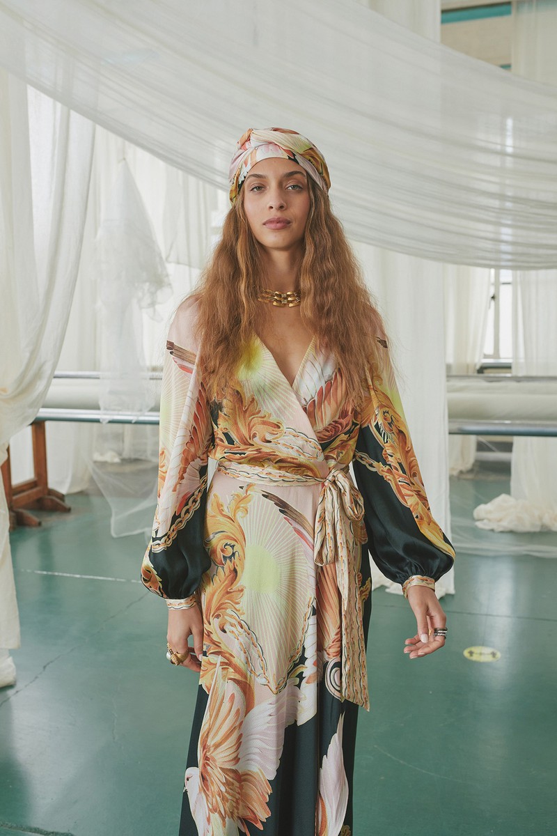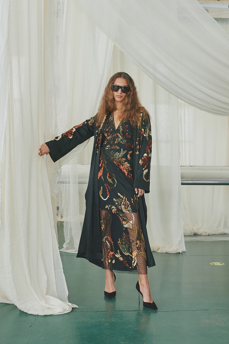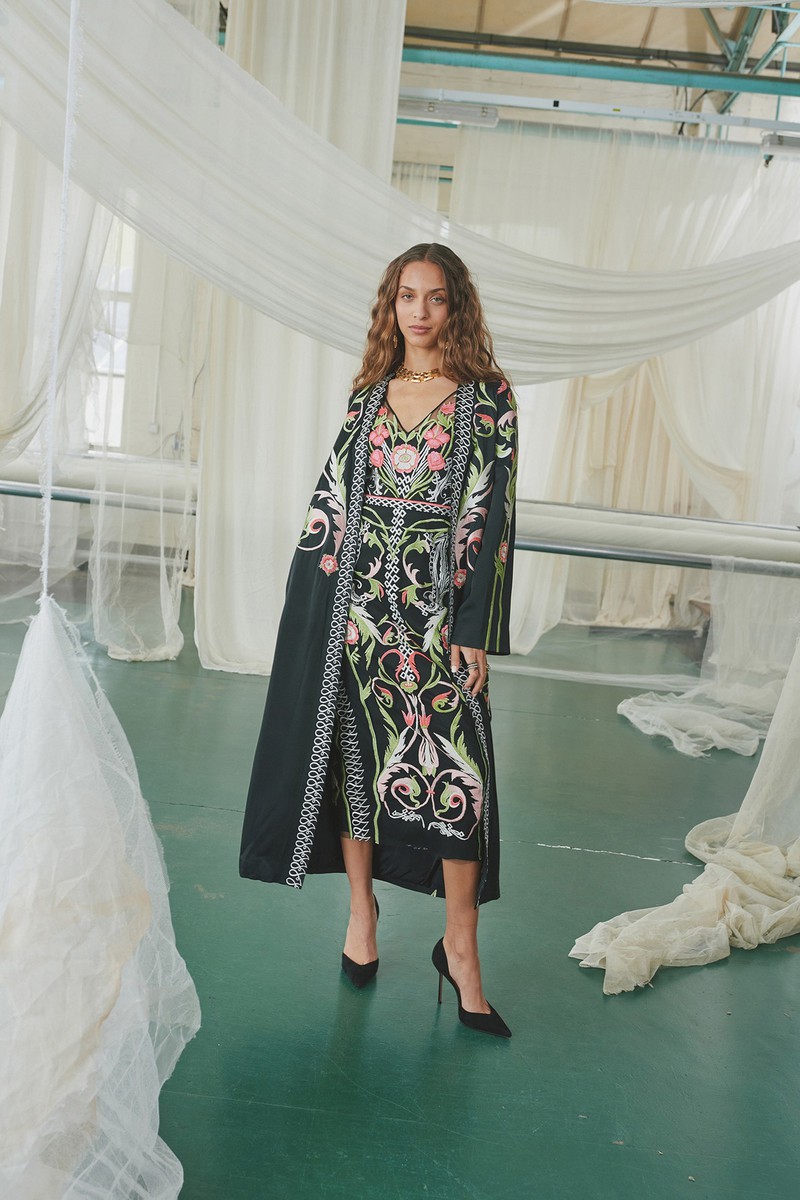 弹力丝绸和纽扣亚麻连衣裙采用手绘玫瑰、亮片装饰的书法以及带有珍珠、兰花和华丽边框的壁画设计。该品牌的刺绣图案被重新演绎为感性的透明连衣裙和和服风格的家居服,并进行了全新的诠释。