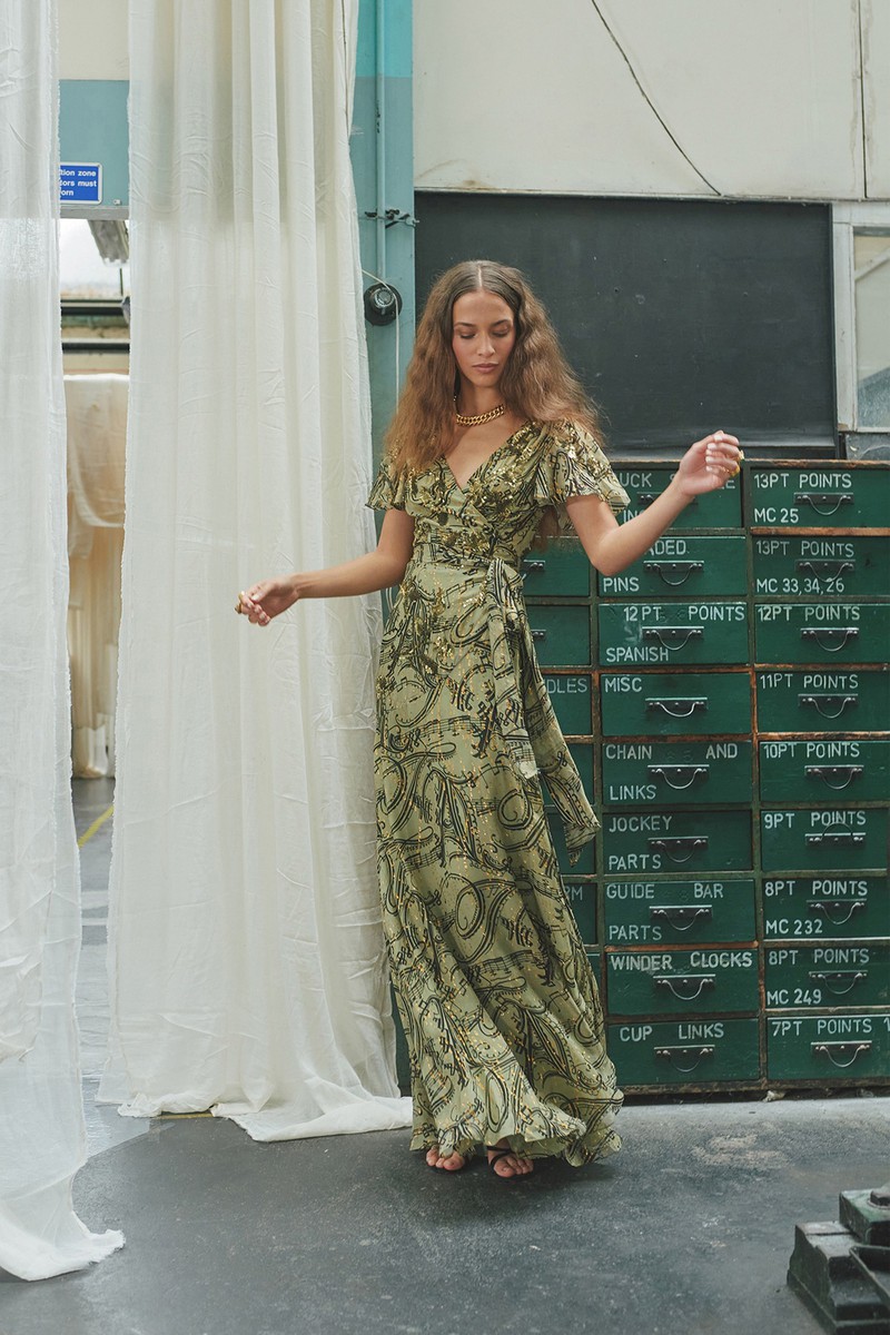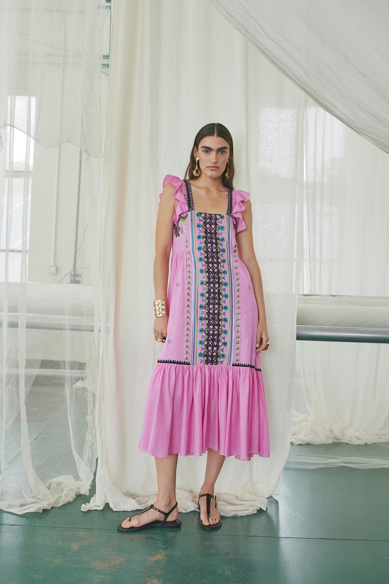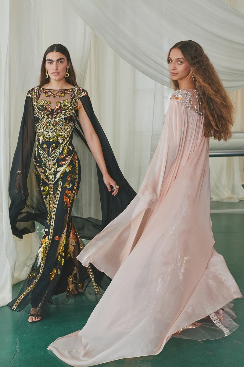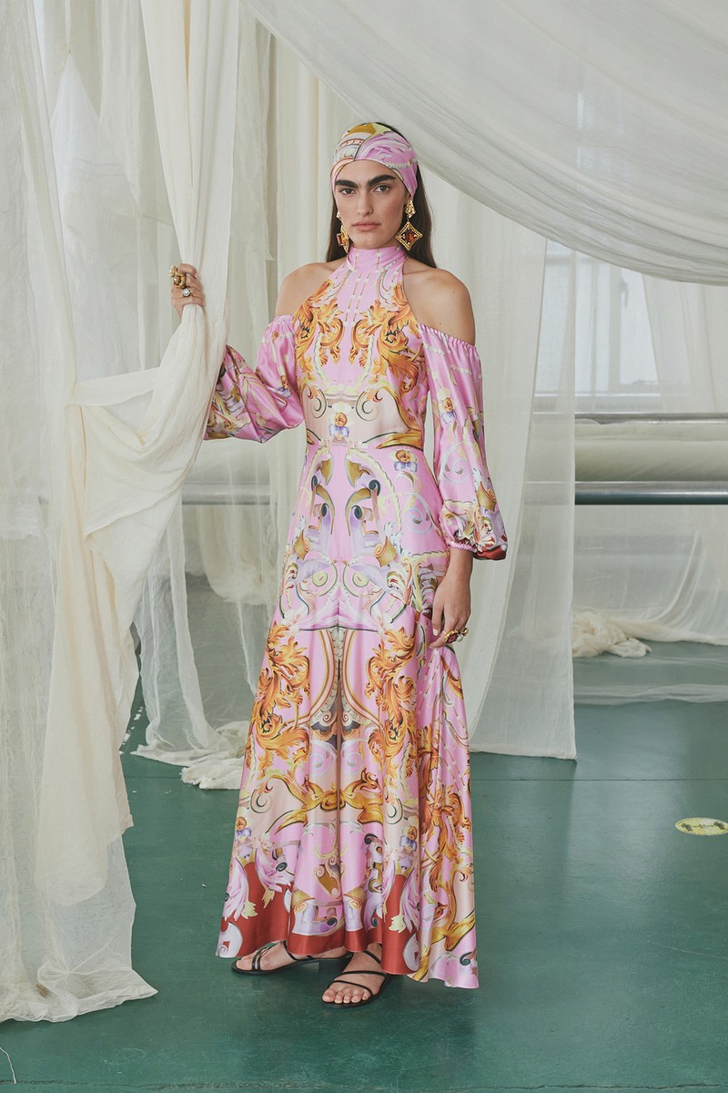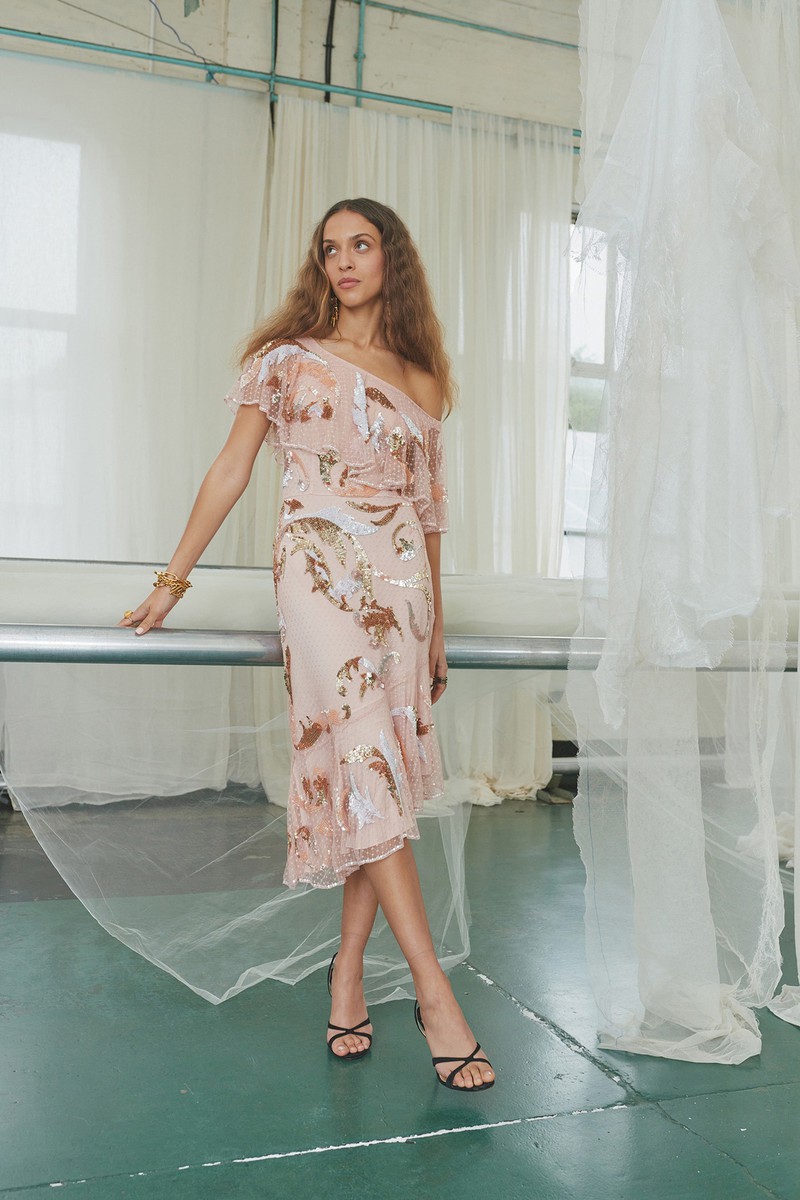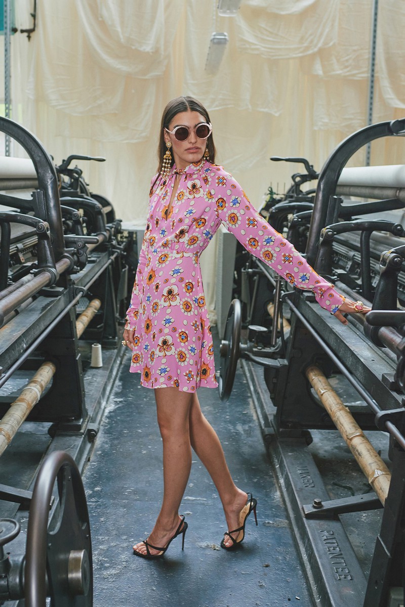 弹力丝绸和纽扣亚麻连衣裙采用手绘玫瑰、亮片装饰的书法以及带有珍珠、兰花和华丽边框的壁画设计。该品牌的刺绣图案被重新演绎为感性的透明连衣裙和和服风格的家居服,并进行了全新的诠释。