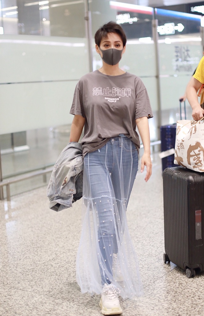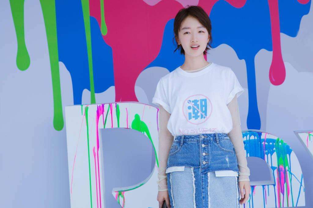 周冬雨穿着一身“潮”字Tee搭配牛仔半裙和高跟鞋出席活动