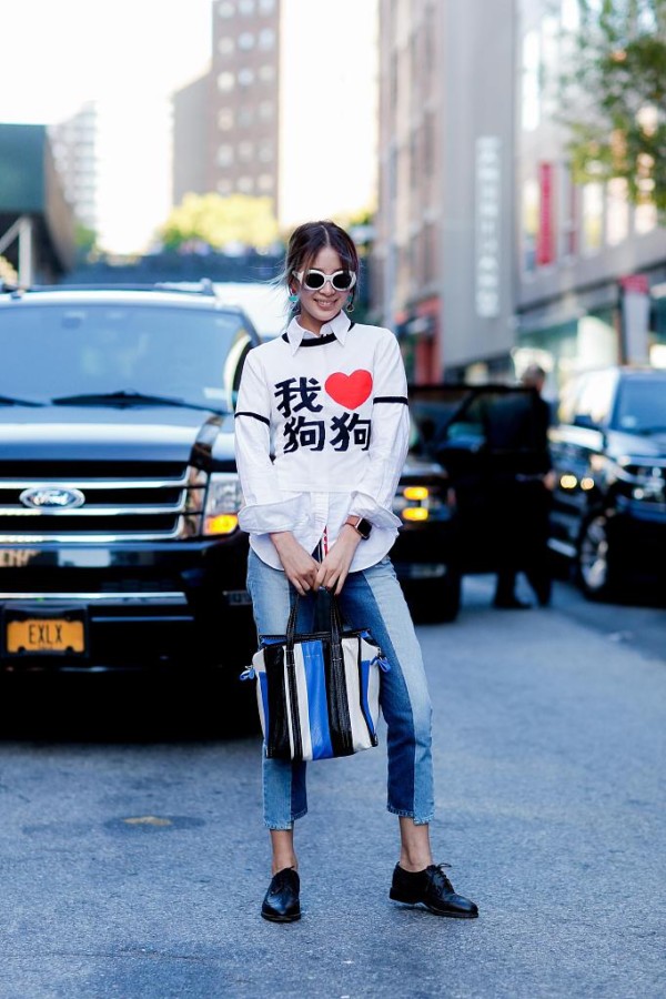 韩国著名时装博主Irene Kim身穿中文我爱狗狗的Tee,搭配Balenciaga包做街头混搭风