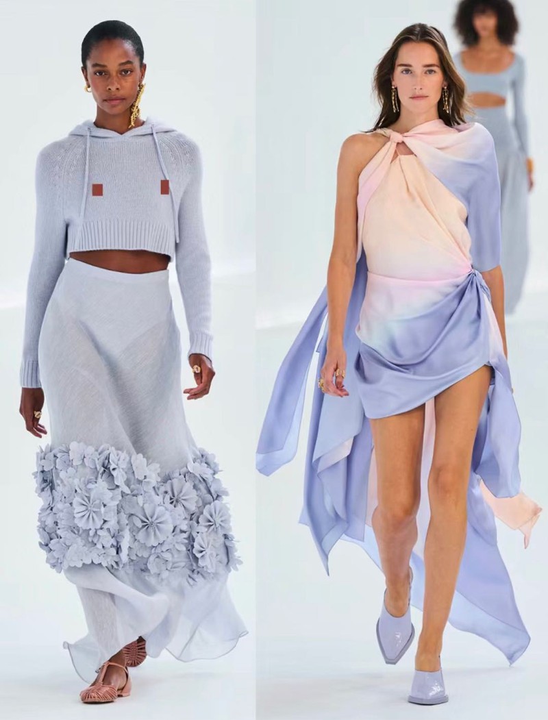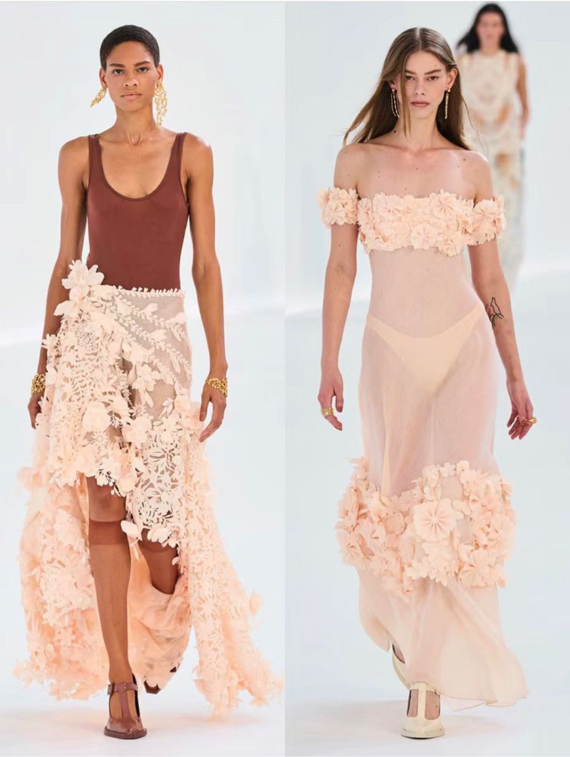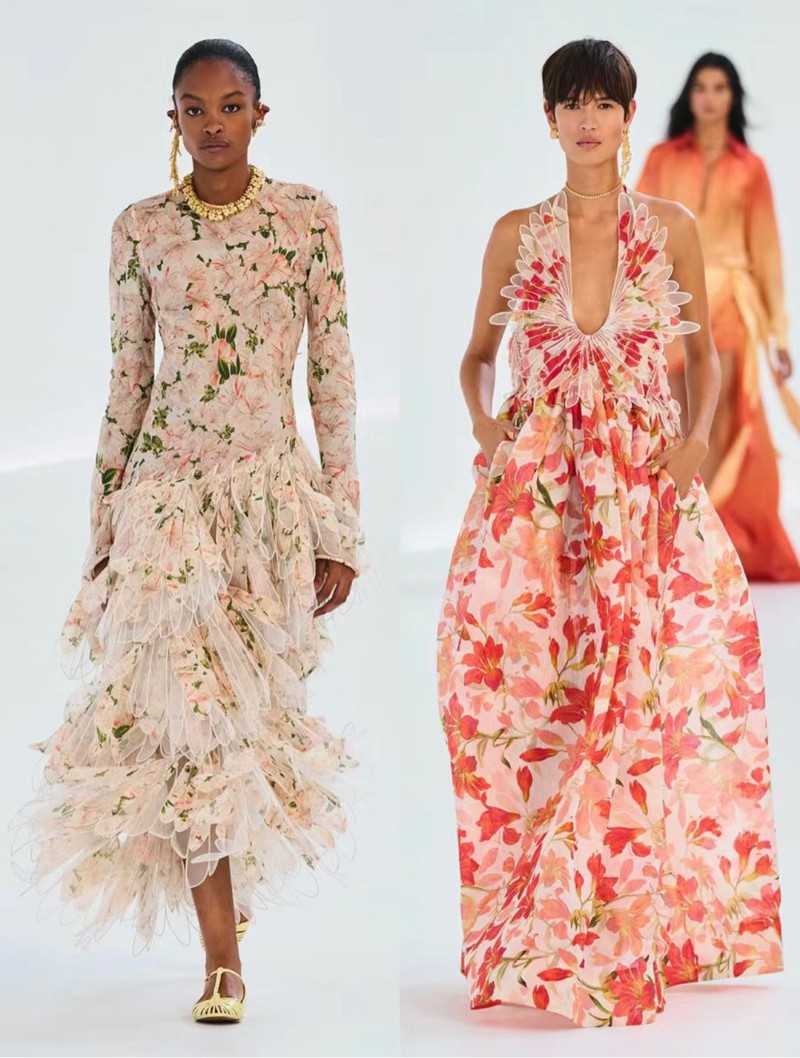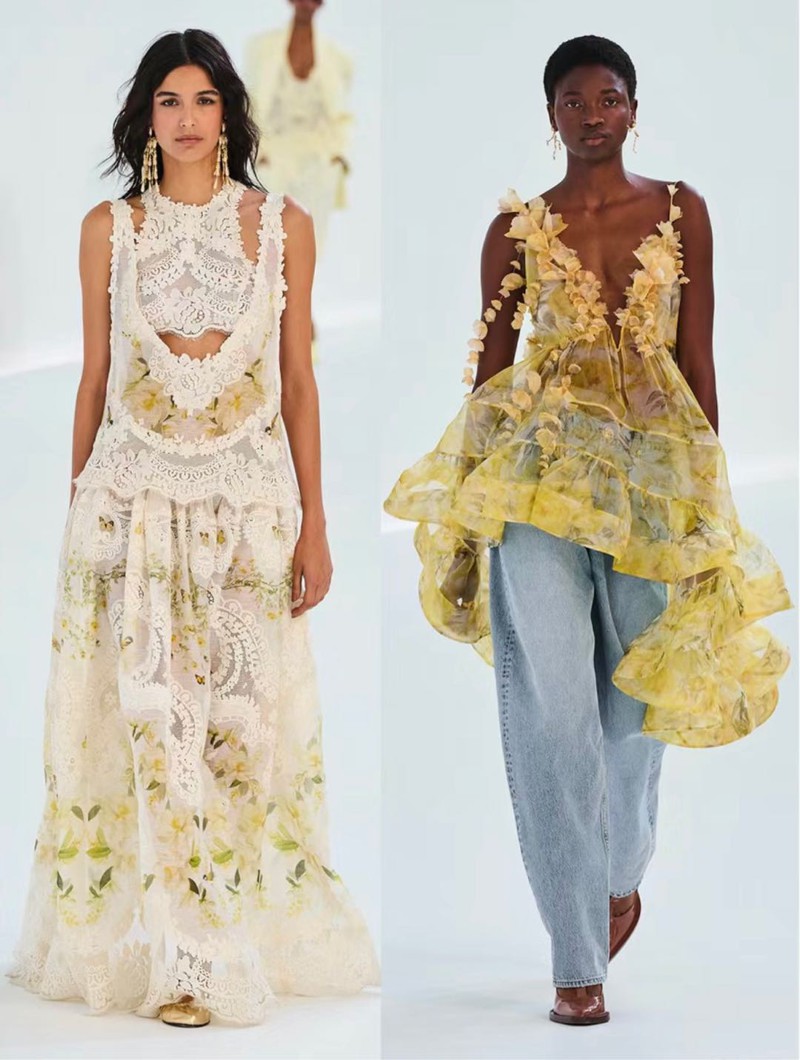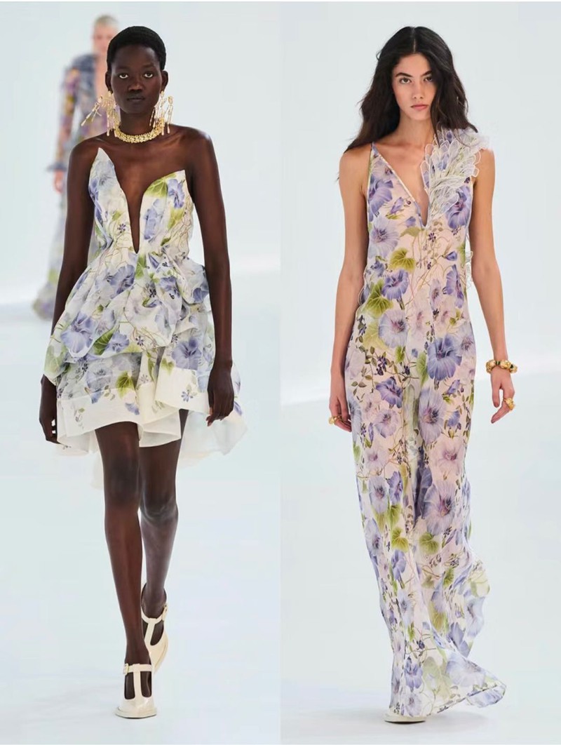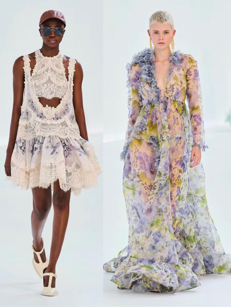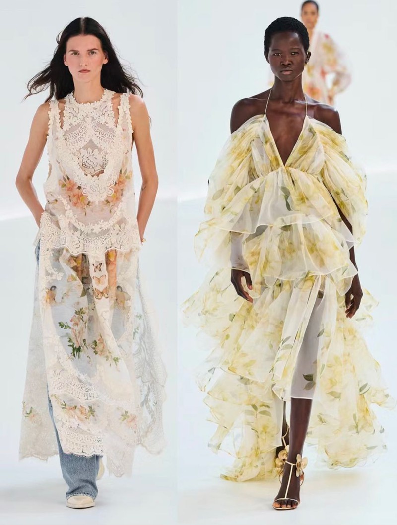 Zimmermann品牌以轻松充满激情的设计风格而著称。2024 春夏系列展示了多层次的连衣裙,运用渐变的紫罗兰色、橙色和淡黄色抽象景观补丁,散发出活力四溢的感觉。露背的花朵裙和衬衫裙经过特殊处理,呈现出洗过和褪色的效果,增添了别致魅力。