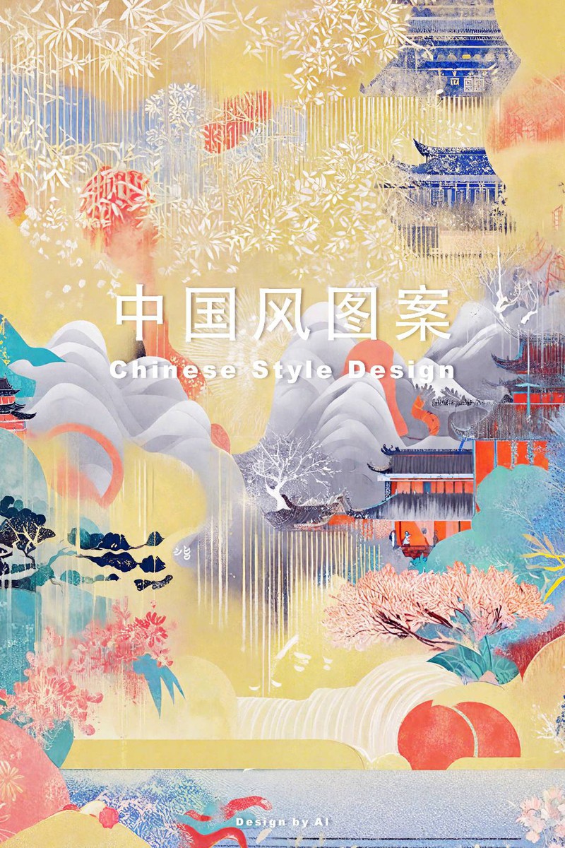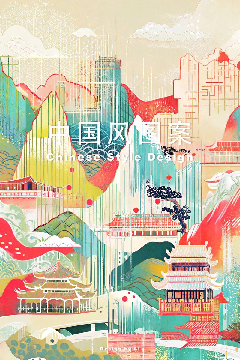 中国风图案欣赏,图案中融入了古代建筑、山水、树木等多种元素,整体色调比较唯美。