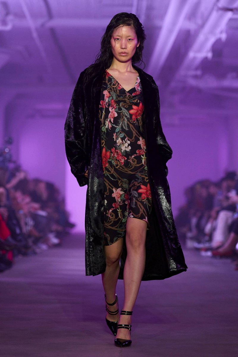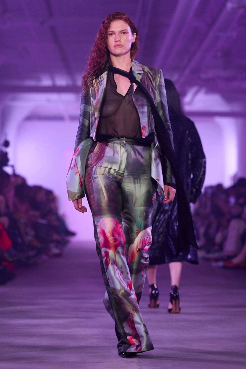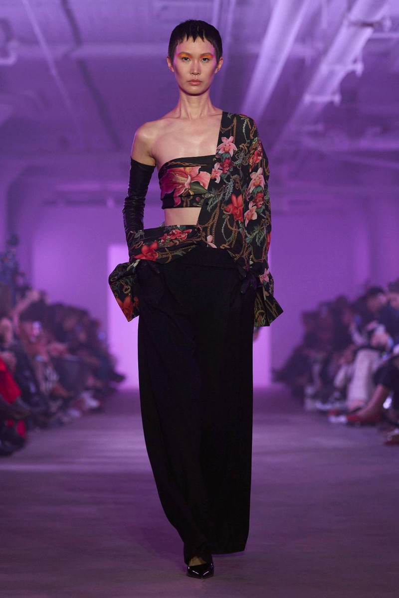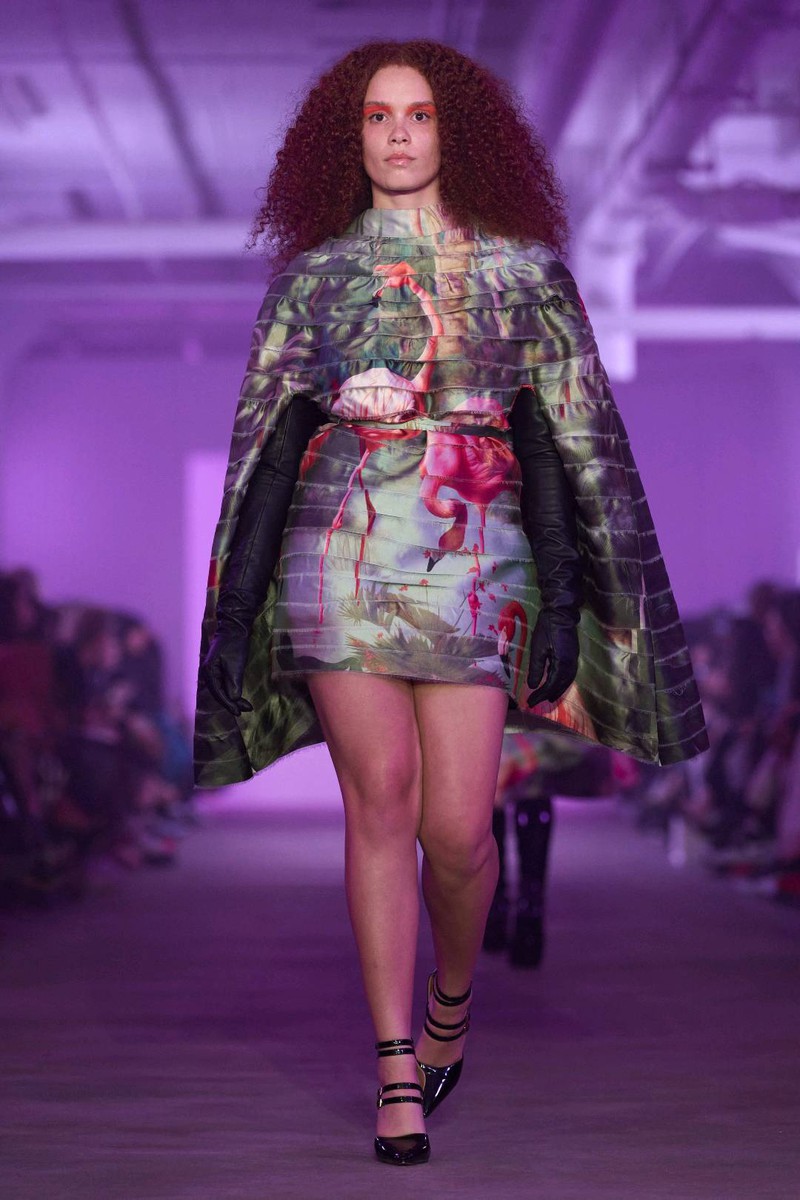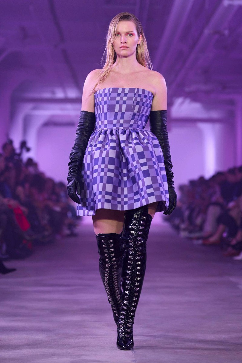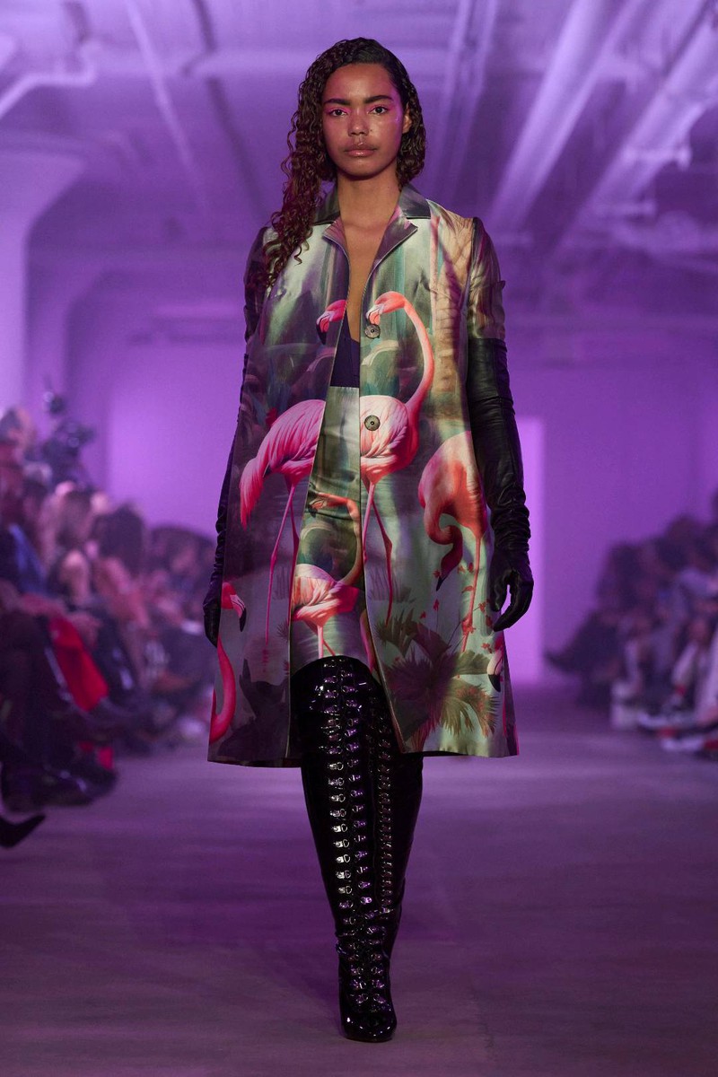Bach Mai秋冬 2024 高级成衣紫色的氛围下,娇艳的花卉与链条在黑色的底色衬托下格外的耀眼绿色热带雨林下的火烈鸟在油画风格意境中踏水紫色系的菱形格面料做的各个款式的裙装与大衣与氛围恰到融合