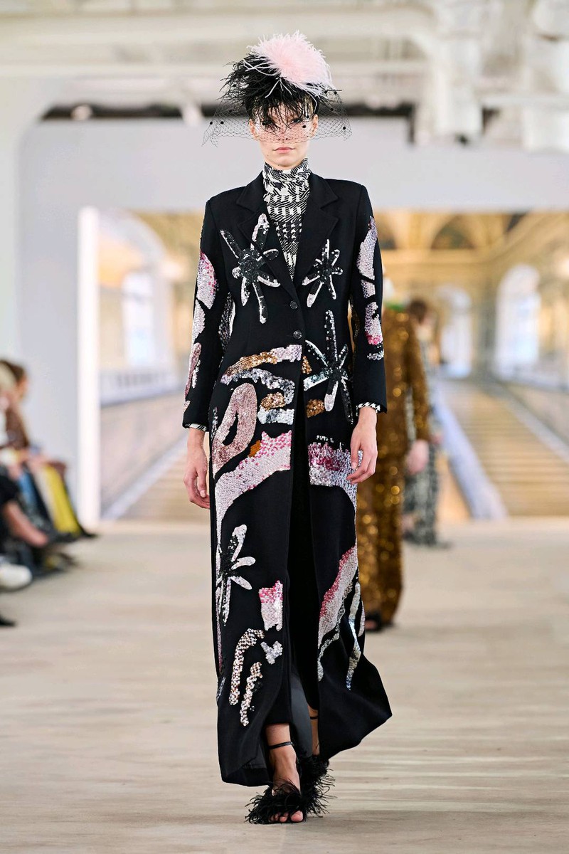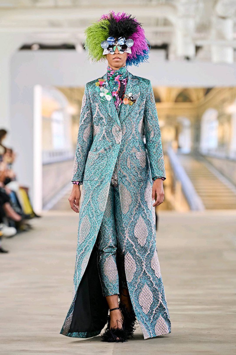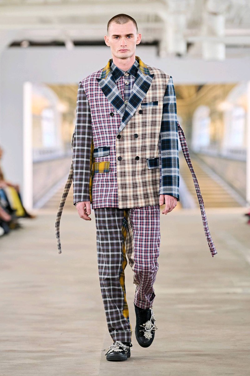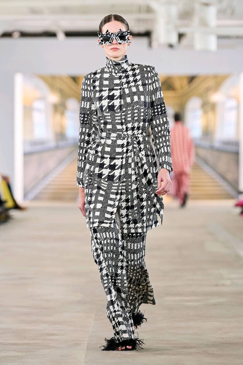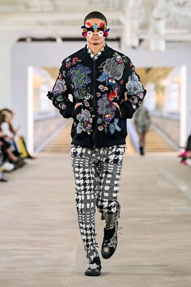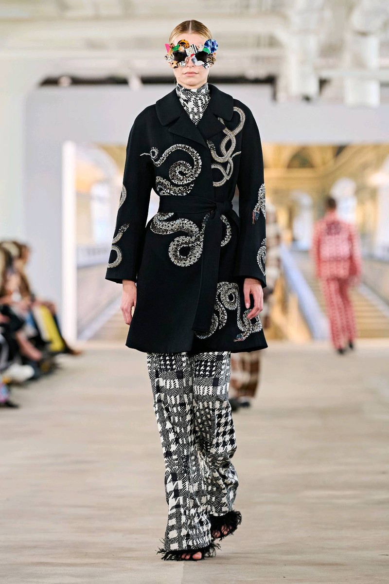 Libertine秋冬 2024 高级成衣各类主题元素拼接,各类风格集合到大衣中几何为基底叠加各色菱形格与彩色数字字母涂鸦风格趣味性十足毛线组成的各种类狗狗在条纹格上错落有致的排布大小千鸟格的经典纹样与蛇纹还有传统绣花搭配的成套混搭独特