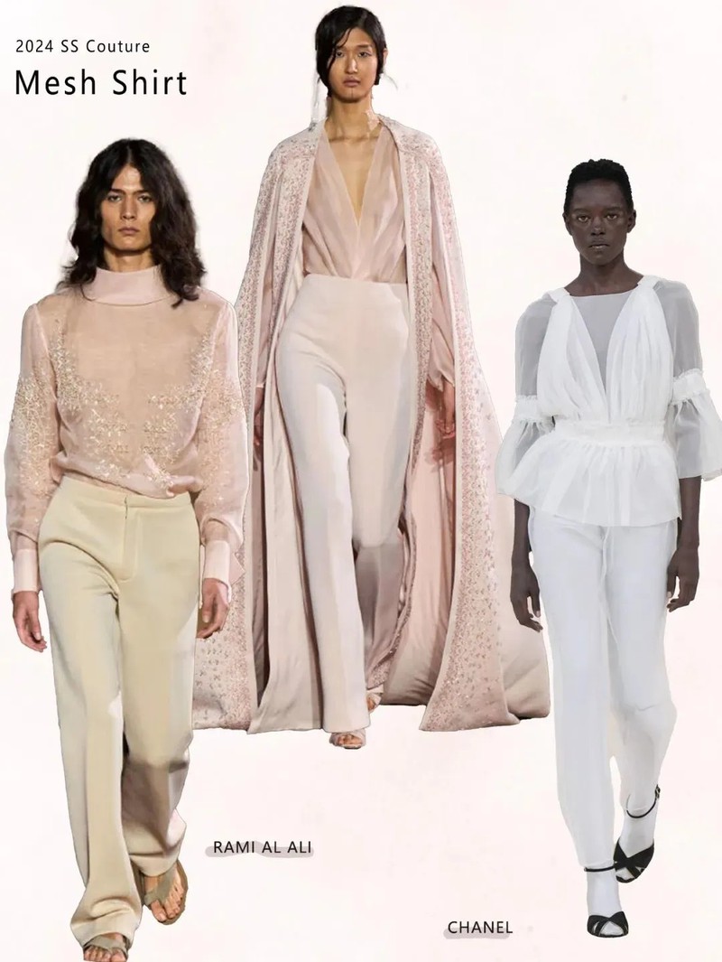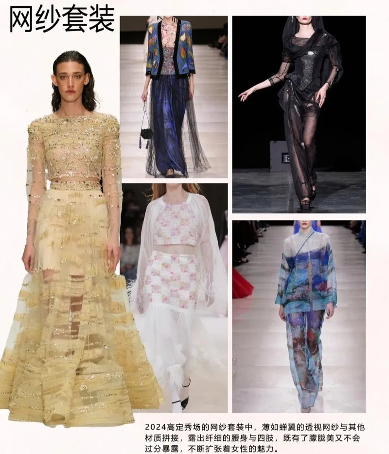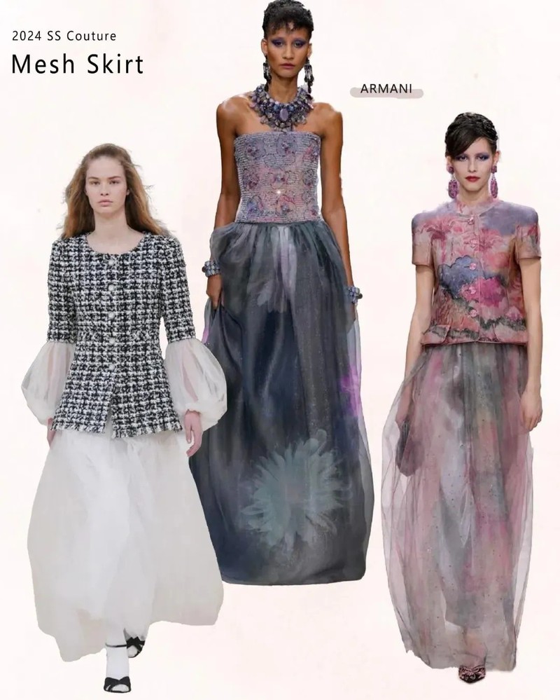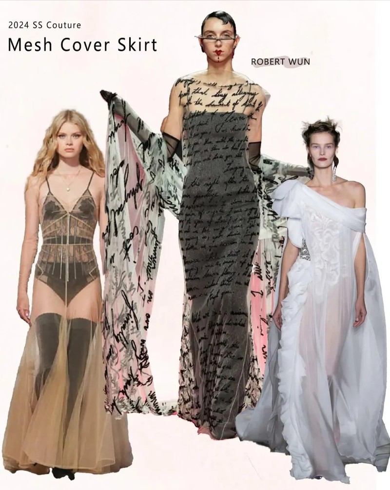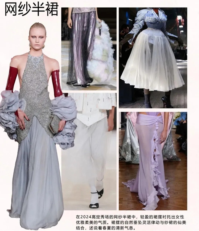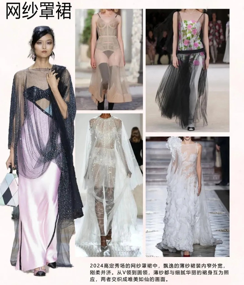 朦胧透视的薄纱层层塑造出极具想象力的设计。薄纱或轻盈,或挺括,娓娓续写的缥缈浪漫不断在褶间荡漾开来。