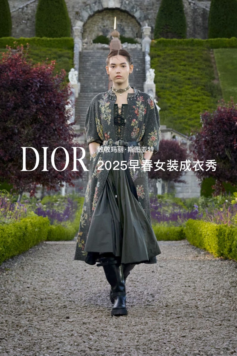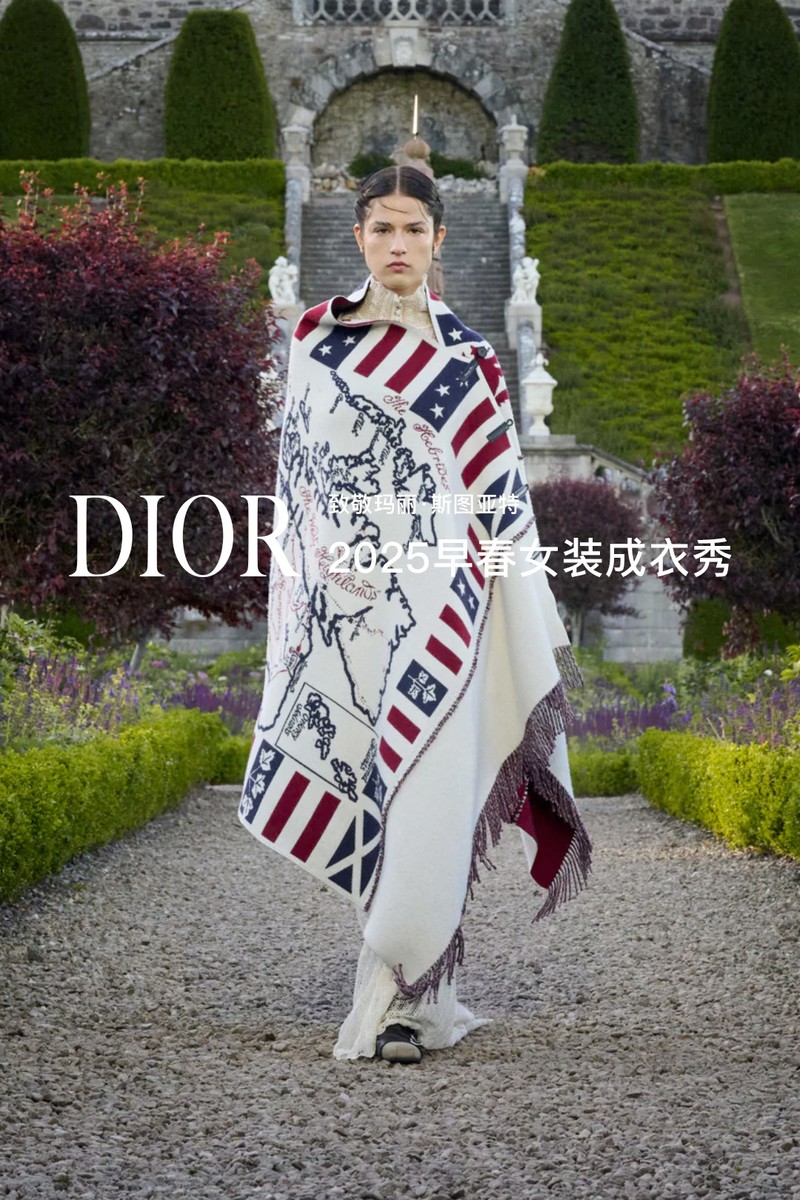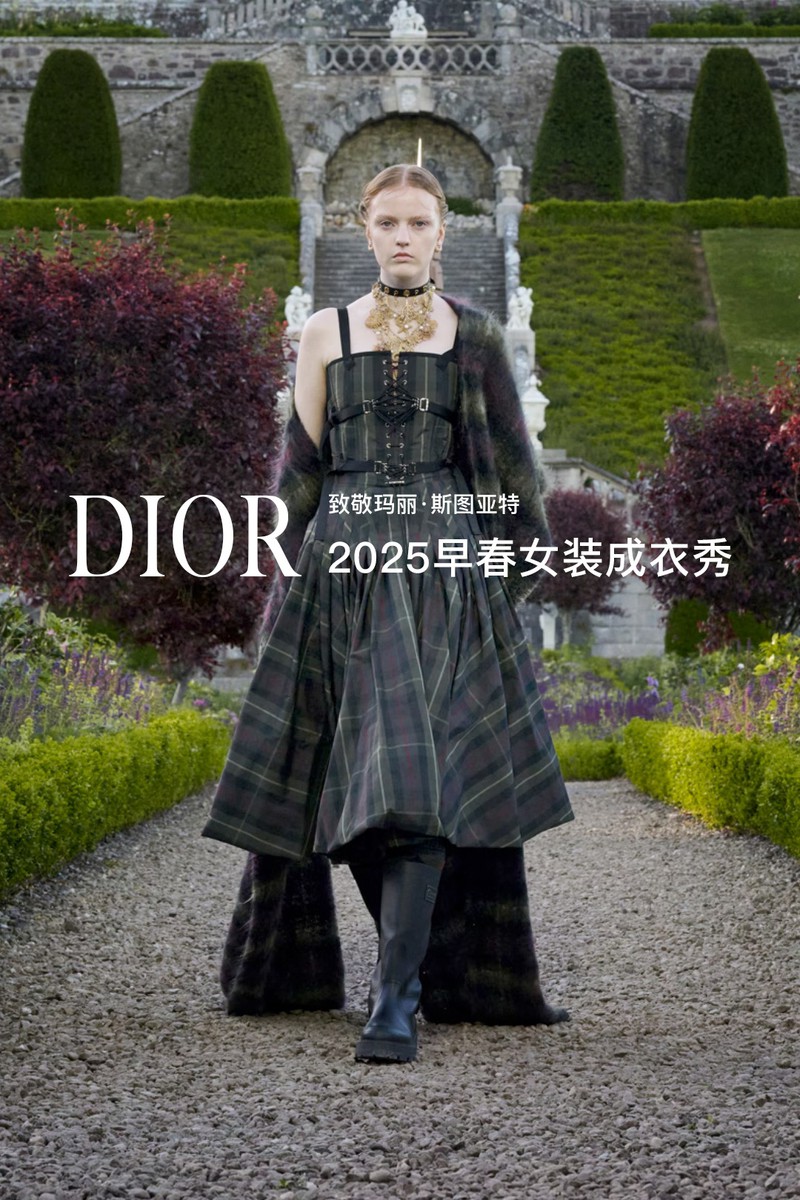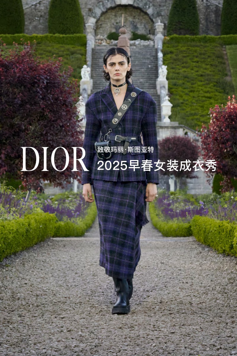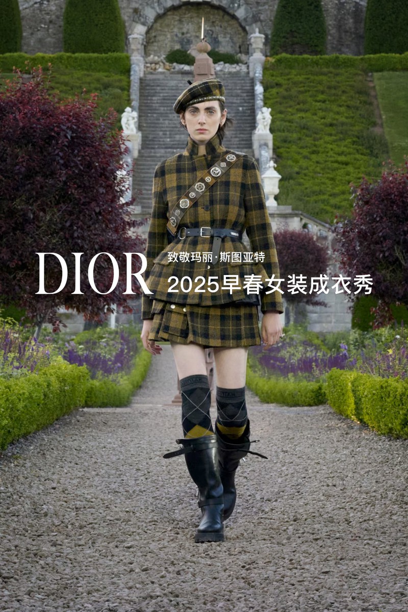 DIOR 2025早春女装成衣秀。全新系列采用苏格兰特有的纹章刺绣工艺打造全新万千繁花(MILLEFLEURS)图案,并以独角兽与蓟花等苏格兰象征符号,呈献这一精湛卓绝的技艺语言。作为本季系列的灵感来源地,手绘的苏格兰地图映现于多款造型之上,以地域版图生动勾勒出合作对话与文化交流,致敬了苏格兰格呢这一重要面料。