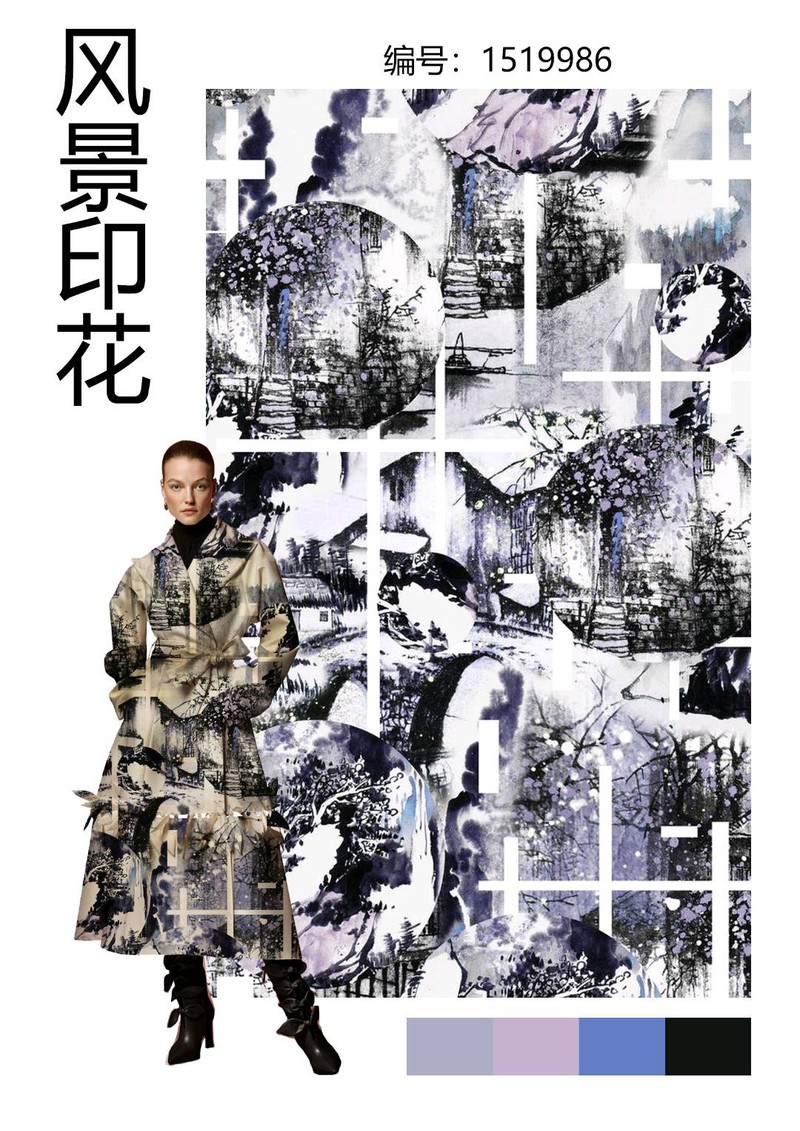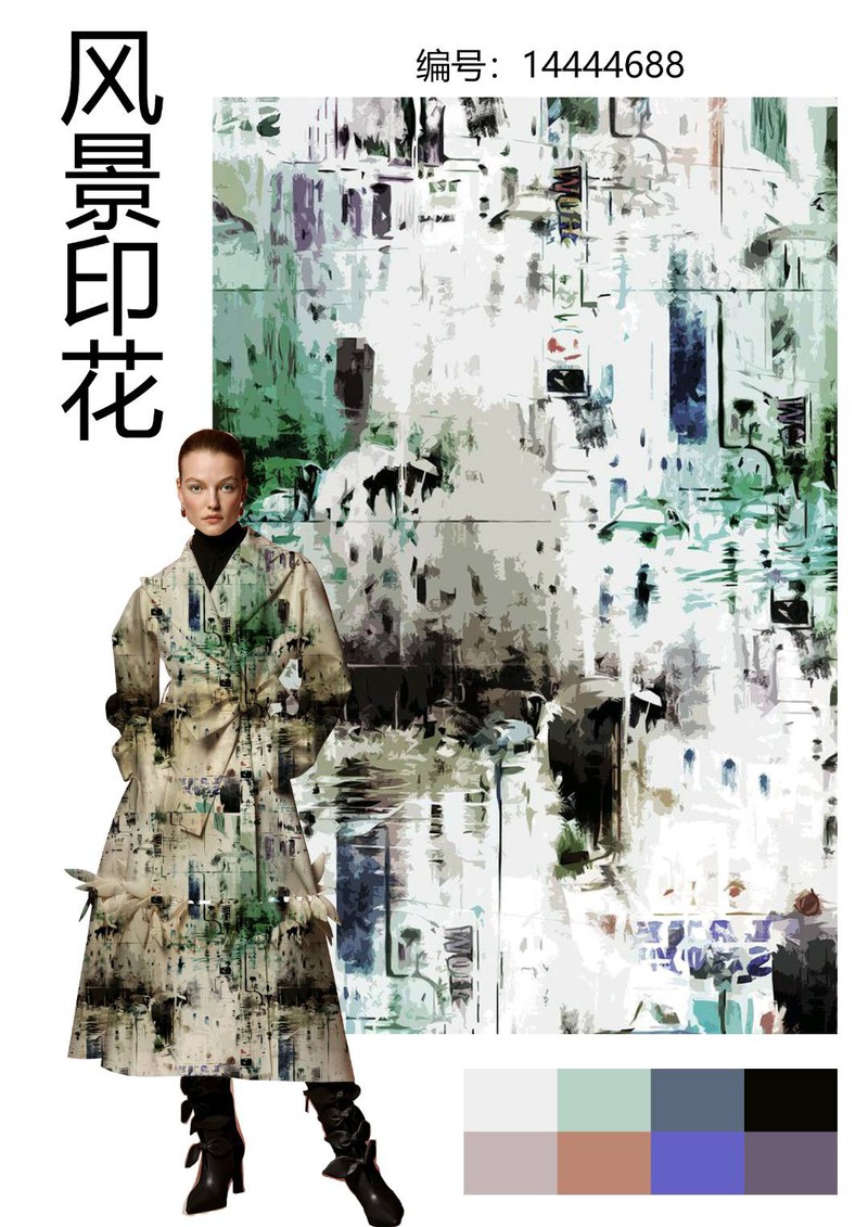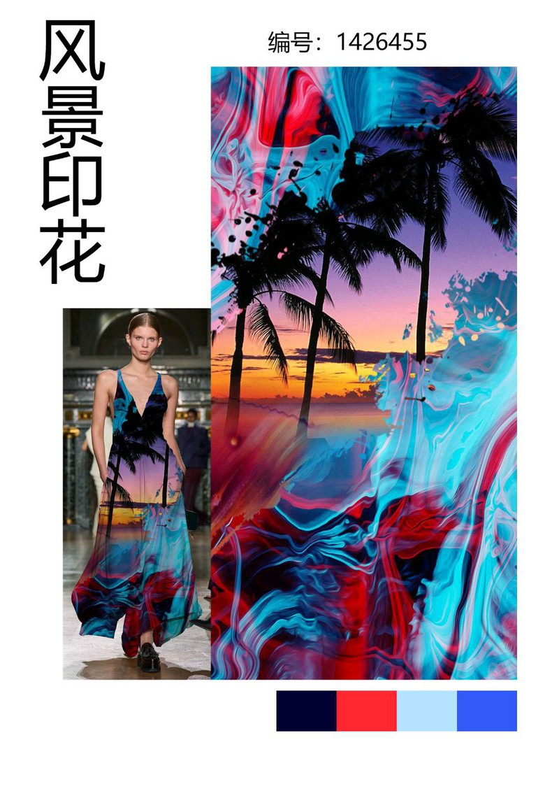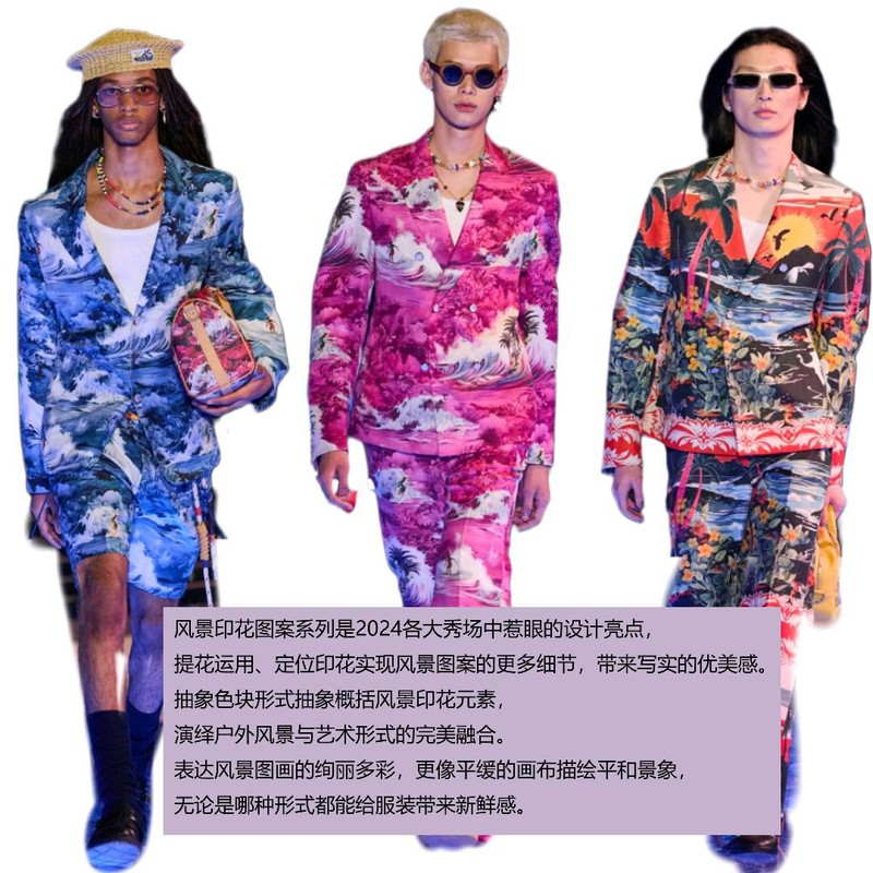 风景印花图案系列是2024各大秀场中惹眼的设计亮点,提花运用、定位印花实现风景图案的更多细节,带来写实的优美感。抽象色块形式抽象概括风景印花元素,演绎户外风景与艺术形式的完美融合。表达风景图画的绚丽多彩,更像平缓的画布描绘平和景象,无论是哪种形式都能给服装带来新鲜感。