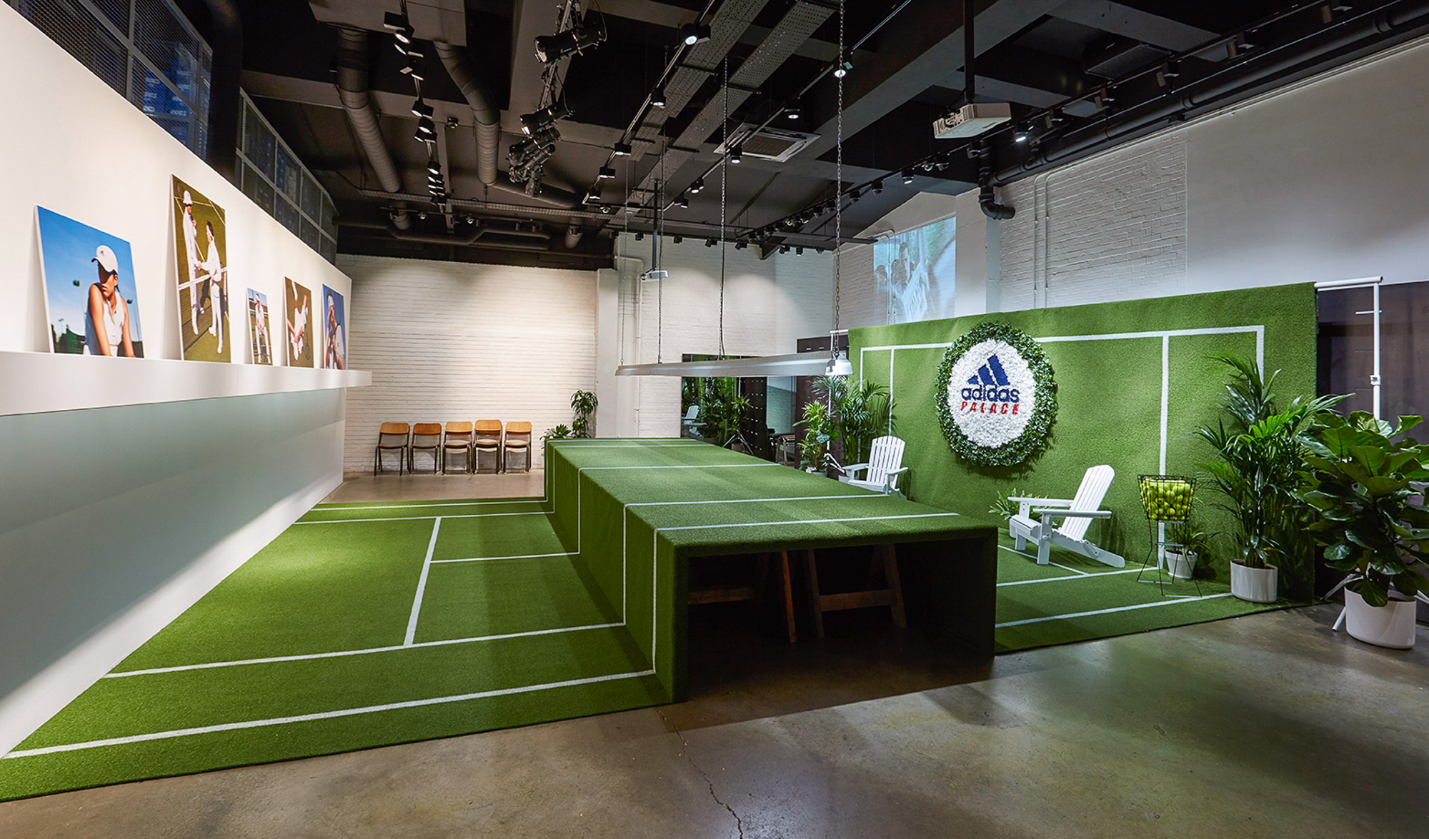滑板品牌Palace与阿迪达斯最新的合作款是具有上世纪70年代风格的一款限定系列,以此来庆祝即将开赛的温布尔登网球锦标赛。由Studio Xag设计的装置作品,将温布尔登中央球场搬到了阿迪达斯的Hanbury Street商店中。阿斯特罗人造草皮覆盖的墙壁环绕着一个展示台,受温布尔登花圃启发的花冠配备了帆布躺椅、沁人心脾的绿色植物和球篮。