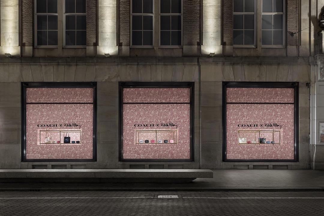 Coach与艺术家Keith Haring合作设计的特别版系列在阿姆斯特丹比杰科夫百货商场展出。由Coach设计,由Harlequin生产和安装的橱窗广告中,Keith Haring的标志性画作贯穿始终。金色的脚手环绕着两个3米高的LED显示屏,此外,还用支撑架来展示包品,电镀的金色桌子也被当成了附加的展示装置。