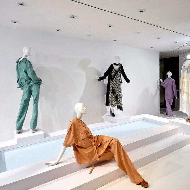 尽管商业街上的很多零售商都喜欢在泳池边设置一些有趣的场景,里面堆满了粗劣的小道具和廉价漂浮物,但一种娴雅的极简主义潮流正在奢侈品界兴起。Joseph和Harlequin共同设计了这个即清爽又时尚的泳池+T型台装置。人体模特栖息在独立的基座上,或懒洋洋地躺卧在池边的台阶上。
