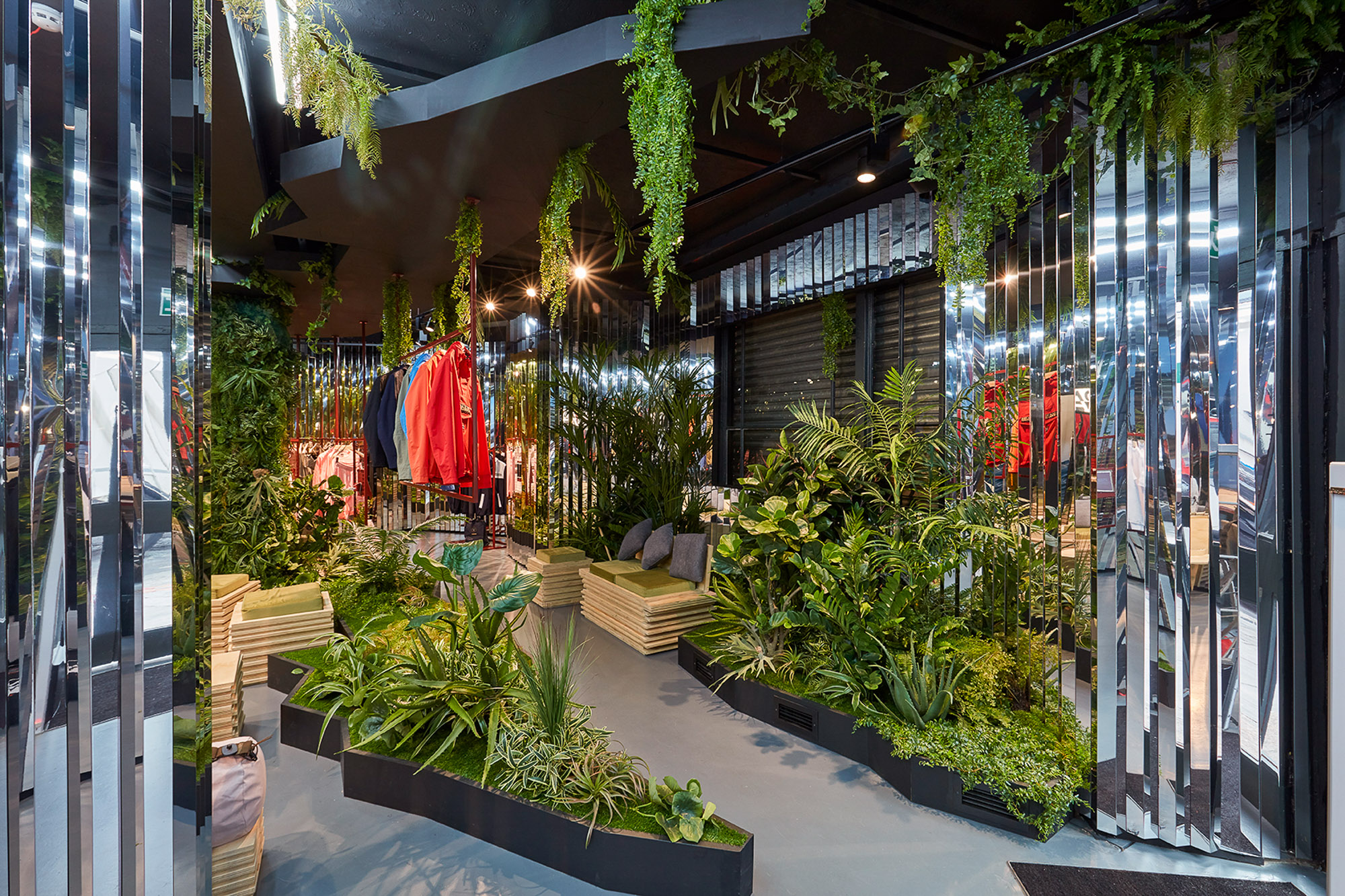 Studio Xag受品牌Napapijri的热带雨林外套的启发,为Napapijri在英国设计了一间概念性商店,该商店以社交花园空间为特色,顾客可以在里面停歇。这间小店的四周贴着波浪状的明镜铬,可以让人产生空间错觉感,同时又与植物形成鲜明的对比。这些墙依照不同的角度布局,顾客在店里来回走动时,会提升他们兴趣和动力。
