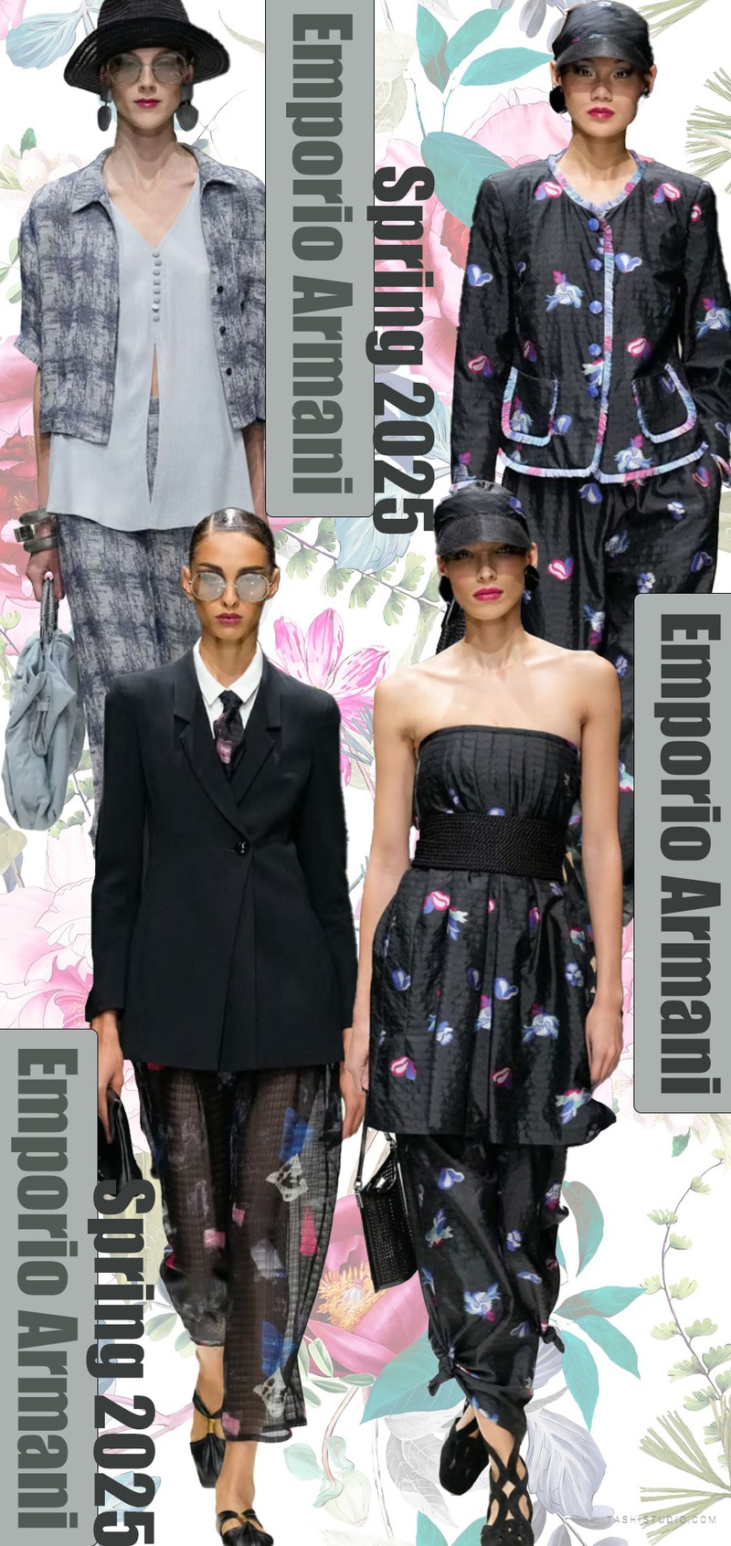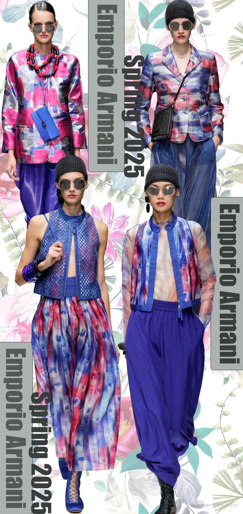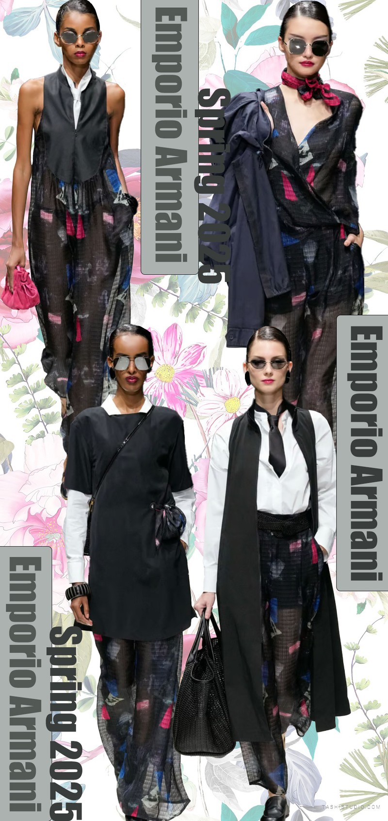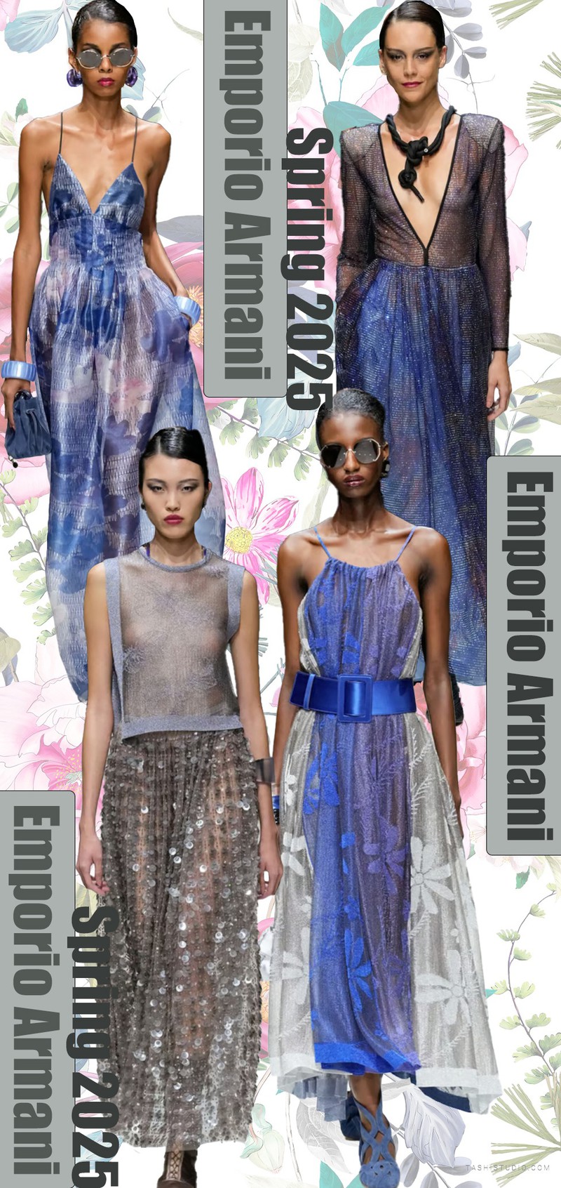 Emporio Armani Spring 2025斑斓的色块在黑色纱裙上散落,整体套装深蓝色基调上渐变的蓝色肌理色块在白色底上分散,缤纷的色彩与经典的英伦风格成为系列中的对比