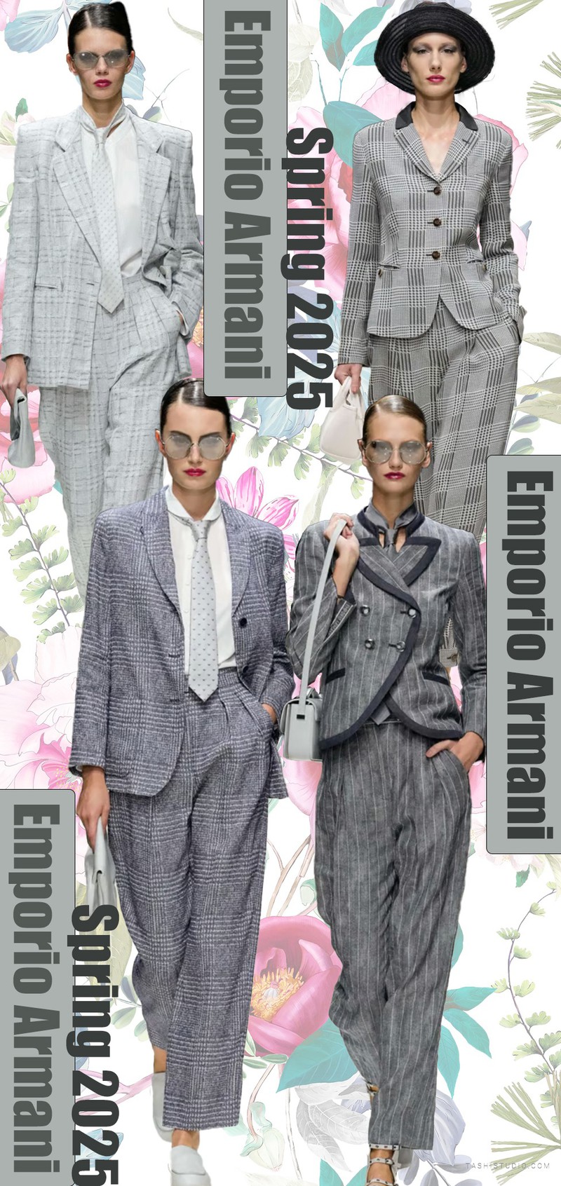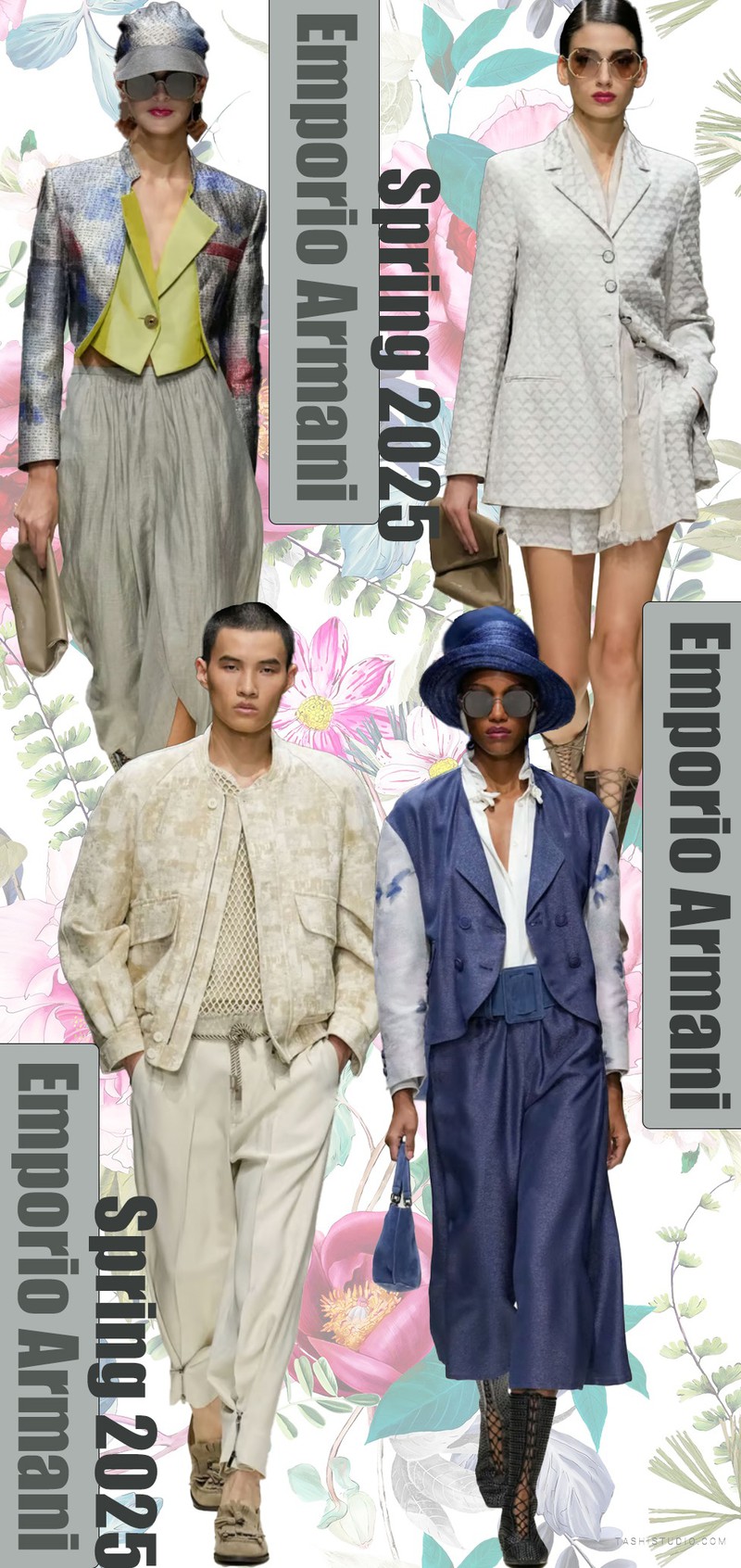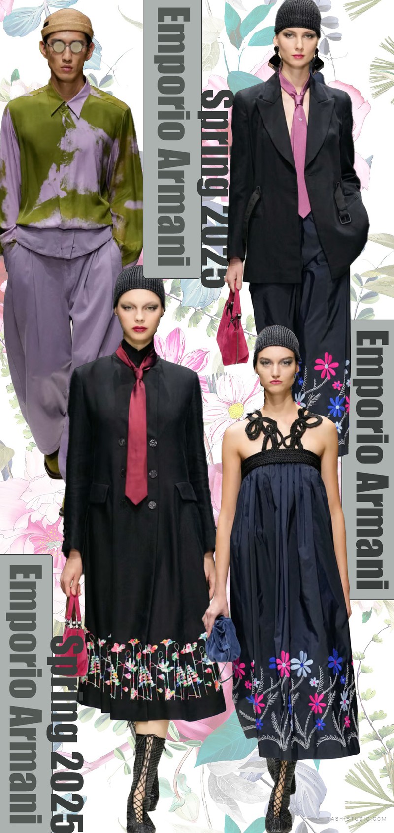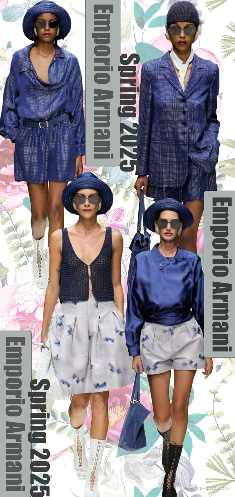 Emporio Armani Spring 2025斑斓的色块在黑色纱裙上散落,整体套装深蓝色基调上渐变的蓝色肌理色块在白色底上分散,缤纷的色彩与经典的英伦风格成为系列中的对比